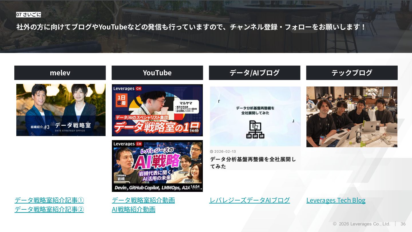 36 © 2026 Leverages Co., Ltd. 社外の⽅に向けてブログやYouTubeなどの発信も⾏っていますので、チャンネル登録‧フォローをお願いします! 07 さいごに melev