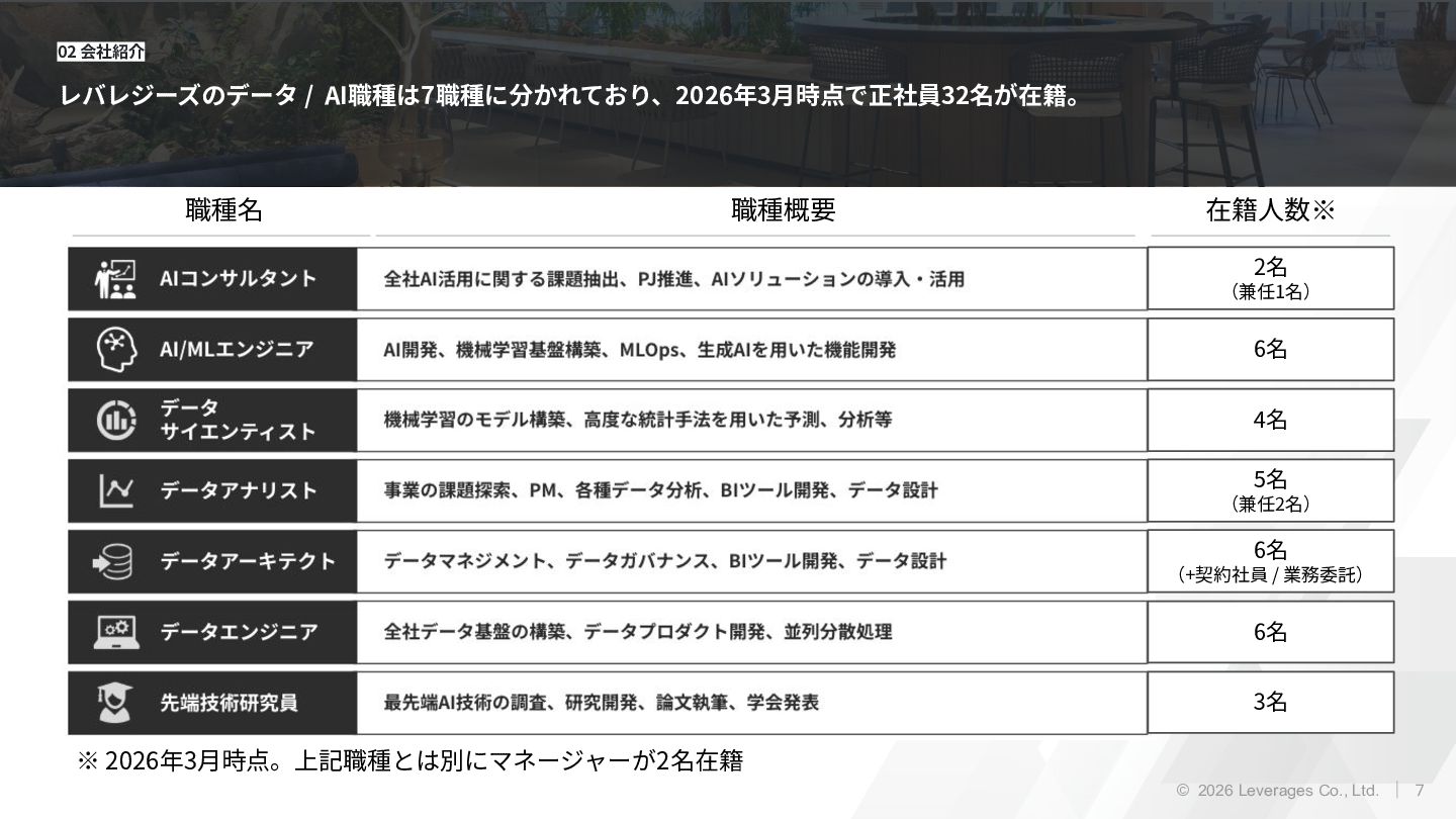 7 © 2026 Leverages Co., Ltd. レバレジーズのデータ / AI職種は7職種に分かれており、2026年3⽉時点で正社員32名が在籍。 02