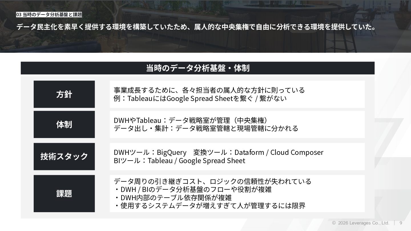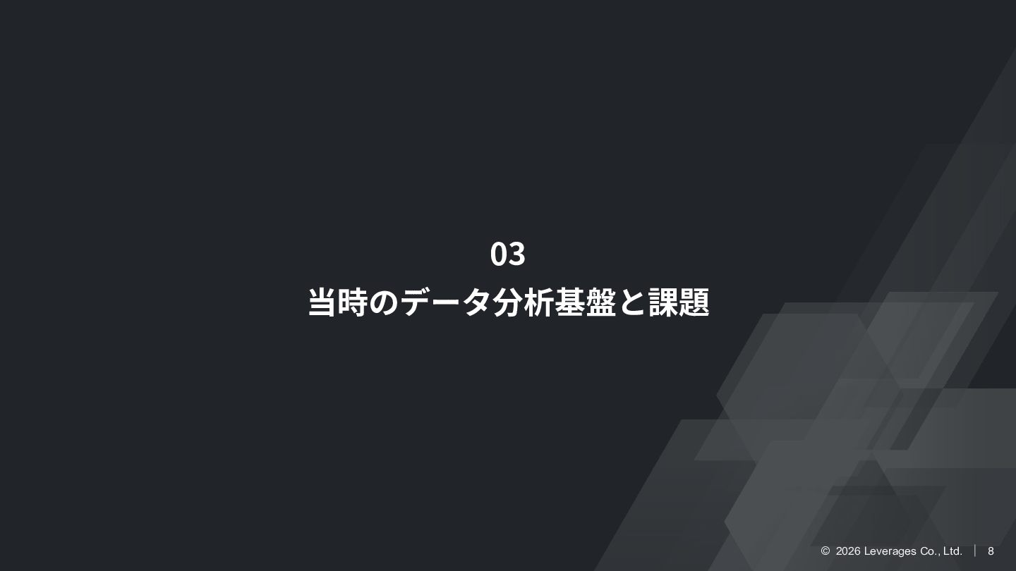 8 © 2026 Leverages Co., Ltd. 当時のデータ分析基盤と課題 03