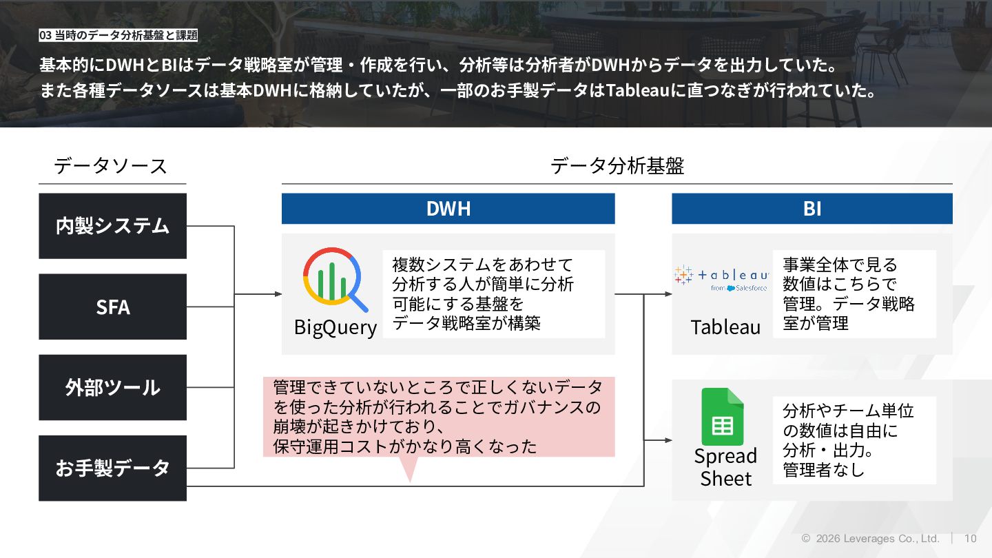 10 © 2026 Leverages Co., Ltd. 基本的にDWHとBIはデータ戦略室が管理‧作成を⾏い、分析等は分析者がDWHからデータを出⼒していた。 また各種データソースは基本DWHに格納していたが、⼀部のお⼿製データはTableauに直つなぎが⾏われていた。 03 当時のデータ分析基盤と課題