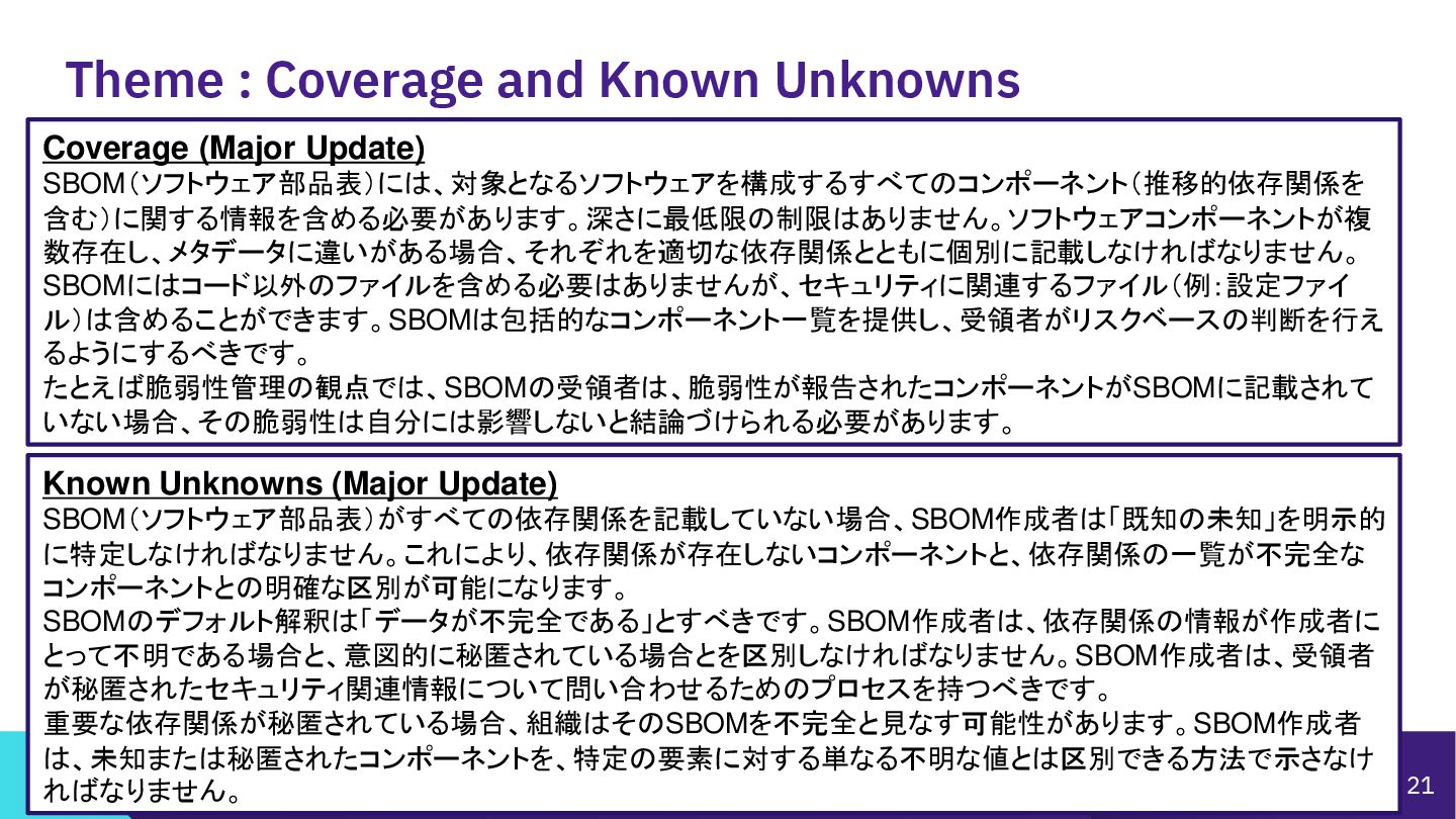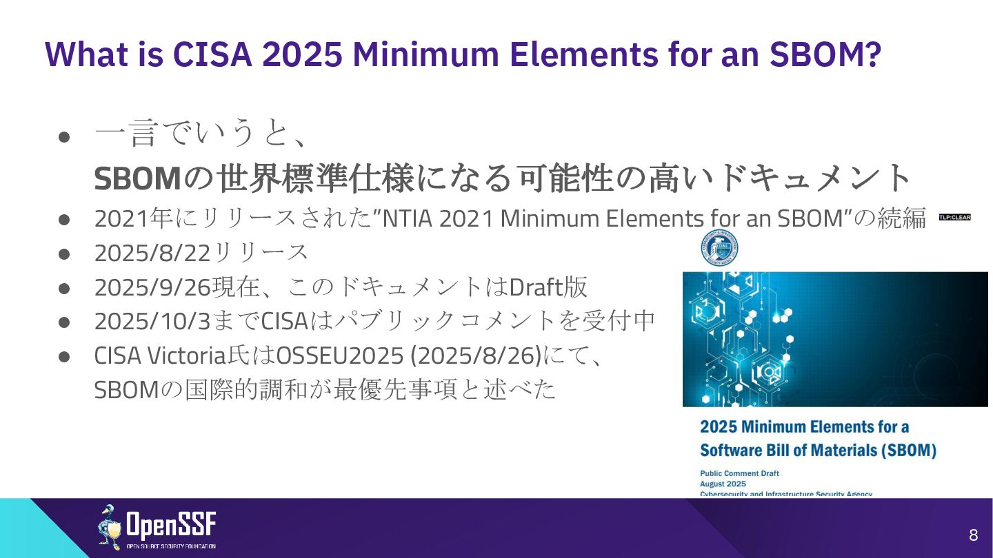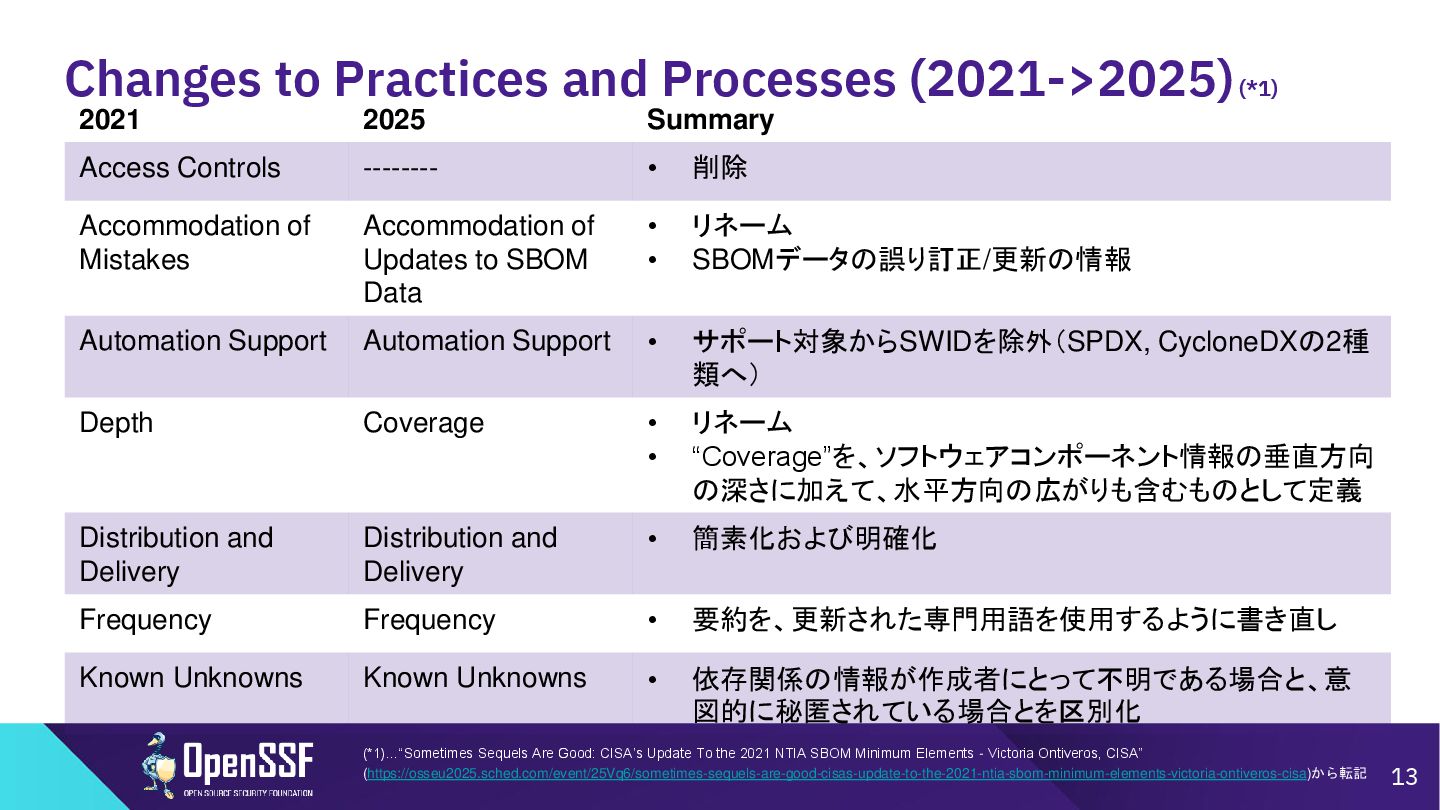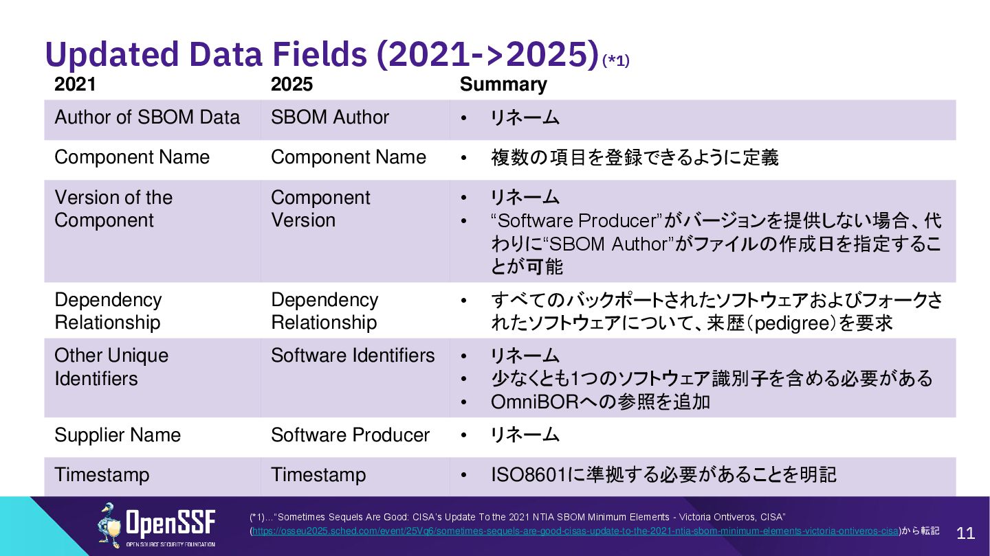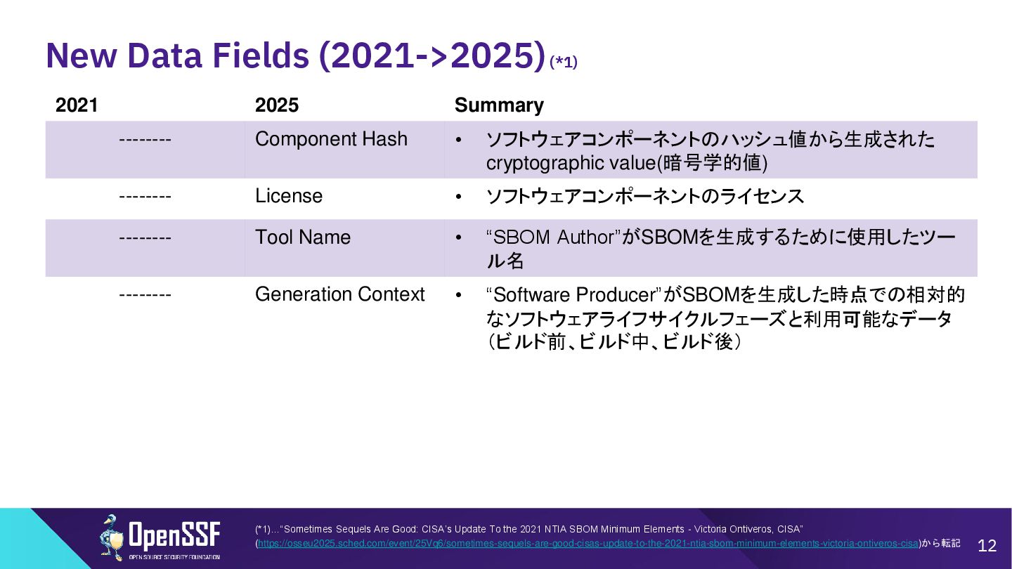 Access Controls -------- • 削除 Accommodation of Mistakes Accommodation of Updates to SBOM Data • リネーム • SBOMデータの誤り訂正/更新の情報 Automation Support Automation Support • サポート対象からSWIDを除外(SPDX, CycloneDXの2種 類へ) Depth Coverage • リネーム • “Coverage”を、ソフトウェアコンポーネント情報の垂直方向 の深さに加えて、水平方向の広がりも含むものとして定義 Distribution and Delivery Distribution and Delivery • 簡素化および明確化 Frequency Frequency • 要約を、更新された専門用語を使用するように書き直し Known Unknowns Known Unknowns • 依存関係の情報が作成者にとって不明である場合と、意 図的に秘匿されている場合とを区別化 (*1)…“Sometimes Sequels Are Good: CISA’s Update To the 2021 NTIA SBOM Minimum Elements - Victoria Ontiveros, CISA” (https://osseu2025.sched.com/event/25Vq6/sometimes-sequels-are-good-cisas-update-to-the-2021-ntia-sbom-minimum-elements-victoria-ontiveros-cisa)から転記