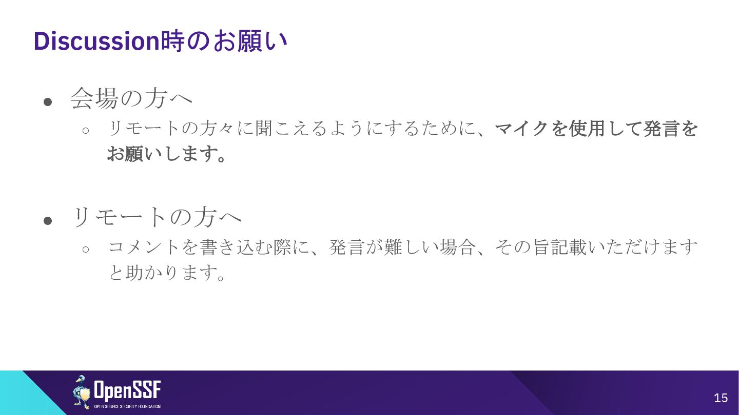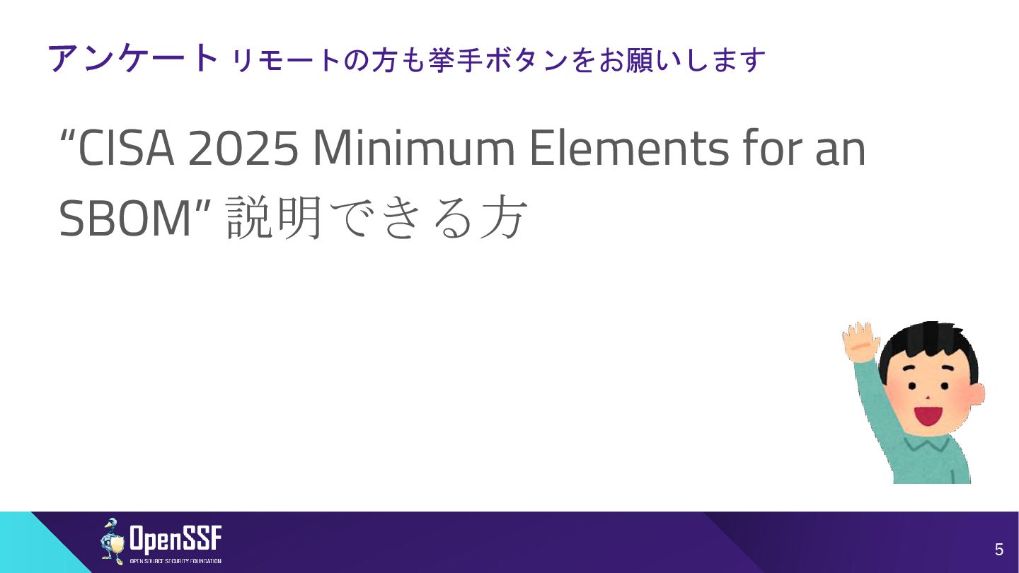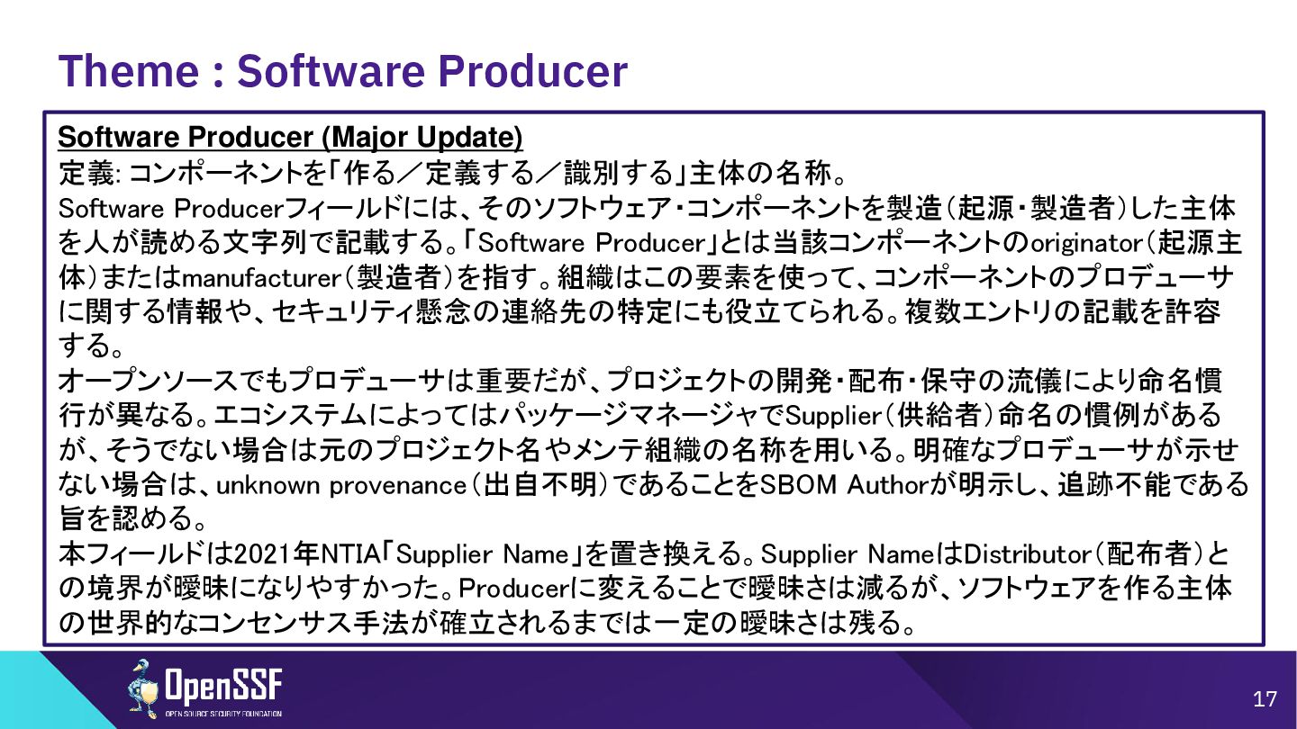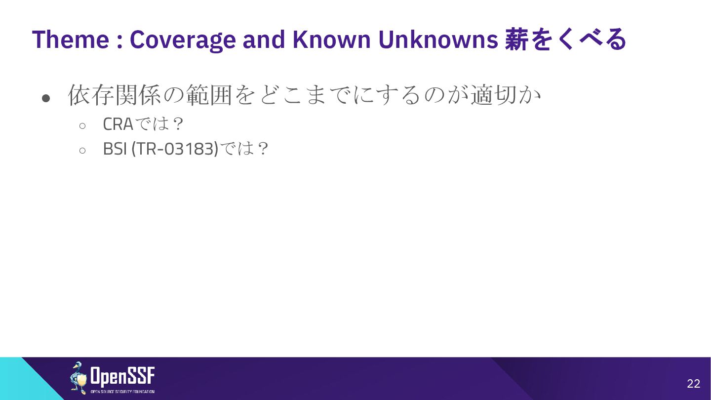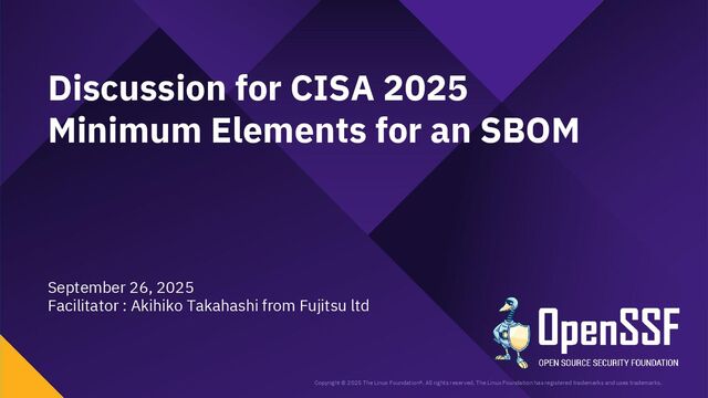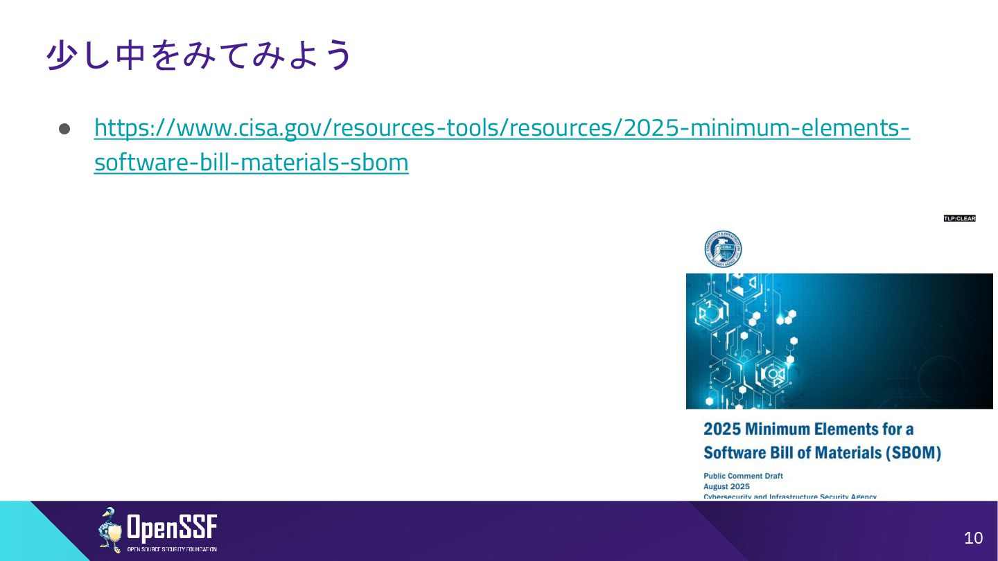 Access Controls -------- • 削除 Accommodation of Mistakes Accommodation of Updates to SBOM Data • リネーム • SBOMデータの誤り訂正/更新の情報 Automation Support Automation Support • サポート対象からSWIDを除外(SPDX, CycloneDXの2種 類へ) Depth Coverage • リネーム • “Coverage”を、ソフトウェアコンポーネント情報の垂直方向 の深さに加えて、水平方向の広がりも含むものとして定義 Distribution and Delivery Distribution and Delivery • 簡素化および明確化 Frequency Frequency • 要約を、更新された専門用語を使用するように書き直し Known Unknowns Known Unknowns • 依存関係の情報が作成者にとって不明である場合と、意 図的に秘匿されている場合とを区別化 (*1)…“Sometimes Sequels Are Good: CISA’s Update To the 2021 NTIA SBOM Minimum Elements - Victoria Ontiveros, CISA” (https://osseu2025.sched.com/event/25Vq6/sometimes-sequels-are-good-cisas-update-to-the-2021-ntia-sbom-minimum-elements-victoria-ontiveros-cisa)から転記