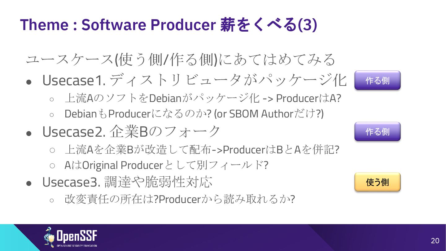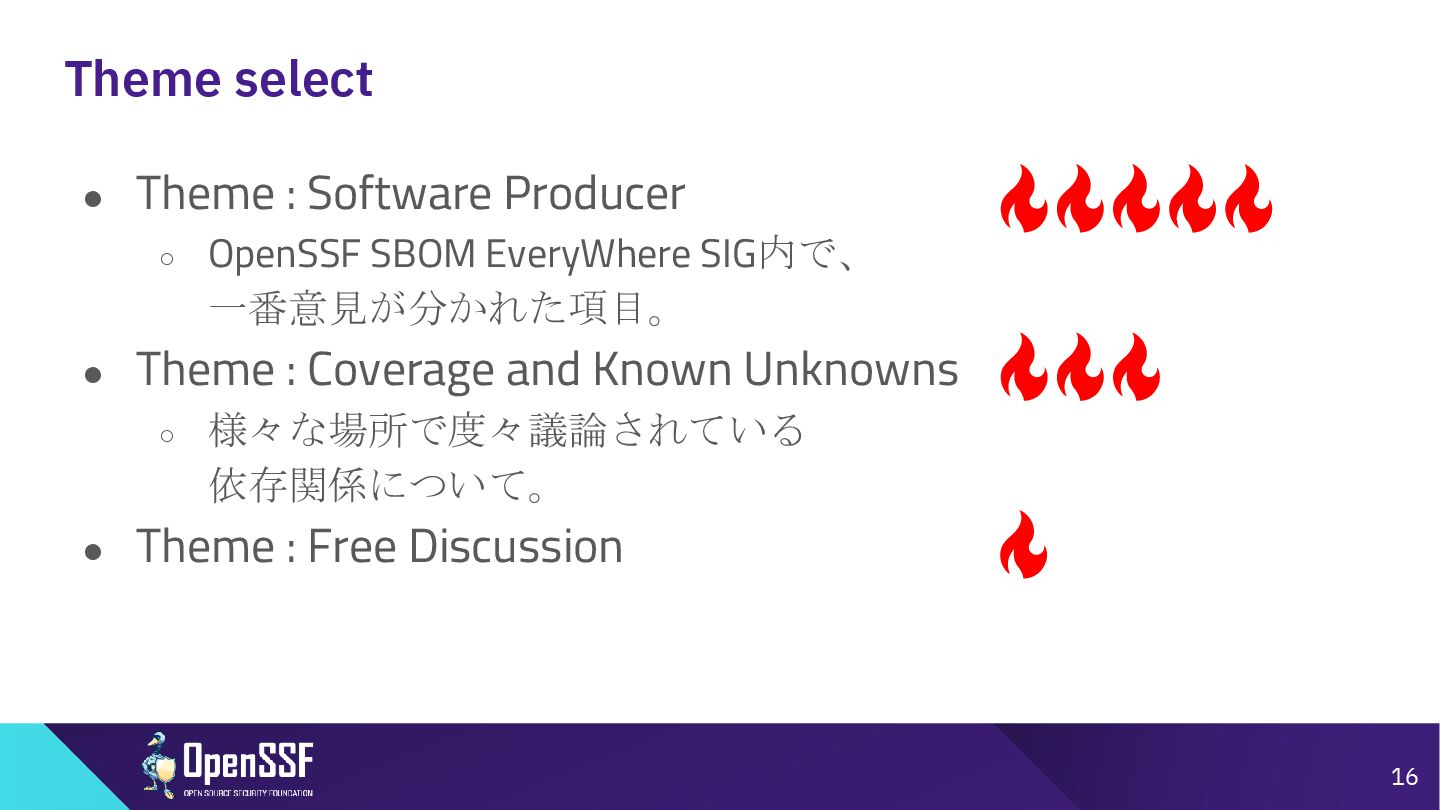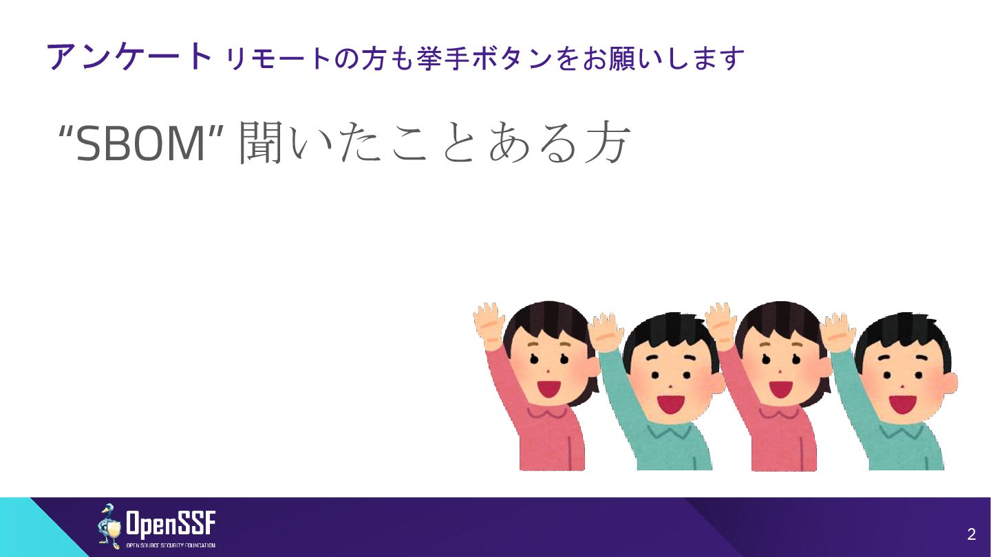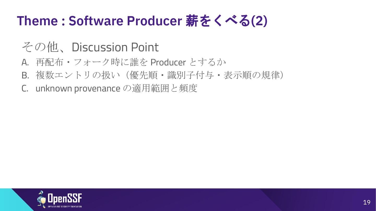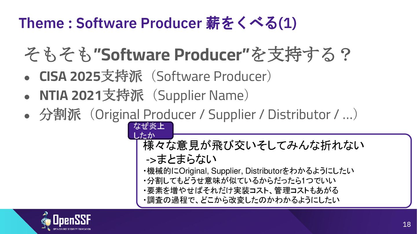 Access Controls -------- • 削除 Accommodation of Mistakes Accommodation of Updates to SBOM Data • リネーム • SBOMデータの誤り訂正/更新の情報 Automation Support Automation Support • サポート対象からSWIDを除外(SPDX, CycloneDXの2種 類へ) Depth Coverage • リネーム • “Coverage”を、ソフトウェアコンポーネント情報の垂直方向 の深さに加えて、水平方向の広がりも含むものとして定義 Distribution and Delivery Distribution and Delivery • 簡素化および明確化 Frequency Frequency • 要約を、更新された専門用語を使用するように書き直し Known Unknowns Known Unknowns • 依存関係の情報が作成者にとって不明である場合と、意 図的に秘匿されている場合とを区別化 (*1)…“Sometimes Sequels Are Good: CISA’s Update To the 2021 NTIA SBOM Minimum Elements - Victoria Ontiveros, CISA” (https://osseu2025.sched.com/event/25Vq6/sometimes-sequels-are-good-cisas-update-to-the-2021-ntia-sbom-minimum-elements-victoria-ontiveros-cisa)から転記