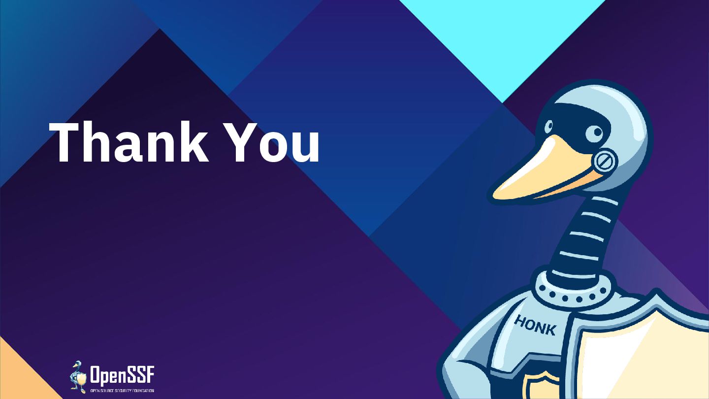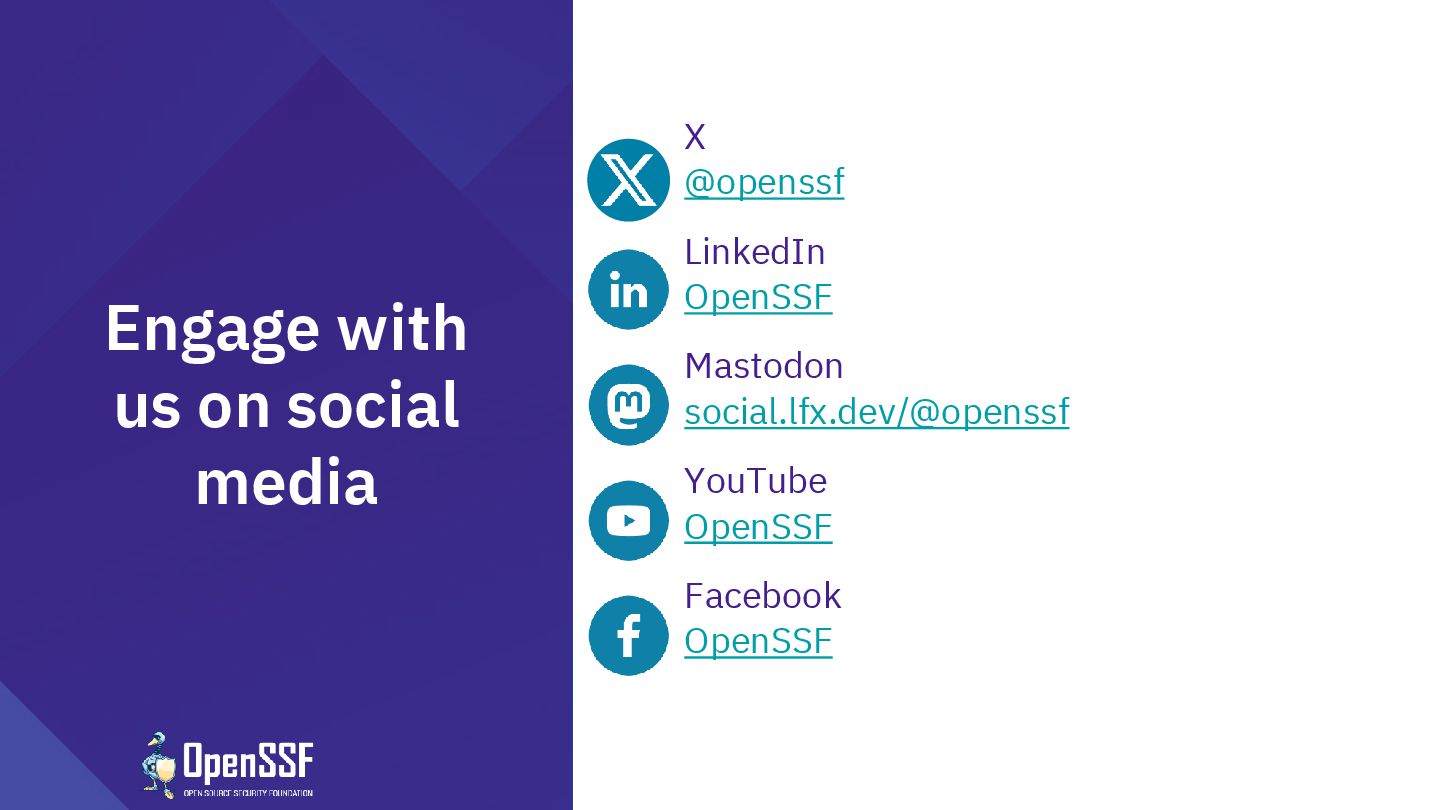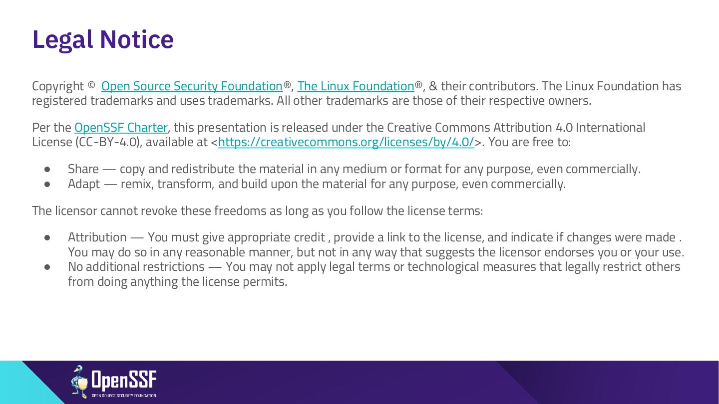 Foundation®, & their contributors. The Linux Foundation has registered trademarks and uses trademarks. All other trademarks are those of their respective owners. Per the OpenSSF Charter, this presentation is released under the Creative Commons Attribution 4.0 International License (CC-BY-4.0), available at <https://creativecommons.org/licenses/by/4.0/>. You are free to: • Share — copy and redistribute the material in any medium or format for any purpose, even commercially. • Adapt — remix, transform, and build upon the material for any purpose, even commercially. The licensor cannot revoke these freedoms as long as you follow the license terms: • Attribution — You must give appropriate credit , provide a link to the license, and indicate if changes were made . You may do so in any reasonable manner, but not in any way that suggests the licensor endorses you or your use. • No additional restrictions — You may not apply legal terms or technological measures that legally restrict others from doing anything the license permits.