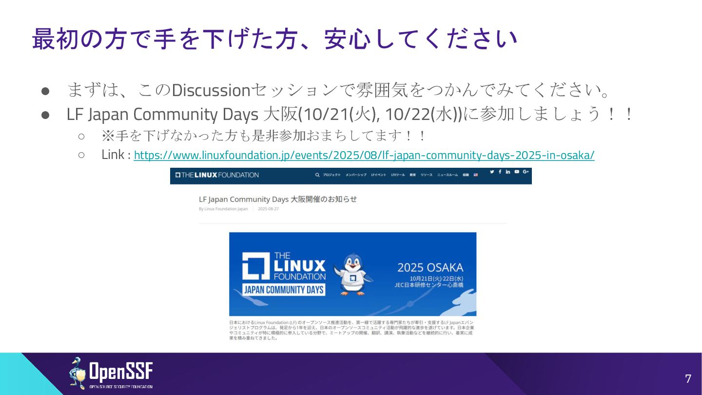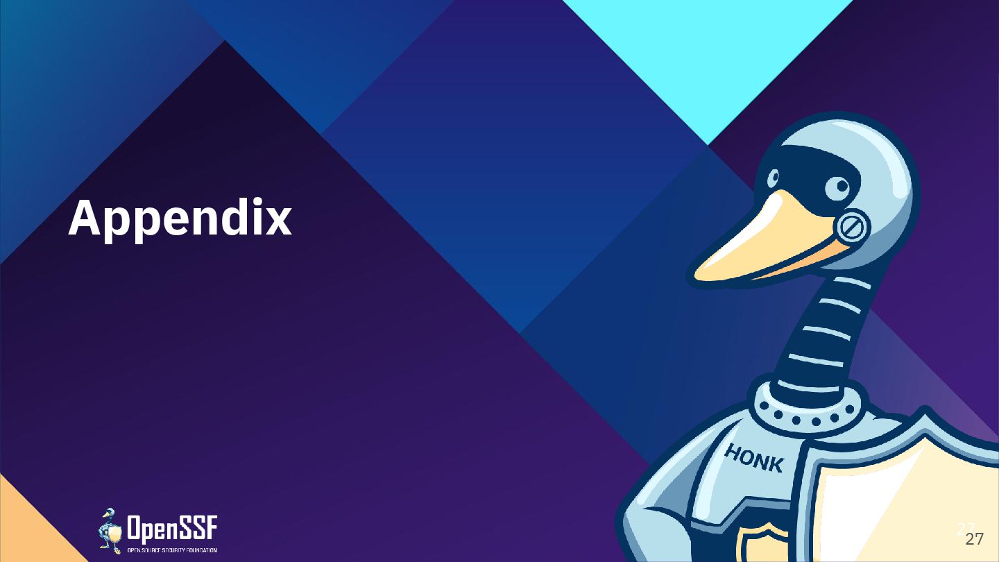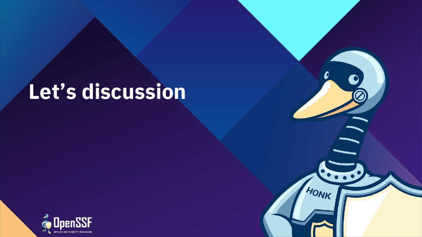 Foundation®, & their contributors. The Linux Foundation has registered trademarks and uses trademarks. All other trademarks are those of their respective owners. Per the OpenSSF Charter, this presentation is released under the Creative Commons Attribution 4.0 International License (CC-BY-4.0), available at <https://creativecommons.org/licenses/by/4.0/>. You are free to: • Share — copy and redistribute the material in any medium or format for any purpose, even commercially. • Adapt — remix, transform, and build upon the material for any purpose, even commercially. The licensor cannot revoke these freedoms as long as you follow the license terms: • Attribution — You must give appropriate credit , provide a link to the license, and indicate if changes were made . You may do so in any reasonable manner, but not in any way that suggests the licensor endorses you or your use. • No additional restrictions — You may not apply legal terms or technological measures that legally restrict others from doing anything the license permits.