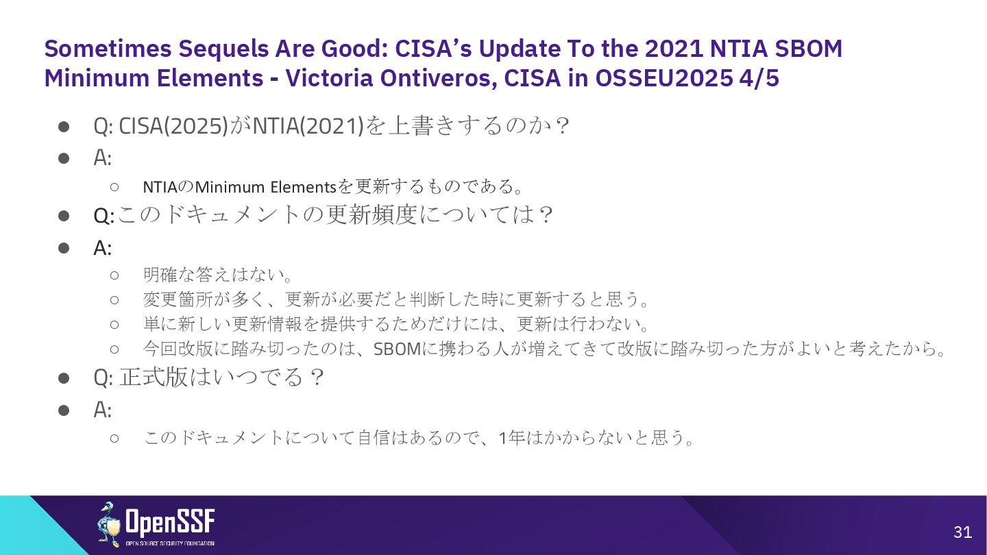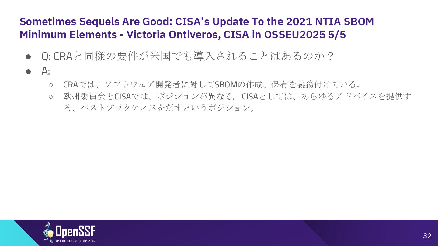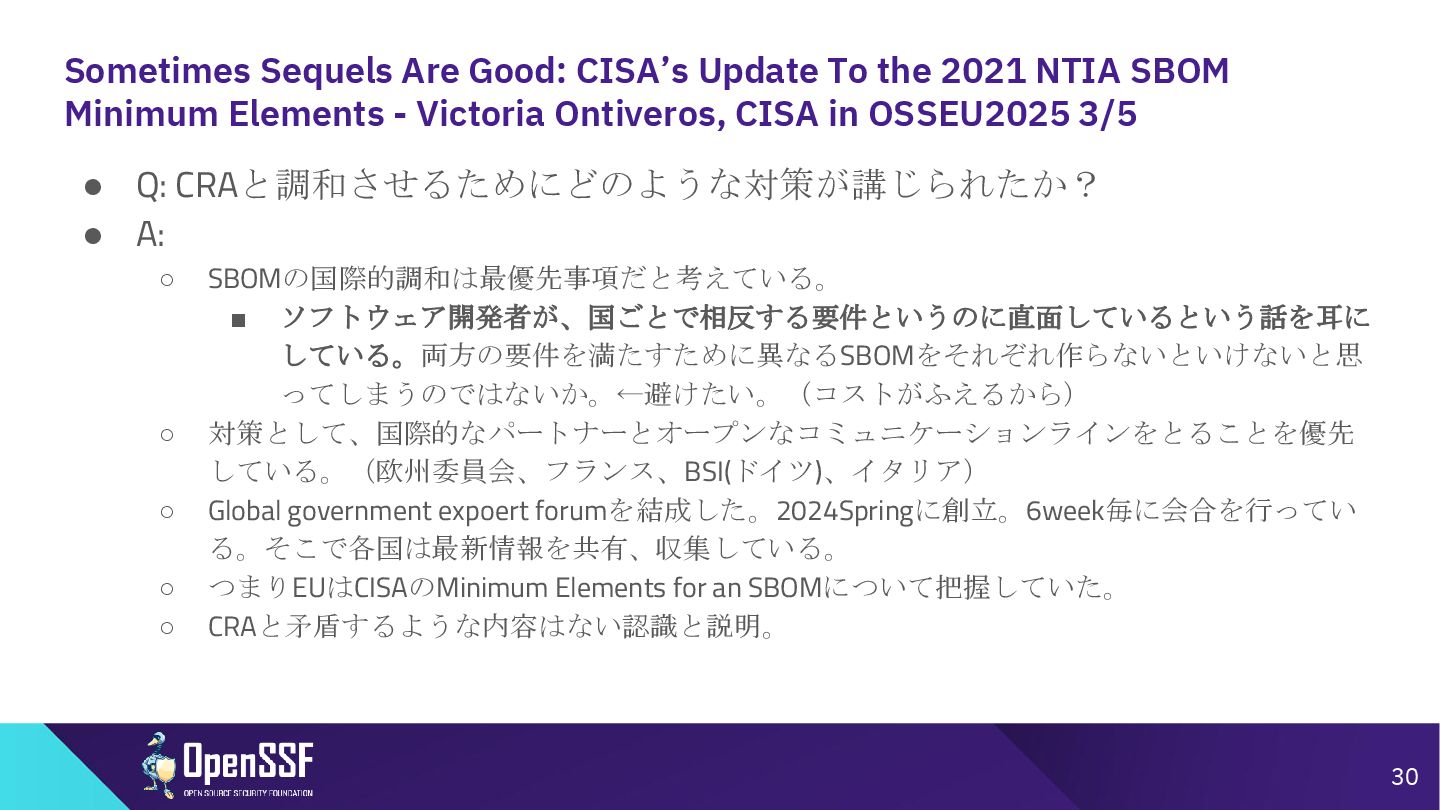 SBOM Minimum Elements - Victoria Ontiveros, CISA in OSSEU2025 3/5 • Q: CRAと調和させるためにどのような対策が講じられたか? • A: ◦ SBOMの国際的調和は最優先事項だと考えている。 ▪ ソフトウェア開発者が、国ごとで相反する要件というのに直面しているという話を耳に している。両方の要件を満たすために異なるSBOMをそれぞれ作らないといけないと思 ってしまうのではないか。←避けたい。(コストがふえるから) ◦ 対策として、国際的なパートナーとオープンなコミュニケーションラインをとることを優先 している。(欧州委員会、フランス、BSI(ドイツ)、イタリア) ◦ Global government expoert forumを結成した。2024Springに創立。6week毎に会合を行ってい る。そこで各国は最新情報を共有、収集している。 ◦ つまりEUはCISAのMinimum Elements for an SBOMについて把握していた。 ◦ CRAと矛盾するような内容はない認識と説明。 30