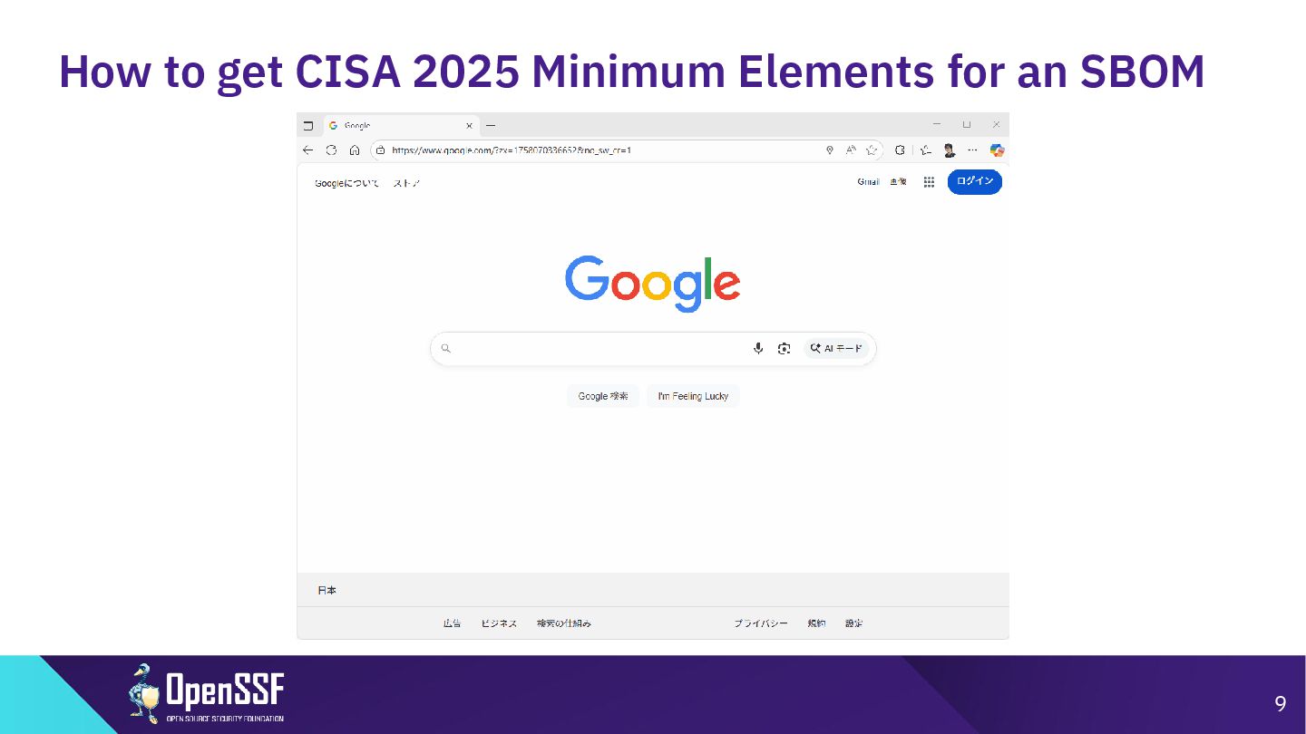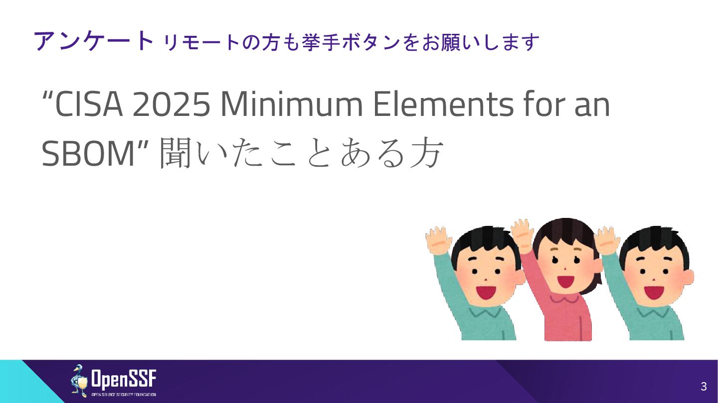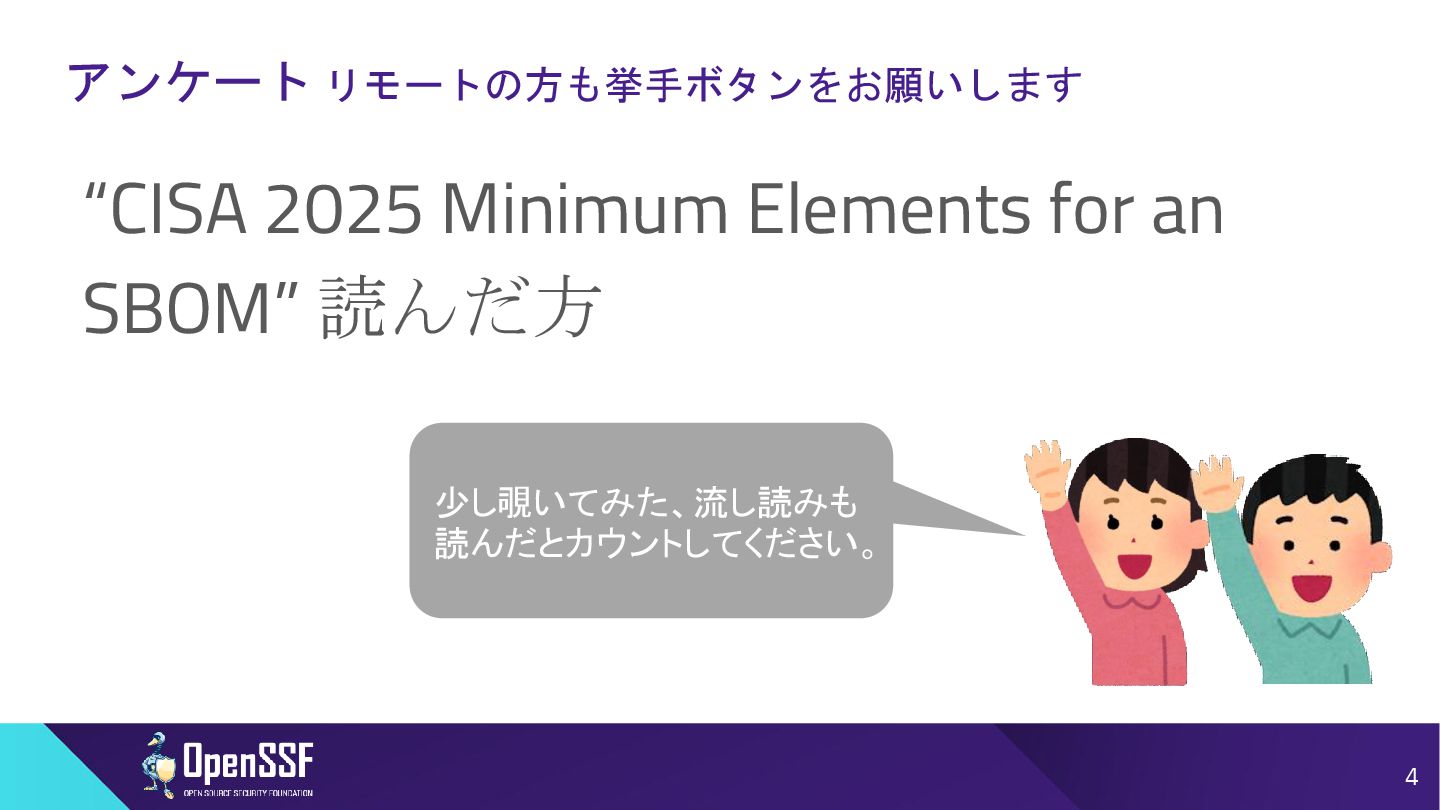 SBOM Minimum Elements - Victoria Ontiveros, CISA in OSSEU2025 3/5 • Q: CRAと調和させるためにどのような対策が講じられたか? • A: ◦ SBOMの国際的調和は最優先事項だと考えている。 ▪ ソフトウェア開発者が、国ごとで相反する要件というのに直面しているという話を耳に している。両方の要件を満たすために異なるSBOMをそれぞれ作らないといけないと思 ってしまうのではないか。←避けたい。(コストがふえるから) ◦ 対策として、国際的なパートナーとオープンなコミュニケーションラインをとることを優先 している。(欧州委員会、フランス、BSI(ドイツ)、イタリア) ◦ Global government expoert forumを結成した。2024Springに創立。6week毎に会合を行ってい る。そこで各国は最新情報を共有、収集している。 ◦ つまりEUはCISAのMinimum Elements for an SBOMについて把握していた。 ◦ CRAと矛盾するような内容はない認識と説明。 30