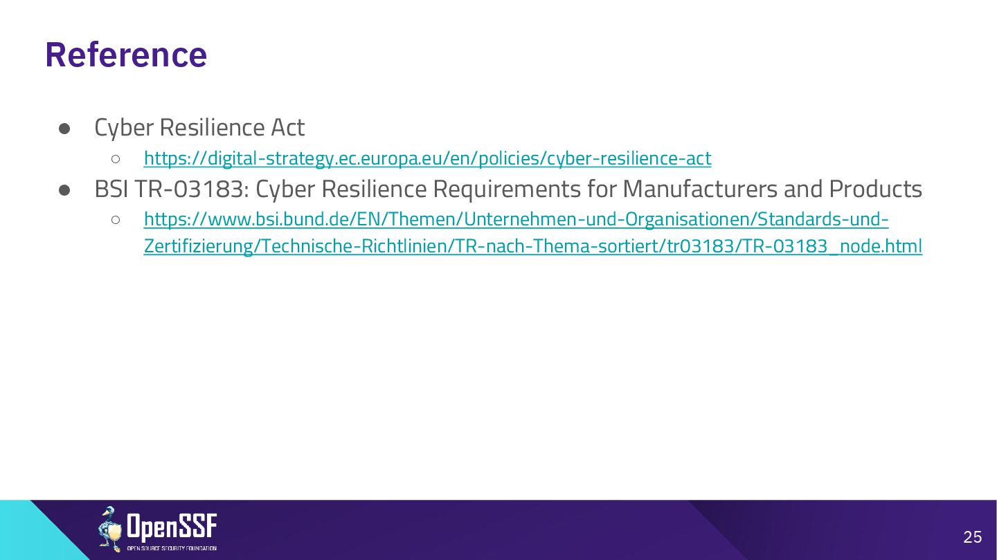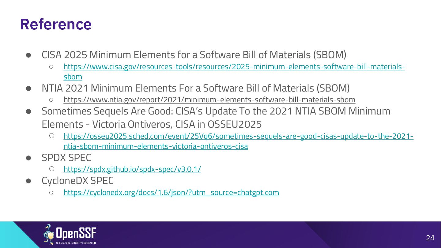 of Materials (SBOM) ◦ https://www.cisa.gov/resources-tools/resources/2025-minimum-elements-software-bill-materials- sbom • NTIA 2021 Minimum Elements For a Software Bill of Materials (SBOM) ◦ https://www.ntia.gov/report/2021/minimum-elements-software-bill-materials-sbom • Sometimes Sequels Are Good: CISA’s Update To the 2021 NTIA SBOM Minimum Elements - Victoria Ontiveros, CISA in OSSEU2025 ◦ https://osseu2025.sched.com/event/25Vq6/sometimes-sequels-are-good-cisas-update-to-the-2021- ntia-sbom-minimum-elements-victoria-ontiveros-cisa • SPDX SPEC ◦ https://spdx.github.io/spdx-spec/v3.0.1/ • CycloneDX SPEC ◦ https://cyclonedx.org/docs/1.6/json/?utm_source=chatgpt.com 24