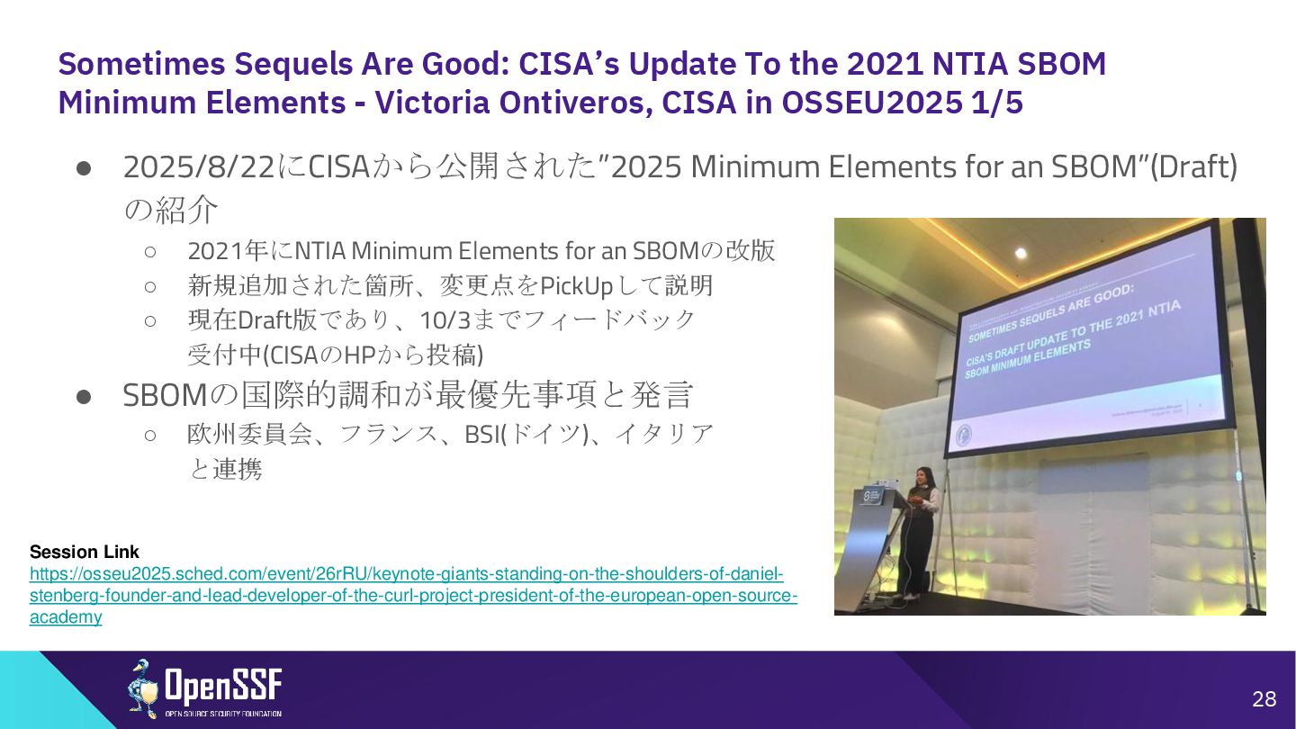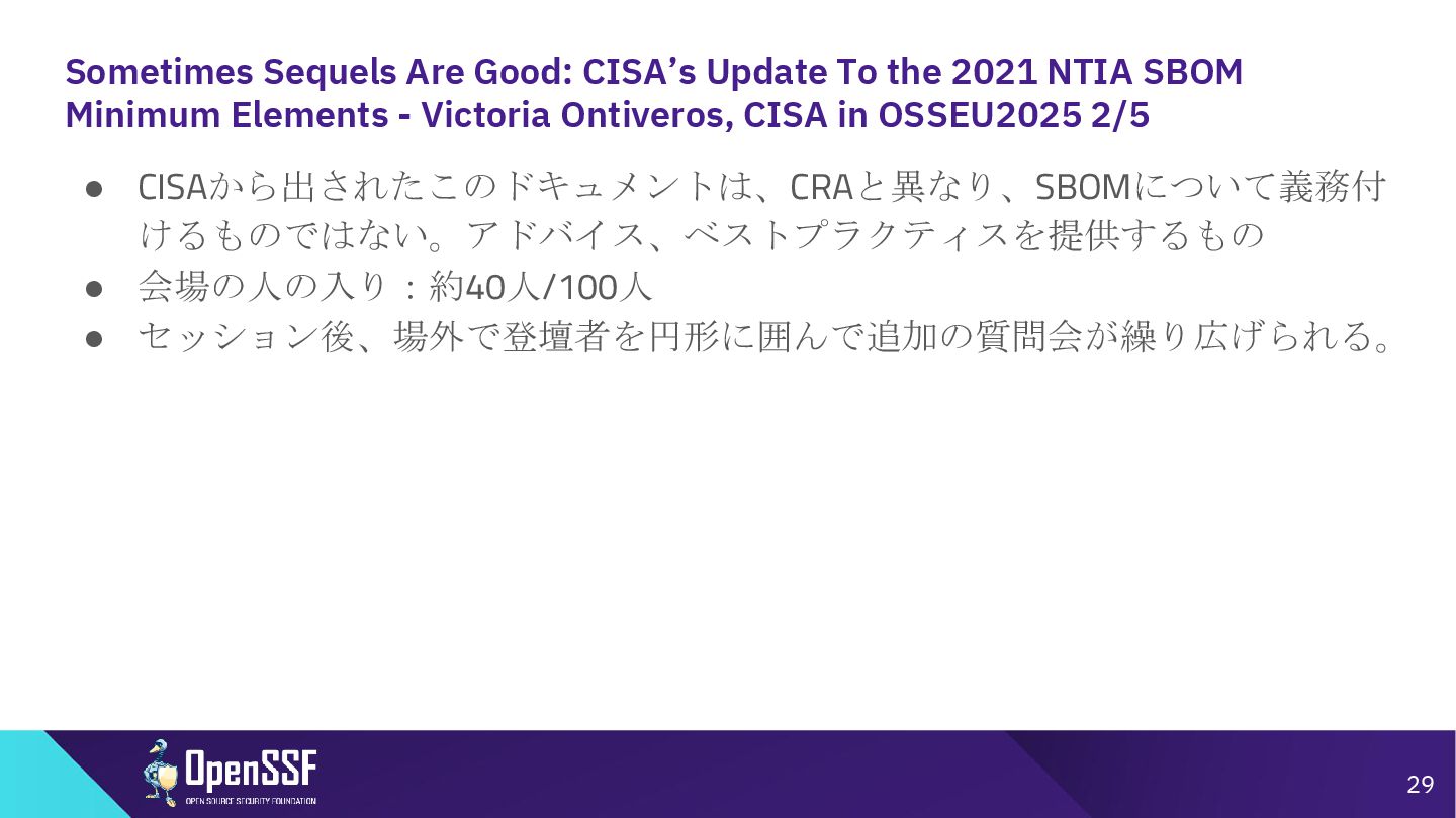 SBOM Minimum Elements - Victoria Ontiveros, CISA in OSSEU2025 1/5 • 2025/8/22にCISAから公開された”2025 Minimum Elements for an SBOM”(Draft) の紹介 ◦ 2021年にNTIA Minimum Elements for an SBOMの改版 ◦ 新規追加された箇所、変更点をPickUpして説明 ◦ 現在Draft版であり、10/3までフィードバック 受付中(CISAのHPから投稿) • SBOMの国際的調和が最優先事項と発言 ◦ 欧州委員会、フランス、BSI(ドイツ)、イタリア と連携 28 Session Link https://osseu2025.sched.com/event/26rRU/keynote-giants-standing-on-the-shoulders-of-daniel- stenberg-founder-and-lead-developer-of-the-curl-project-president-of-the-european-open-source- academy