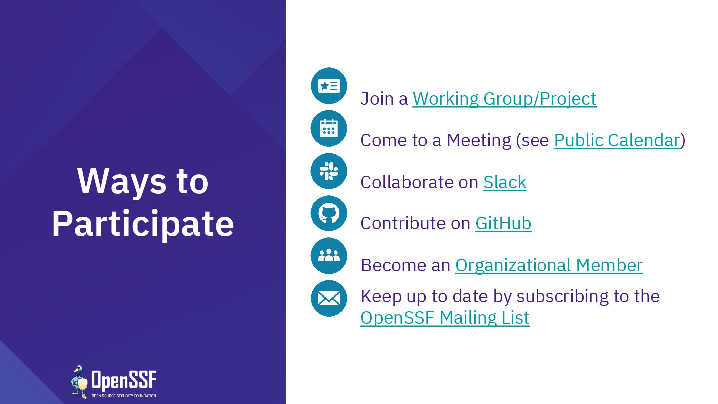Meeting (see Public Calendar) Collaborate on Slack Contribute on GitHub Become an Organizational Member Keep up to date by subscribing to the OpenSSF Mailing List