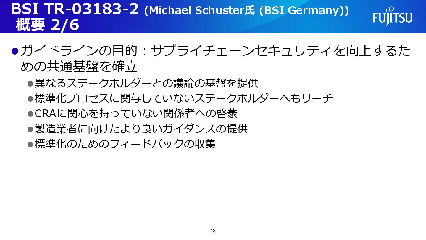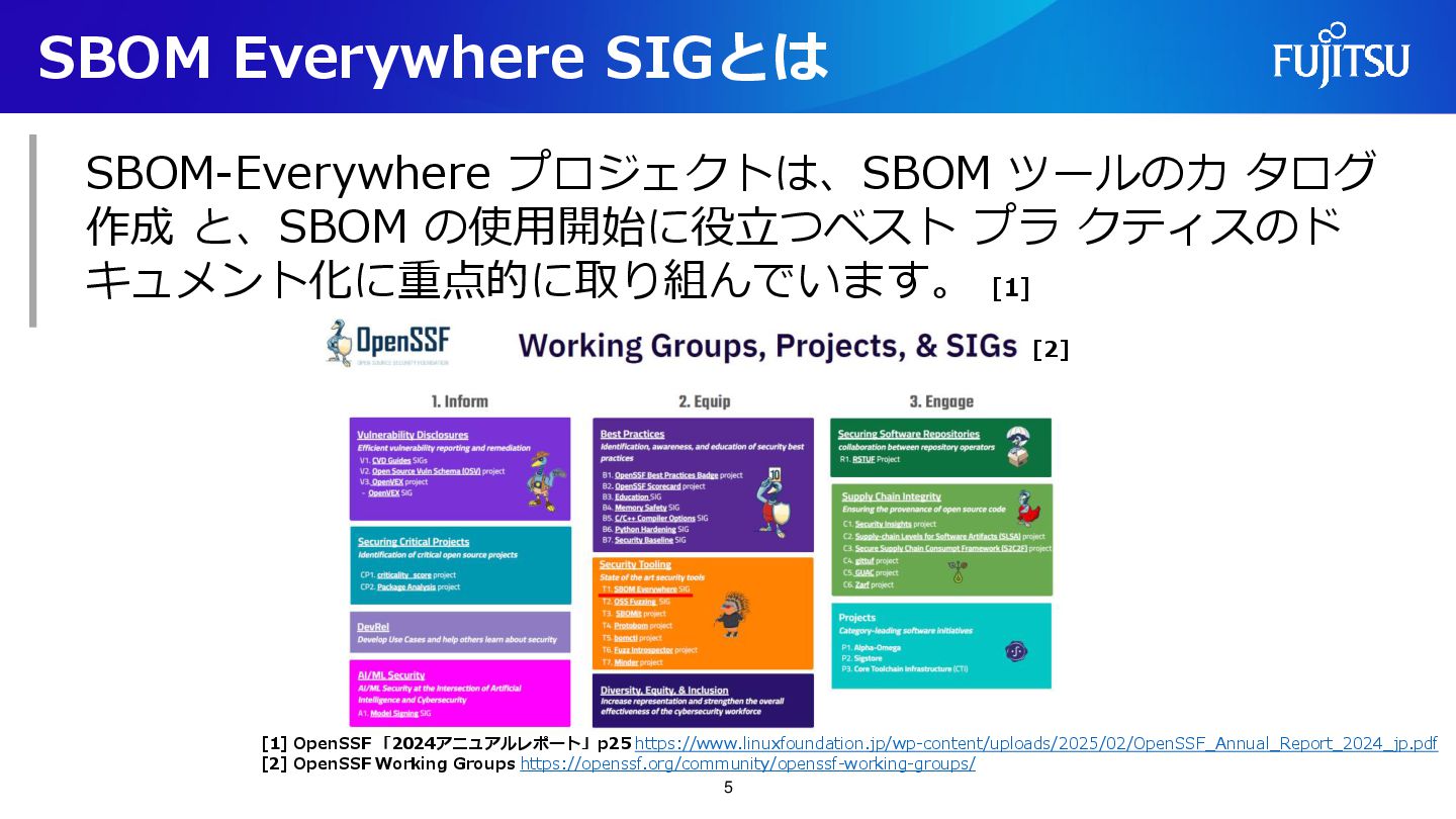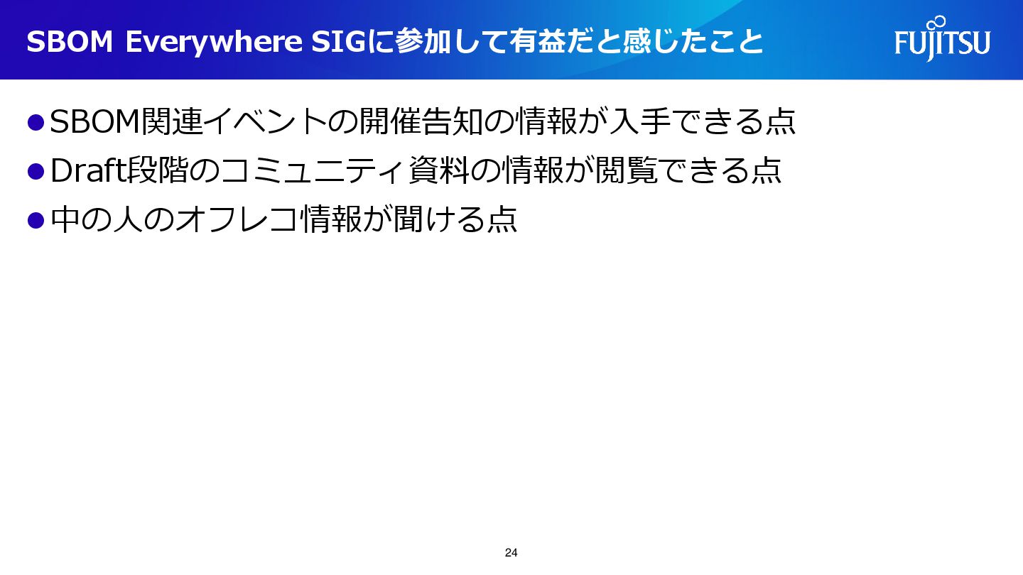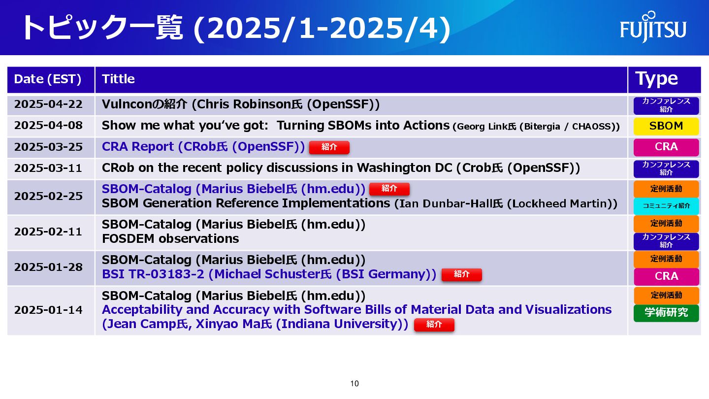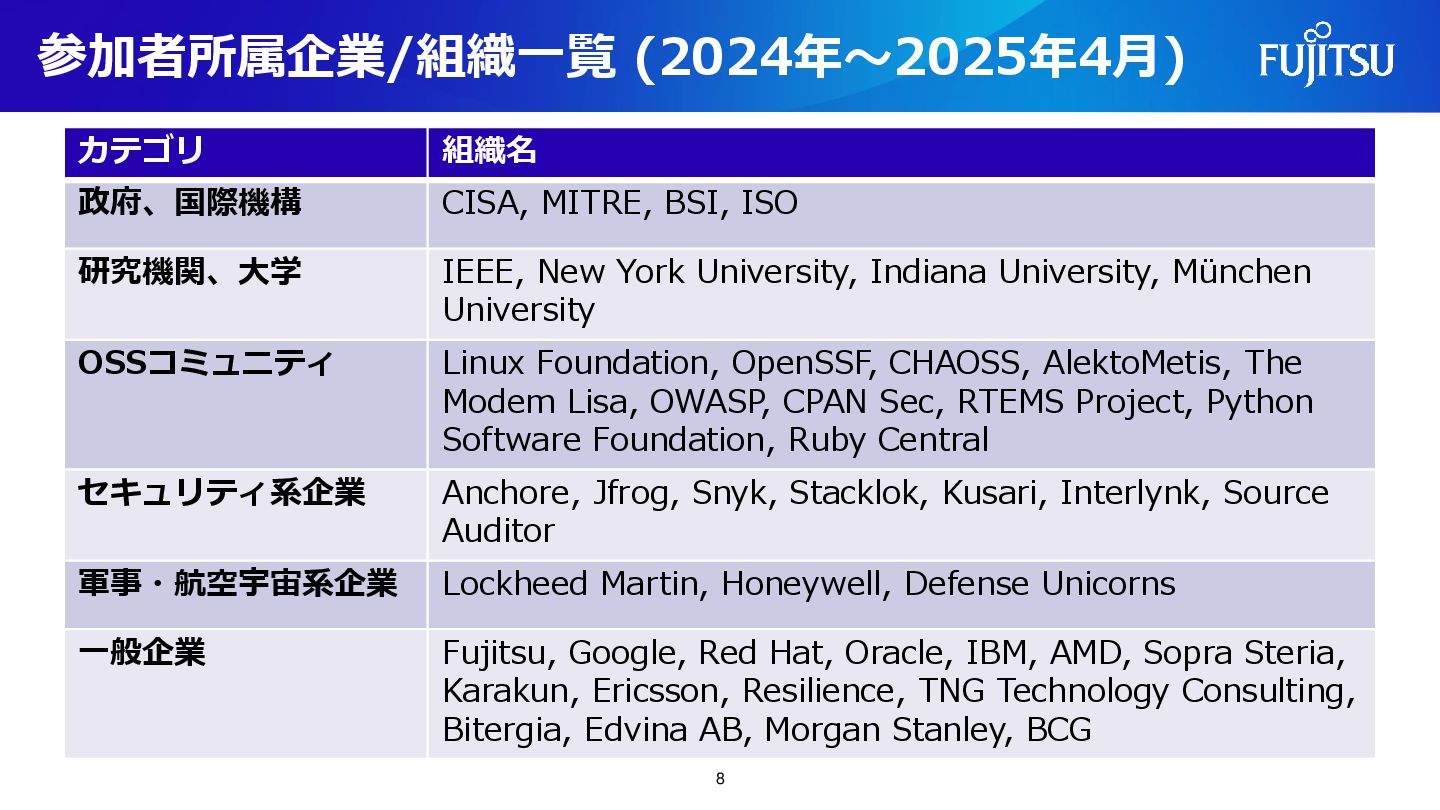 研究機関、大学 IEEE, New York University, Indiana University, München University OSSコミュニティ Linux Foundation, OpenSSF, CHAOSS, AlektoMetis, The Modem Lisa, OWASP, CPAN Sec, RTEMS Project, Python Software Foundation, Ruby Central セキュリティ系企業 Anchore, Jfrog, Snyk, Stacklok, Kusari, Interlynk, Source Auditor 軍事・航空宇宙系企業 Lockheed Martin, Honeywell, Defense Unicorns 一般企業 Fujitsu, Google, Red Hat, Oracle, IBM, AMD, Sopra Steria, Karakun, Ericsson, Resilience, TNG Technology Consulting, Bitergia, Edvina AB, Morgan Stanley, BCG