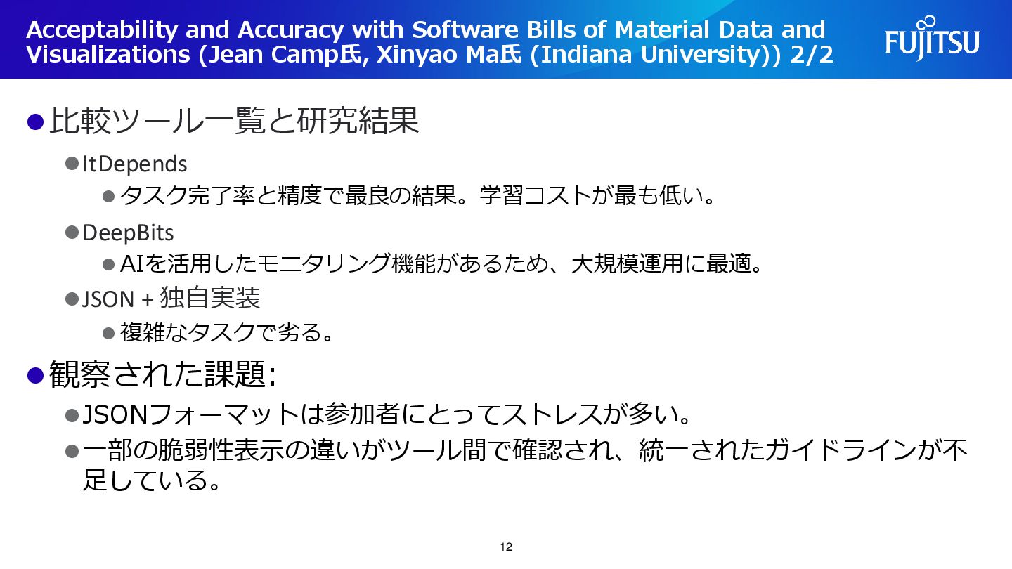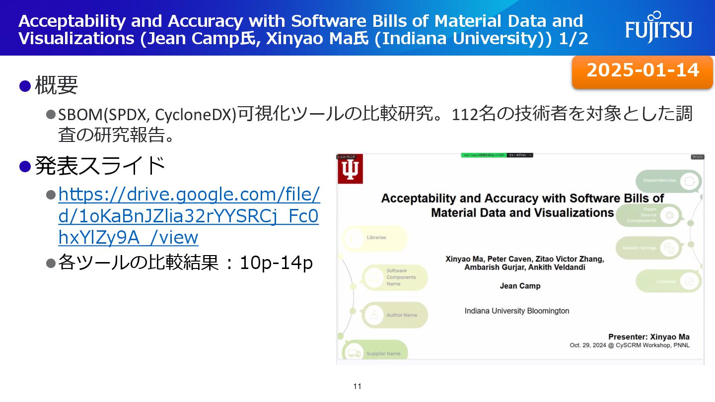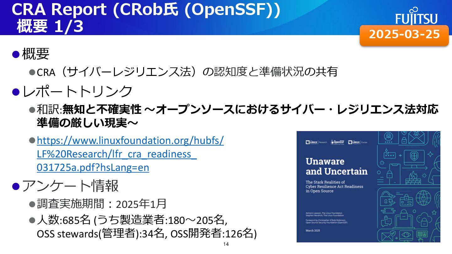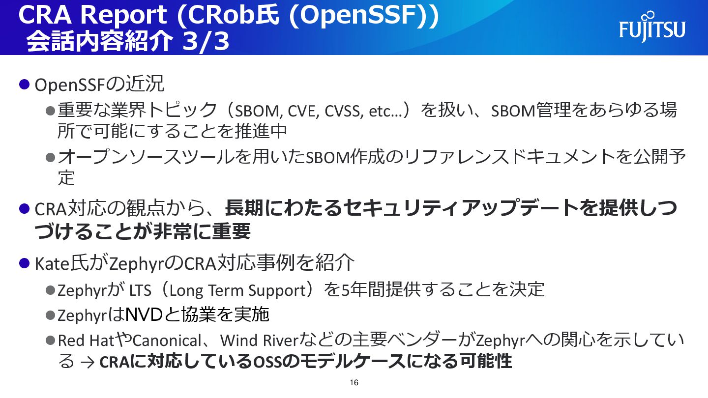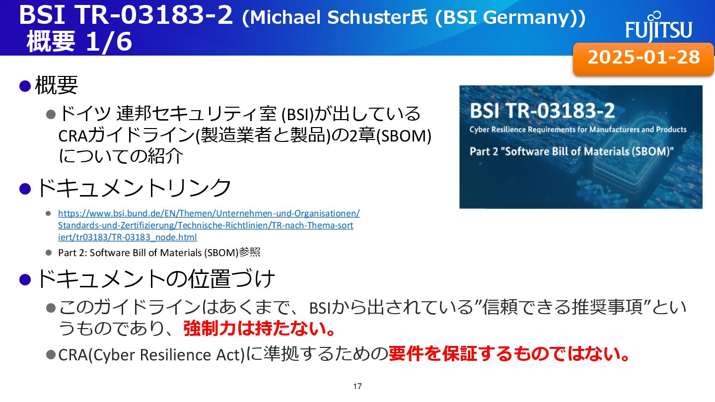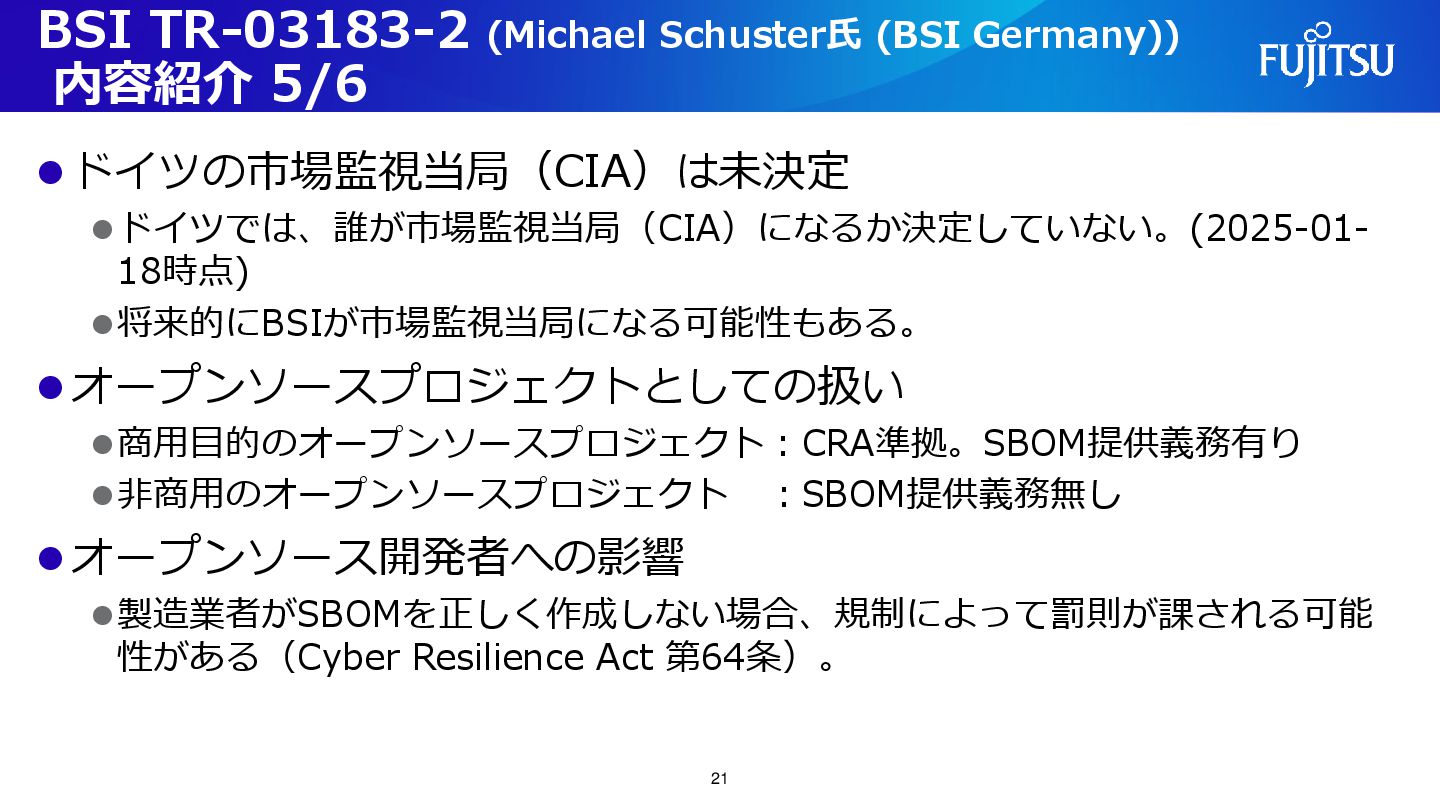 研究機関、大学 IEEE, New York University, Indiana University, München University OSSコミュニティ Linux Foundation, OpenSSF, CHAOSS, AlektoMetis, The Modem Lisa, OWASP, CPAN Sec, RTEMS Project, Python Software Foundation, Ruby Central セキュリティ系企業 Anchore, Jfrog, Snyk, Stacklok, Kusari, Interlynk, Source Auditor 軍事・航空宇宙系企業 Lockheed Martin, Honeywell, Defense Unicorns 一般企業 Fujitsu, Google, Red Hat, Oracle, IBM, AMD, Sopra Steria, Karakun, Ericsson, Resilience, TNG Technology Consulting, Bitergia, Edvina AB, Morgan Stanley, BCG