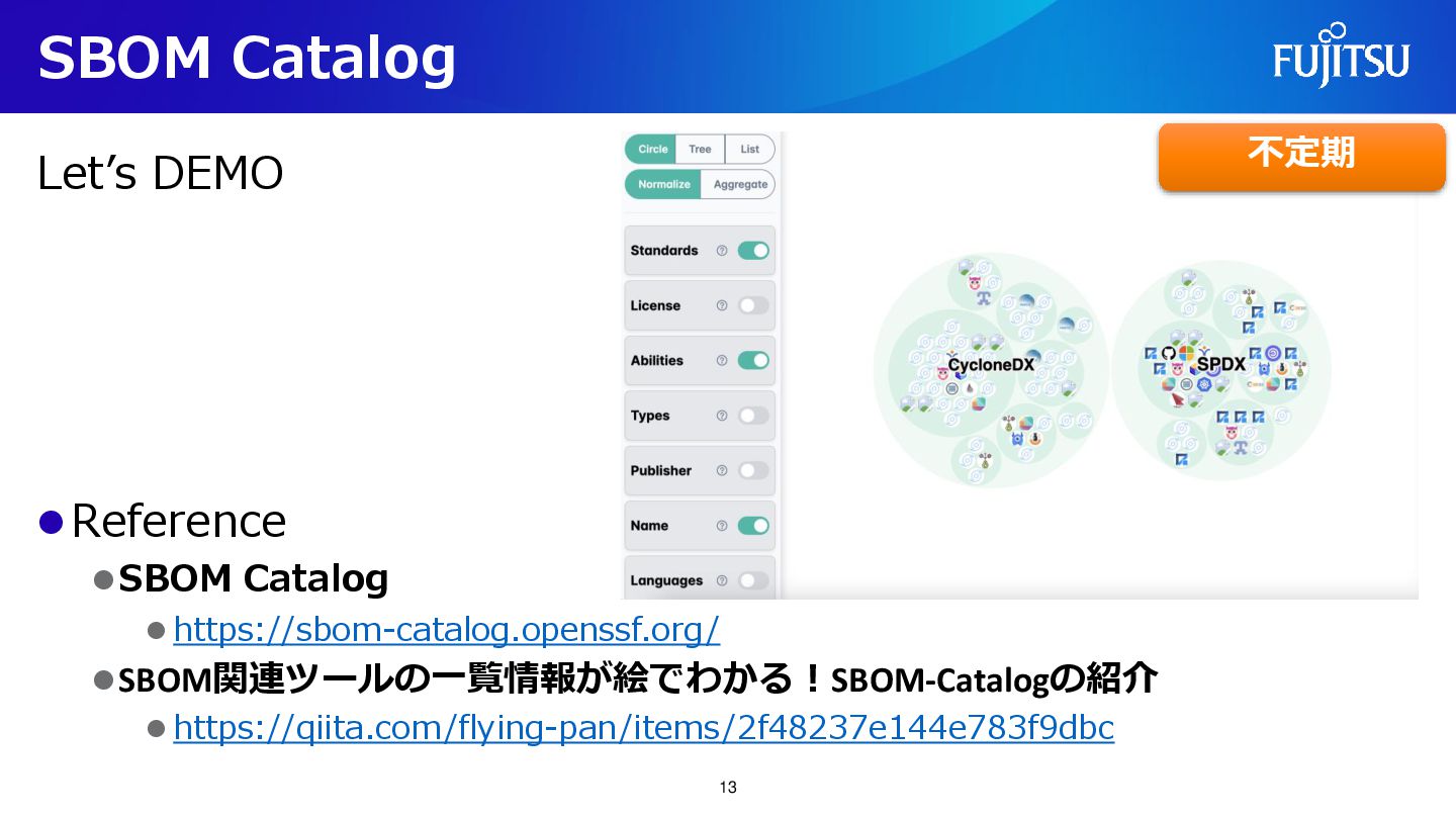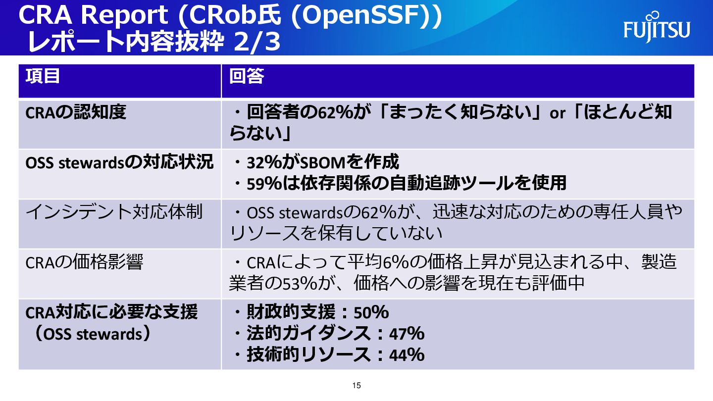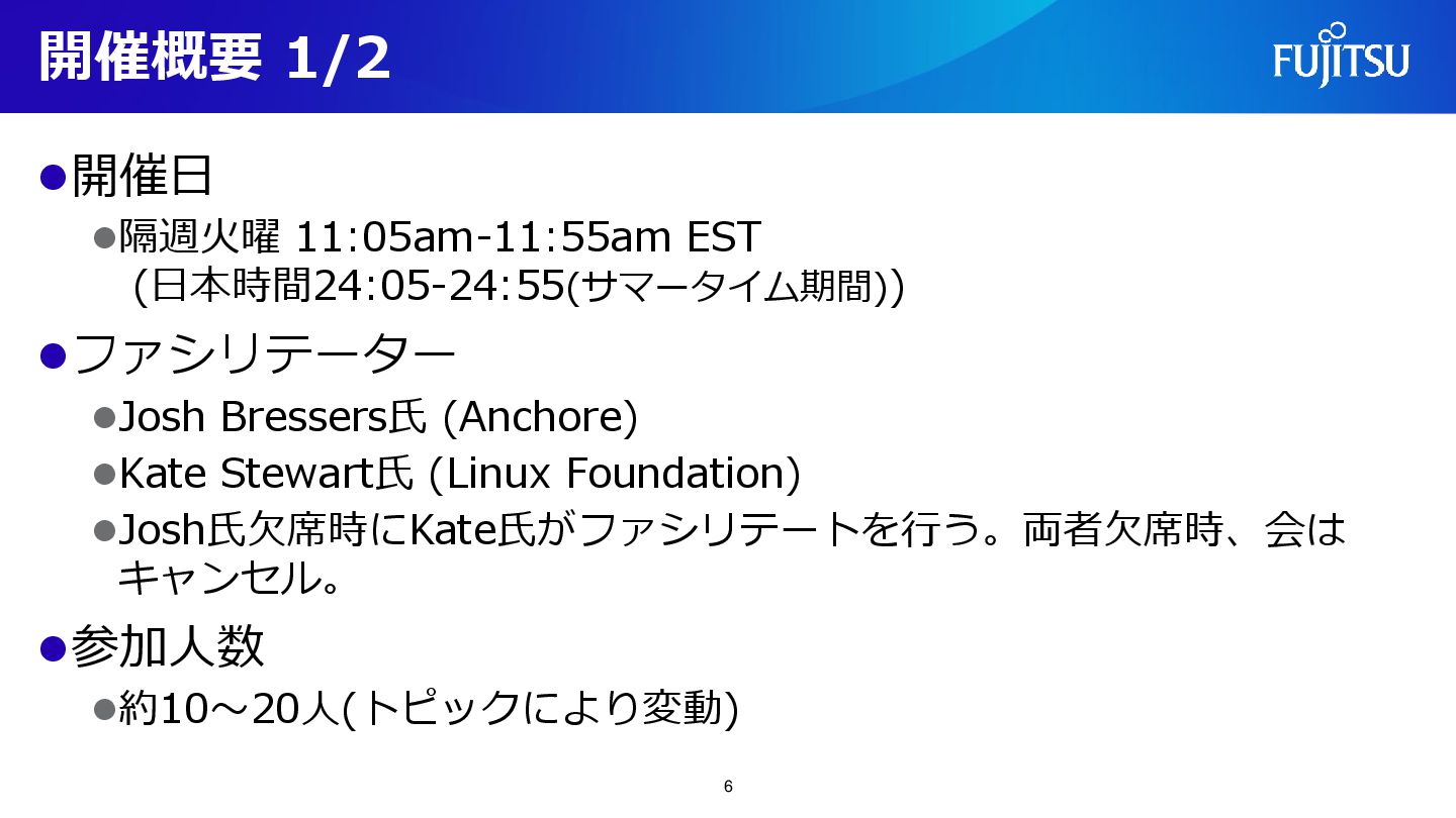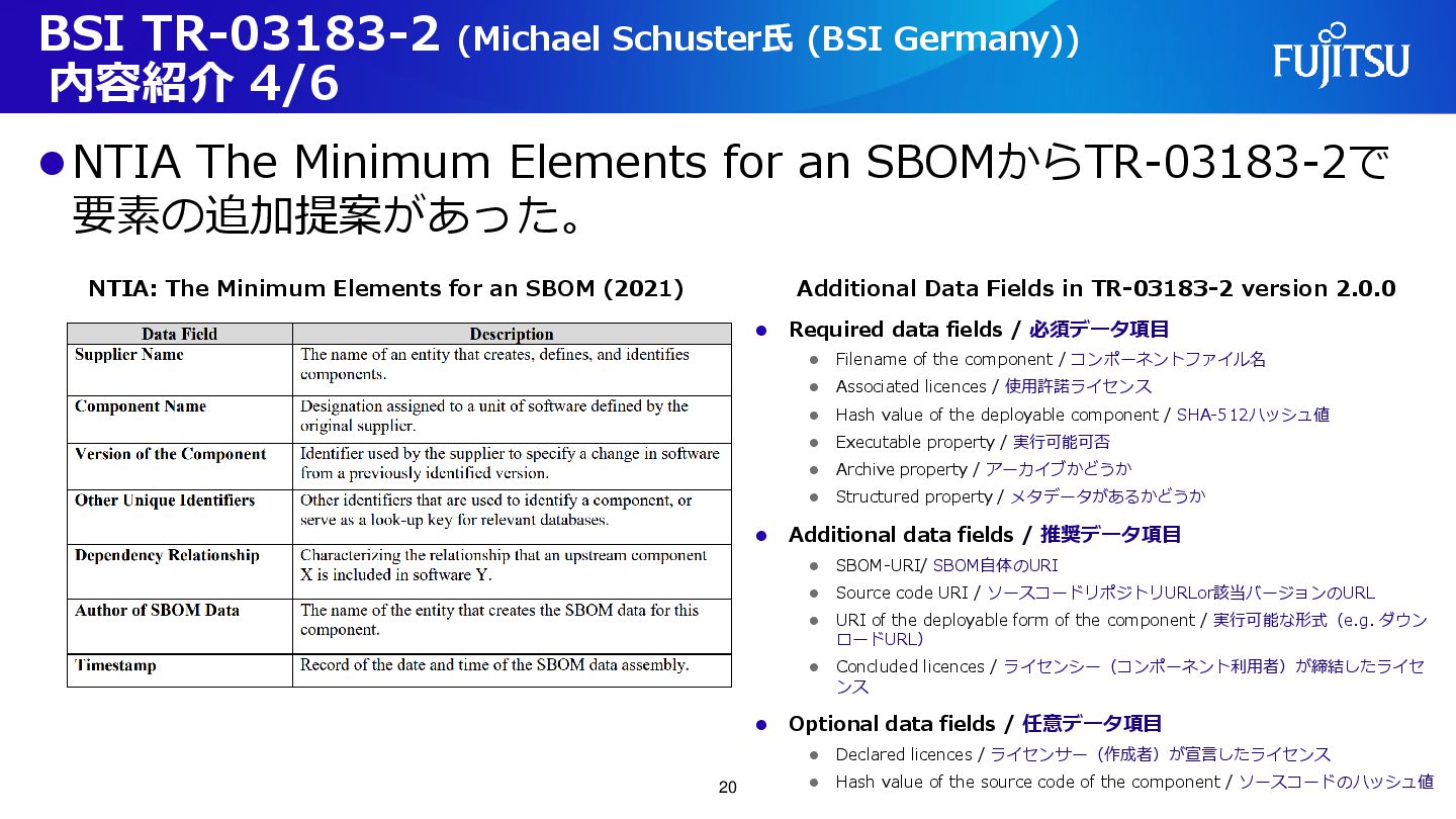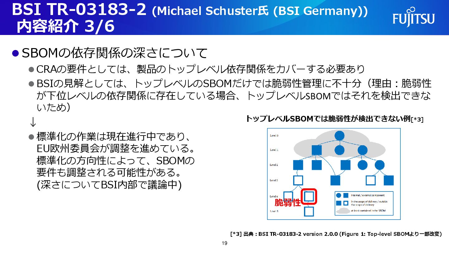 研究機関、大学 IEEE, New York University, Indiana University, München University OSSコミュニティ Linux Foundation, OpenSSF, CHAOSS, AlektoMetis, The Modem Lisa, OWASP, CPAN Sec, RTEMS Project, Python Software Foundation, Ruby Central セキュリティ系企業 Anchore, Jfrog, Snyk, Stacklok, Kusari, Interlynk, Source Auditor 軍事・航空宇宙系企業 Lockheed Martin, Honeywell, Defense Unicorns 一般企業 Fujitsu, Google, Red Hat, Oracle, IBM, AMD, Sopra Steria, Karakun, Ericsson, Resilience, TNG Technology Consulting, Bitergia, Edvina AB, Morgan Stanley, BCG