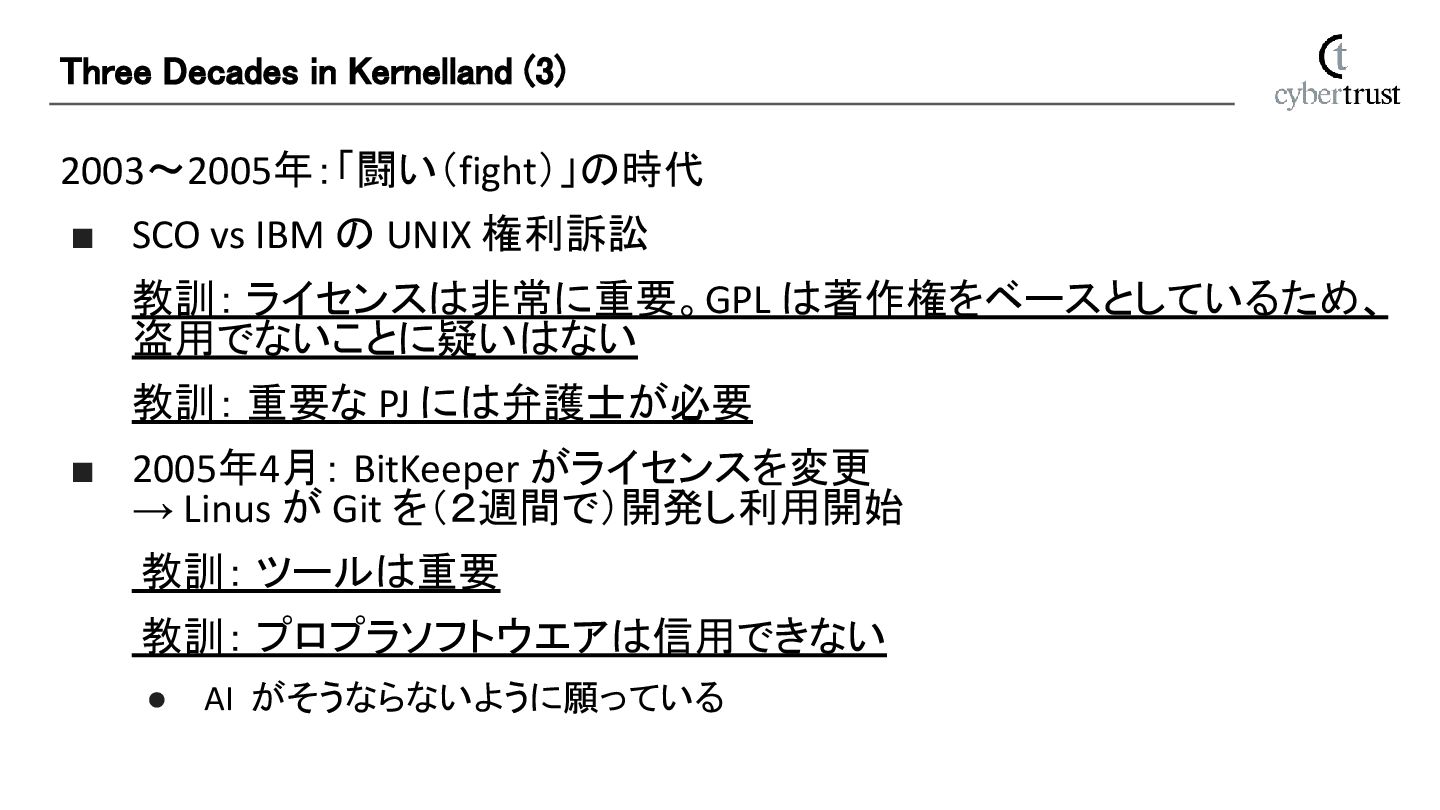 は著作権をベースとしているため、 盗用でないことに疑いはない 教訓: 重要な PJ には弁護士が必要 ▪ 2005年4月: BitKeeper がライセンスを変更 → Linus が Git を(2週間で)開発し利用開始 教訓: ツールは重要 教訓: プロプラソフトウエアは信用できない • AI がそうならないように願っている Three Decades in Kernelland (3)