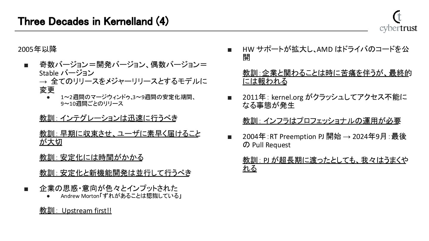 3~9週間の安定化期間、 9~10週間ごとのリリース 教訓: インテグレーションは迅速に行うべき 教訓: 早期に収束させ、ユーザに素早く届けること が大切 教訓: 安定化には時間がかかる 教訓: 安定化と新機能開発は並行して行うべき ▪ 企業の思惑・意向が色々とインプットされた • Andrew Morton「ずれがあることは認識している」 教訓: Upstream first!! Three Decades in Kernelland (4) ▪ HW サポートが拡大し、AMD はドライバのコードを公 開 教訓:企業と関わることは時に苦痛を伴うが、最終的 には報われる ▪ 2011年: kernel.org がクラッシュしてアクセス不能に なる事態が発生 教訓: インフラはプロフェッショナルの運用が必要 ▪ 2004年:RT Preemption PJ 開始 → 2024年9月:最後 の Pull Request 教訓: PJ が超長期に渡ったとしても、我々はうまくや れる