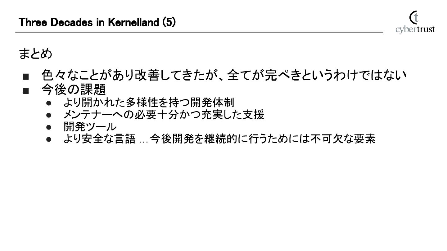 開発ツール • より安全な言語 …今後開発を継続的に行うためには不可欠な要素 Three Decades in Kernelland (5)