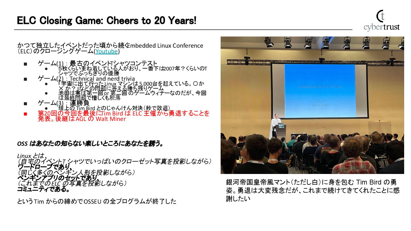 • 5枚くらい重ね着している人がおり、一番下は 2007年?くらいのT シャツでぶっちぎりの優勝 ▪ ゲーム(2) : Technical and nerd trivia • 「宇宙に出て行った Linux マシンは 5,000台を超えている。〇 か ✕ か?」などの問題に答える勝ち残りゲーム • 池田は実は第一回 or 第二回 のゲームウィナーなのだが、今回 は最終問題で惜しくも脱落 ▪ ゲーム(3) : 運勝負 • 壇上の Tim Bird とのじゃんけん対決(秒で敗退) ▪ 第20回の今回を最後に Tim Bird は ELC 主催から勇退することを 発表。後継は AGL の Walt Miner OSS はあなたの知らない楽しいところにあなたを誘う。 Linux とは、 (自宅のイベント T シャツでいっぱいのクローゼット写真を投影しながら) ワードローブであり、 (同じく多くのペンギン人形を投影しながら) ペンギンアプリのセットであり、 (これまでの ELC の写真を投影しながら) コミュニティである。 という Tim からの締めで OSSEU の全プログラムが終了した ELC Closing Game: Cheers to 20 Years! 銀河帝国皇帝風マント(ただし白)に身を包む Tim Bird の勇 姿。勇退は大変残念だが、これまで続けてきてくれたことに感 謝したい