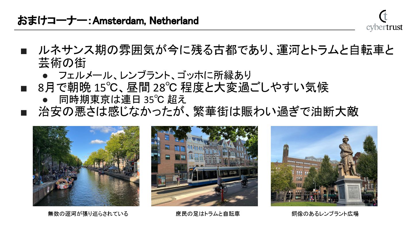 • 同時期東京は連日 35℃ 超え ▪ 治安の悪さは感じなかったが、繁華街は賑わい過ぎで油断大敵 おまけコーナー:Amsterdam, Netherland 無数の運河が張り巡らされている 庶民の足はトラムと自転車 銅像のあるレンブラント広場