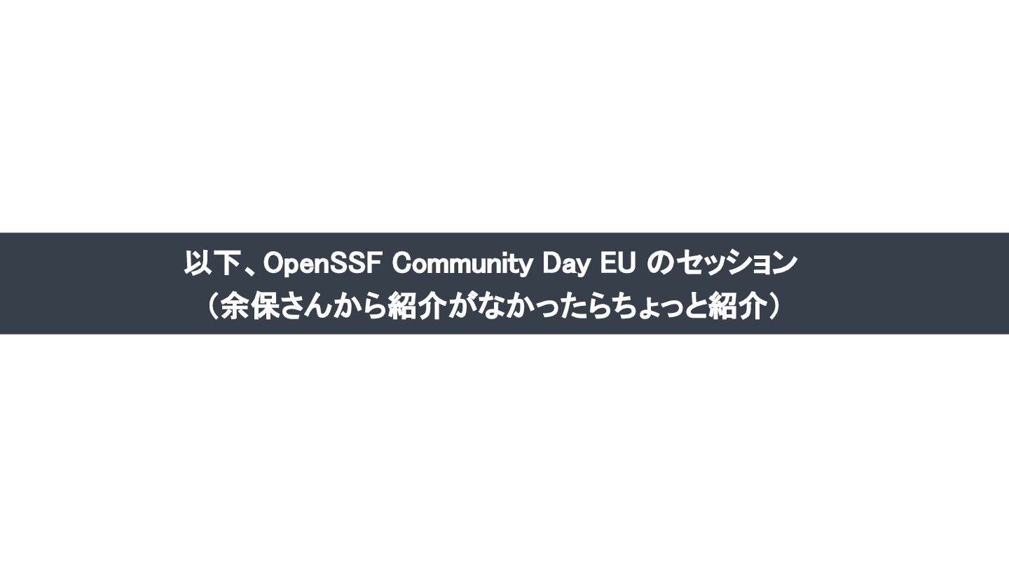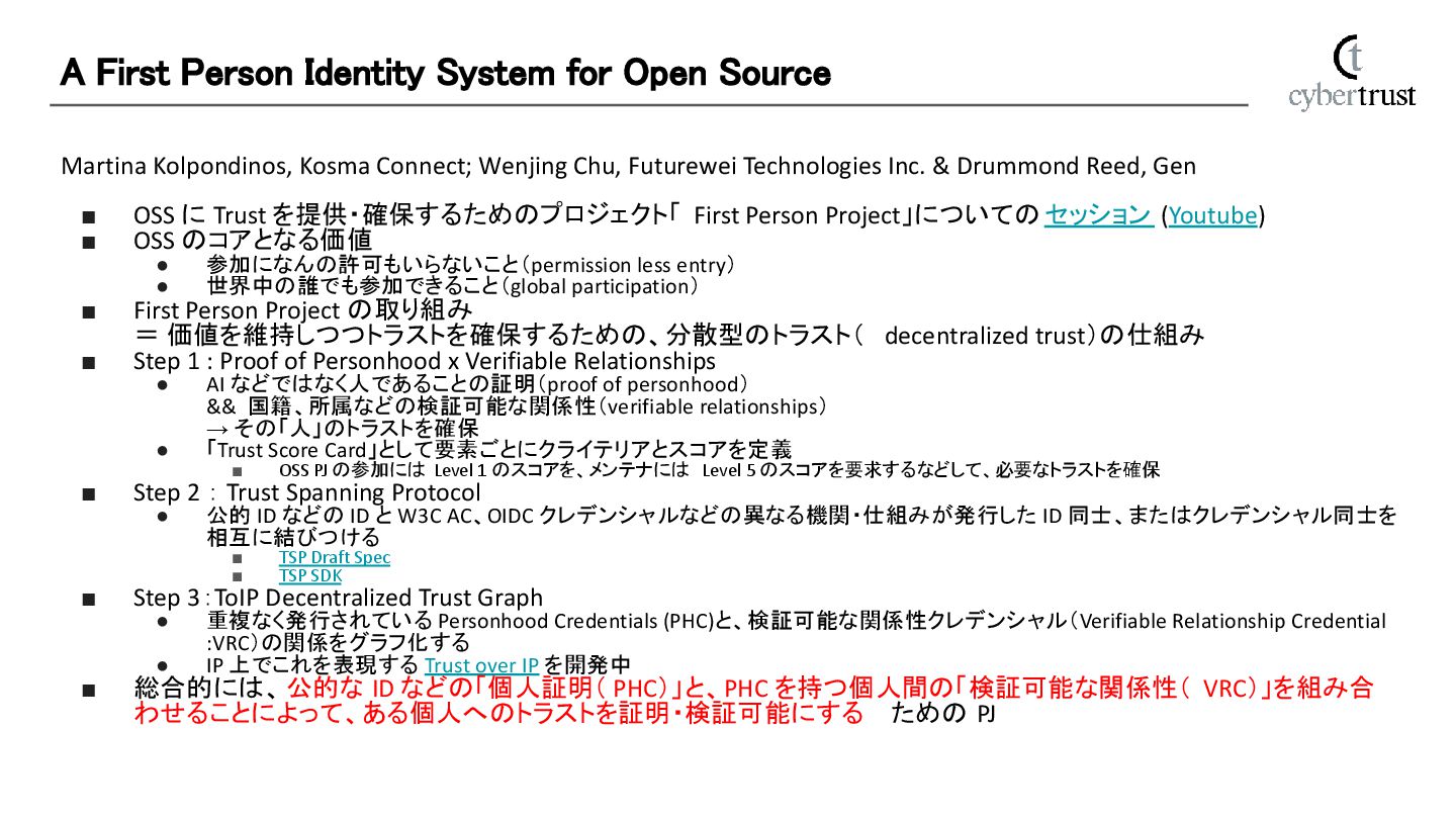 Drummond Reed, Gen ▪ OSS に Trust を提供・確保するためのプロジェクト「 First Person Project」についての セッション (Youtube) ▪ OSS のコアとなる価値 • 参加になんの許可もいらないこと(permission less entry) • 世界中の誰でも参加できること(global participation) ▪ First Person Project の取り組み = 価値を維持しつつトラストを確保するための、分散型のトラスト( decentralized trust)の仕組み ▪ Step 1 : Proof of Personhood x Verifiable Relationships • AI などではなく人であることの証明(proof of personhood) && 国籍、所属などの検証可能な関係性(verifiable relationships) → その「人」のトラストを確保 • 「Trust Score Card」として要素ごとにクライテリアとスコアを定義 ▪ OSS PJ の参加には Level 1 のスコアを、メンテナには Level 5 のスコアを要求するなどして、必要なトラストを確保 ▪ Step 2 : Trust Spanning Protocol • 公的 ID などの ID と W3C AC、OIDC クレデンシャルなどの異なる機関・仕組みが発行した ID 同士、またはクレデンシャル同士を 相互に結びつける ▪ TSP Draft Spec ▪ TSP SDK ▪ Step 3:ToIP Decentralized Trust Graph • 重複なく発行されている Personhood Credentials (PHC)と、検証可能な関係性クレデンシャル(Verifiable Relationship Credential :VRC)の関係をグラフ化する • IP 上でこれを表現する Trust over IP を開発中 ▪ 総合的には、 公的な ID などの「個人証明( PHC)」と、PHC を持つ個人間の「検証可能な関係性( VRC)」を組み合 わせることによって、ある個人へのトラストを証明・検証可能にする ための PJ A First Person Identity System for Open Source