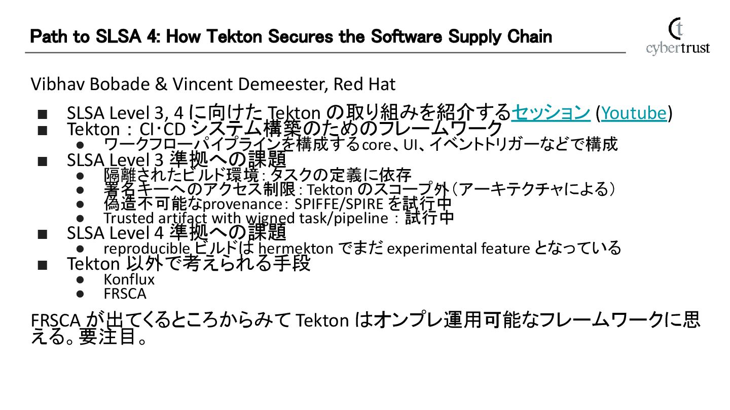 3, 4 に向けた Tekton の取り組みを紹介するセッション (Youtube) ▪ Tekton : CI・CD システム構築のためのフレームワーク • ワークフローパイプラインを構成する core、UI、イベントトリガーなどで構成 ▪ SLSA Level 3 準拠への課題 • 隔離されたビルド環境: タスクの定義に依存 • 署名キーへのアクセス制限: Tekton のスコープ外(アーキテクチャによる) • 偽造不可能なprovenance: SPIFFE/SPIRE を試行中 • Trusted artifact with wigned task/pipeline : 試行中 ▪ SLSA Level 4 準拠への課題 • reproducible ビルドは hermekton でまだ experimental feature となっている ▪ Tekton 以外で考えられる手段 • Konflux • FRSCA FRSCA が出てくるところからみて Tekton はオンプレ運用可能なフレームワークに思 える。要注目。 Path to SLSA 4: How Tekton Secures the Software Supply Chain