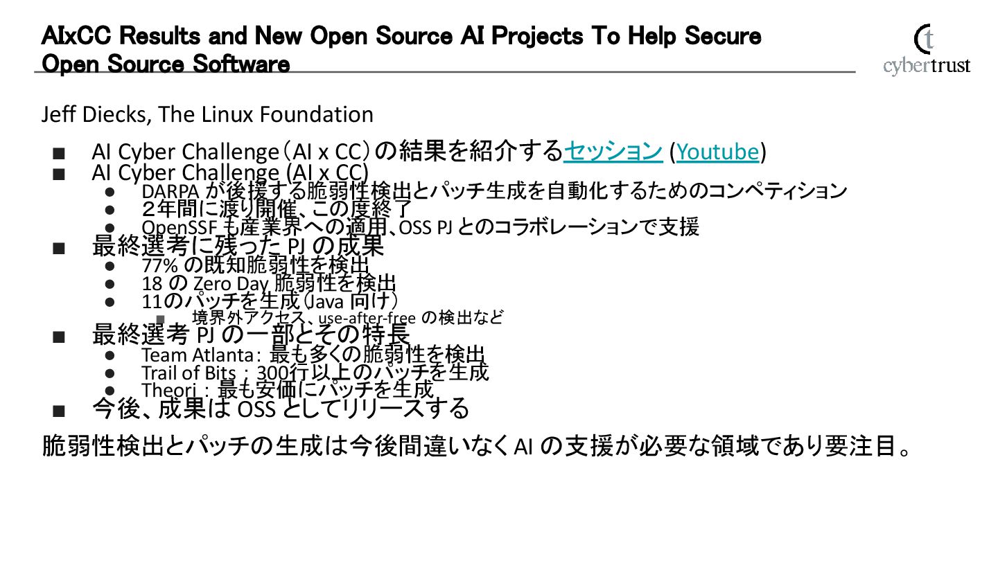 CC)の結果を紹介するセッション (Youtube) ▪ AI Cyber Challenge (AI x CC) • DARPA が後援する脆弱性検出とパッチ生成を自動化するためのコンペティション • 2年間に渡り開催、この度終了 • OpenSSF も産業界への適用、OSS PJ とのコラボレーションで支援 ▪ 最終選考に残った PJ の成果 • 77% の既知脆弱性を検出 • 18 の Zero Day 脆弱性を検出 • 11のパッチを生成(Java 向け) ▪ 境界外アクセス、use-after-free の検出など ▪ 最終選考 PJ の一部とその特長 • Team Atlanta: 最も多くの脆弱性を検出 • Trail of Bits : 300行以上のパッチを生成 • Theori : 最も安価にパッチを生成 ▪ 今後、成果は OSS としてリリースする 脆弱性検出とパッチの生成は今後間違いなく AI の支援が必要な領域であり要注目。 AIxCC Results and New Open Source AI Projects To Help Secure Open Source Software