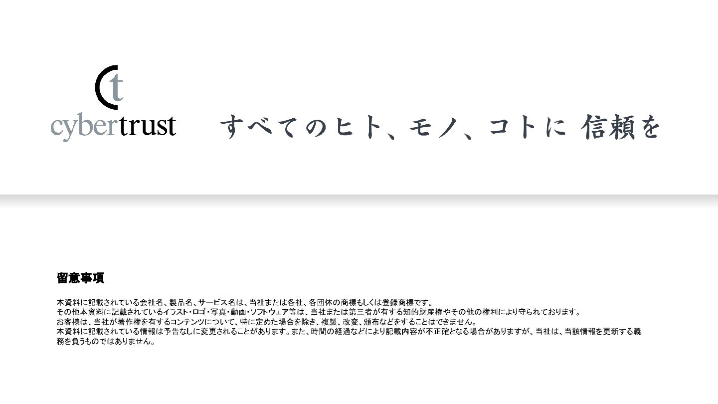 留意事項 本資料に記載されている会社名、製品名、サービス名は、当社または各社、各団体の商標もしくは登録商標です。 その他本資料に記載されているイラスト・ロゴ・写真・動画・ソフトウェア等は、当社または第三者が有する知的財産権やその他の権利により守られております。 お客様は、当社が著作権を有するコンテンツについて、特に定めた場合を除き、複製、改変、頒布などをすることはできません。 本資料に記載されている情報は予告なしに変更されることがあります。また、時間の経過などにより記載内容が不正確となる場合がありますが、当社は、当該情報を更新する義 務を負うものではありません。