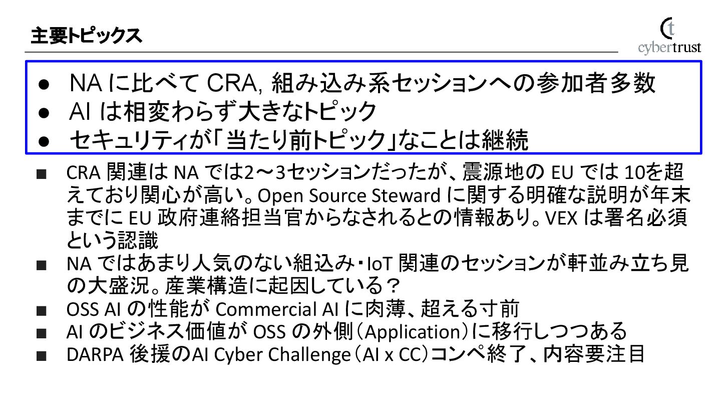Steward に関する明確な説明が年末 までに EU 政府連絡担当官からなされるとの情報あり。VEX は署名必須 という認識 ▪ NA ではあまり人気のない組込み・IoT 関連のセッションが軒並み立ち見 の大盛況。産業構造に起因している? ▪ OSS AI の性能が Commercial AI に肉薄、超える寸前 ▪ AI のビジネス価値が OSS の外側(Application)に移行しつつある ▪ DARPA 後援のAI Cyber Challenge(AI x CC)コンペ終了、内容要注目 主要トピックス • NA に比べて CRA, 組み込み系セッションへの参加者多数 • AI は相変わらず大きなトピック • セキュリティが「当たり前トピック」なことは継続