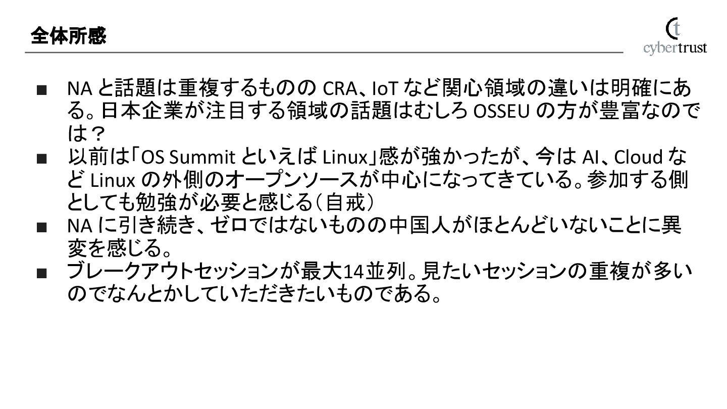 以前は「OS Summit といえば Linux」感が強かったが、今は AI、Cloud な ど Linux の外側のオープンソースが中心になってきている。参加する側 としても勉強が必要と感じる(自戒) ▪ NA に引き続き、ゼロではないものの中国人がほとんどいないことに異 変を感じる。 ▪ ブレークアウトセッションが最大14並列。見たいセッションの重複が多い のでなんとかしていただきたいものである。 全体所感