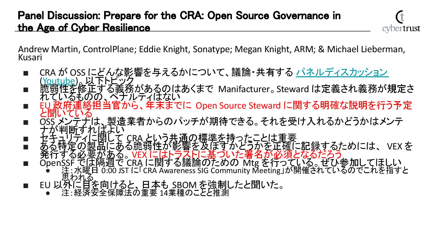 Michael Lieberman, Kusari ▪ CRA が OSS にどんな影響を与えるかについて、議論・共有する パネルディスカッション (Youtube)。以下トピック ▪ 脆弱性を修正する義務があるのはあくまで Manifacturer。Steward は定義され義務が規定さ れているものの、ペナルティはない ▪ EU 政府連絡担当官から、年末までに Open Source Steward に関する明確な説明を行う予定 と聞いている ▪ OSS メンテナは、製造業者からのパッチが期待できる。それを受け入れるかどうかはメンテ ナが判断すればよい ▪ セキュリティに関して CRA という共通の標準を持ったことは重要 ▪ ある特定の製品にある脆弱性が影響を及ぼすかどうかを正確に記録するためには、 VEX を 発行する必要がある。VEX にはトラストに基づいた署名が必須となるだろう ▪ OpenSSF では隔週で CRA に関する議論のための Mtg を行っている。ぜひ参加してほしい • 注:水曜日 0:00 JST に「CRA Awareness SIG Community Meeting」が開催されているのでこれを指すと 思われる ▪ EU 以外に目を向けると、日本も SBOM を強制したと聞いた。 • 注:経済安全保障法の重要 14業種のことと推測 Panel Discussion: Prepare for the CRA: Open Source Governance in the Age of Cyber Resilience