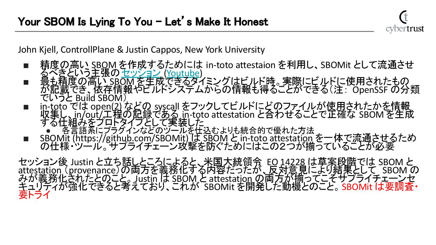 精度の高い SBOM を作成するためには in-toto attestaion を利用し、SBOMit として流通させ るべきという主張のセッション (Youtube) ▪ 最も精度の高い SBOM を生成できるタイミングはビルド時。実際にビルドに使用されたもの が記載でき、依存情報やビルドシステムからの情報も得ることができる(注: OpenSSF の分類 でいうと Build SBOM) ▪ in-toto では open(2) などの syscall をフックしてビルドにどのファイルが使用されたかを情報 収集し、in/out/工程の記録である in-toto attestation と合わせることで正確な SBOM を生成 する仕組みをプロトタイプとして実装した • 各言語系にプラグインなどのツールを仕込むよりも統合的で優れた方法 ▪ SBOMit (https://github.com/SBOMit) は SBOM と in-toto attestation を一体で流通させるため の仕様・ツール。サプライチェーン攻撃を防ぐためにはこの2つが揃っていることが必要 セッション後 Justin と立ち話しところによると、米国大統領令 EO 14228 は草案段階では SBOM と attestation (provenance)の両方を義務化する内容だったが、反対意見により結果として SBOM の みが義務化されたとのこと。 Justin は SBOM と attestation の両方が揃ってこそサプライチェーンセ キュリティが強化できると考えており、これが SBOMit を開発した動機とのこと。SBOMit は要調査・ 要トライ Your SBOM Is Lying To You - Let’s Make It Honest