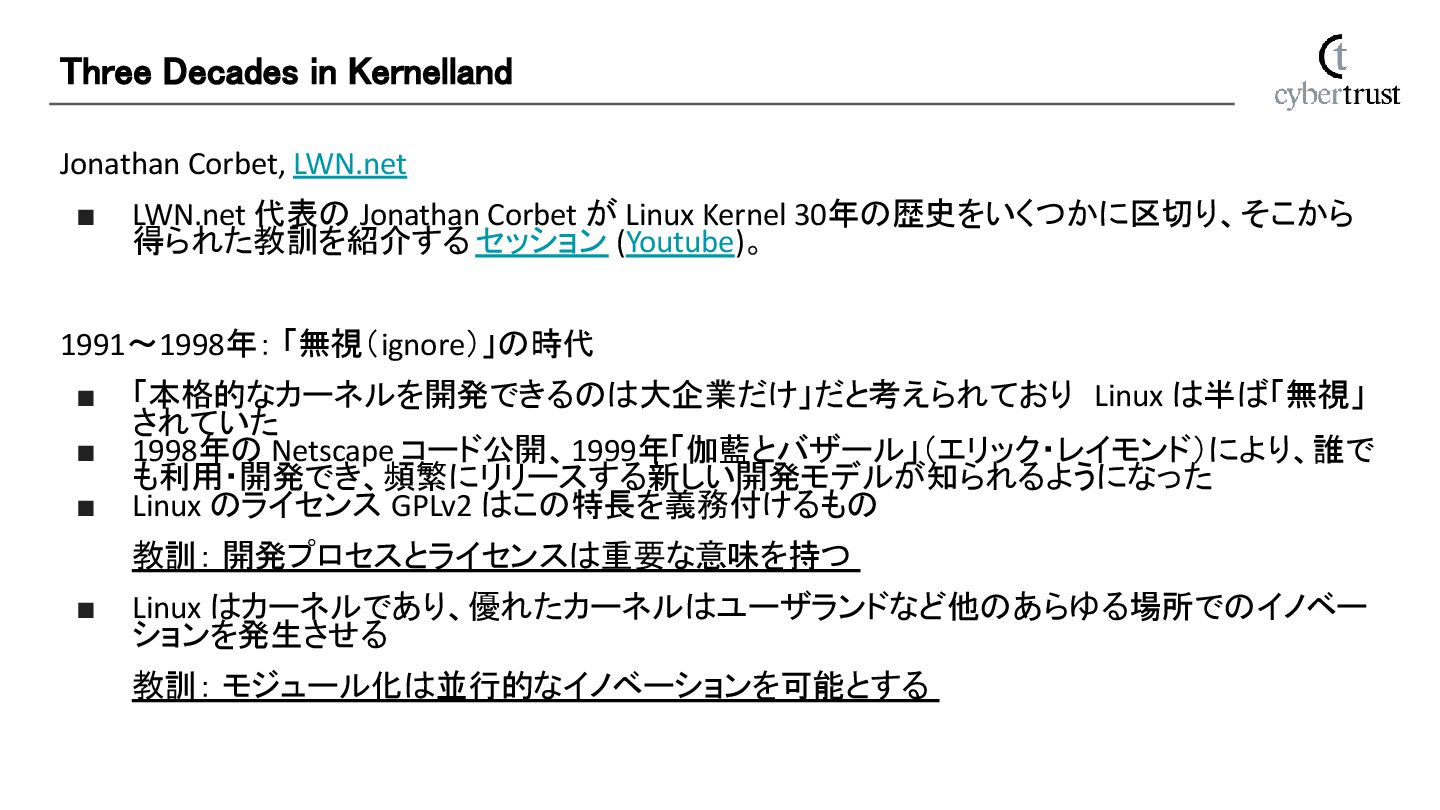 Kernel 30年の歴史をいくつかに区切り、そこから 得られた教訓を紹介するセッション (Youtube)。 1991~1998年: 「無視(ignore)」の時代 ▪ 「本格的なカーネルを開発できるのは大企業だけ」だと考えられており Linux は半ば「無視」 されていた ▪ 1998年の Netscape コード公開、1999年「伽藍とバザール」(エリック・レイモンド)により、誰で も利用・開発でき、頻繁にリリースする新しい開発モデルが知られるようになった ▪ Linux のライセンス GPLv2 はこの特長を義務付けるもの 教訓: 開発プロセスとライセンスは重要な意味を持つ ▪ Linux はカーネルであり、優れたカーネルはユーザランドなど他のあらゆる場所でのイノベー ションを発生させる 教訓: モジュール化は並行的なイノベーションを可能とする Three Decades in Kernelland