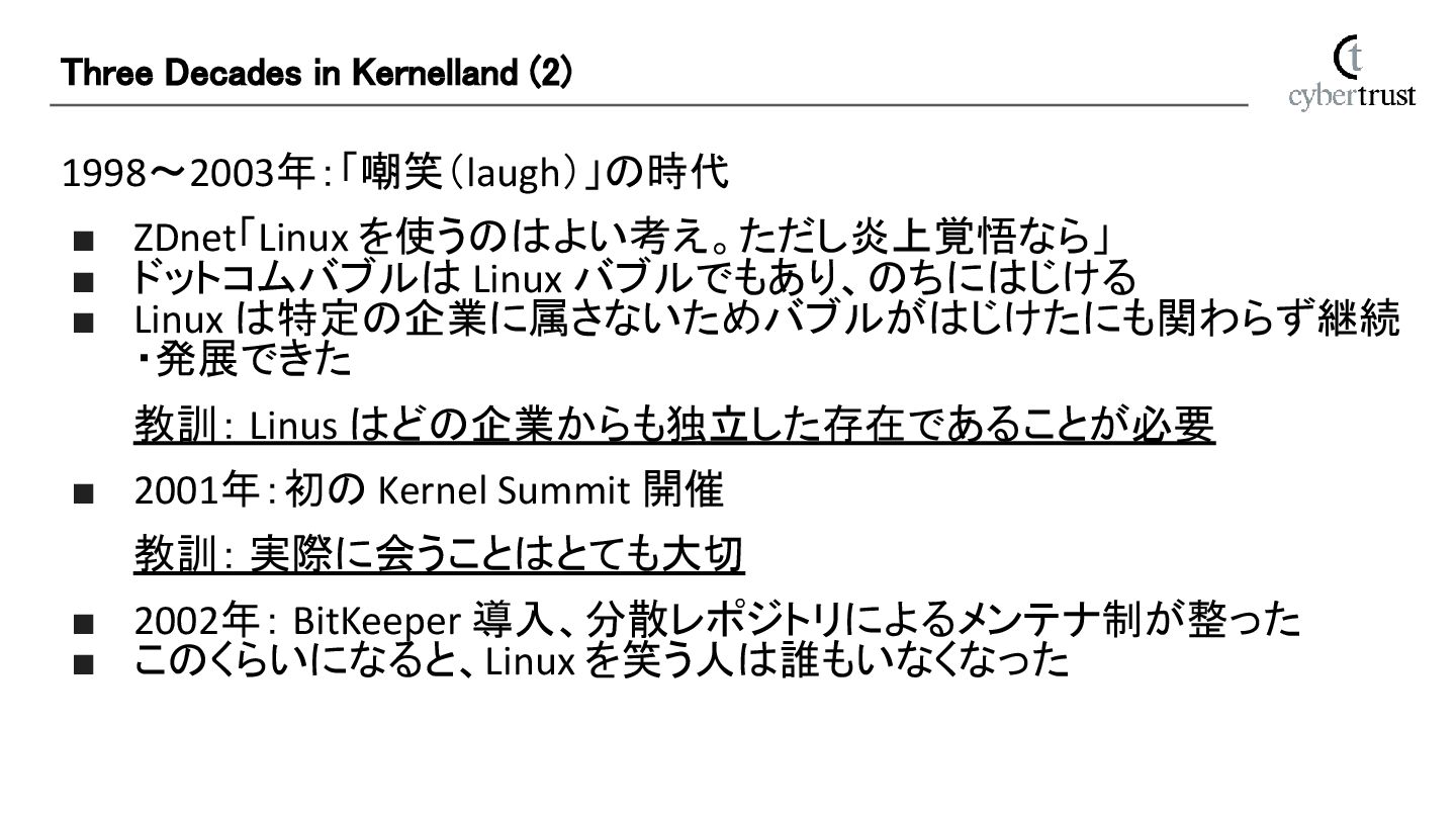 は特定の企業に属さないためバブルがはじけたにも関わらず継続 ・発展できた 教訓: Linus はどの企業からも独立した存在であることが必要 ▪ 2001年:初の Kernel Summit 開催 教訓: 実際に会うことはとても大切 ▪ 2002年: BitKeeper 導入、分散レポジトリによるメンテナ制が整った ▪ このくらいになると、Linux を笑う人は誰もいなくなった Three Decades in Kernelland (2)