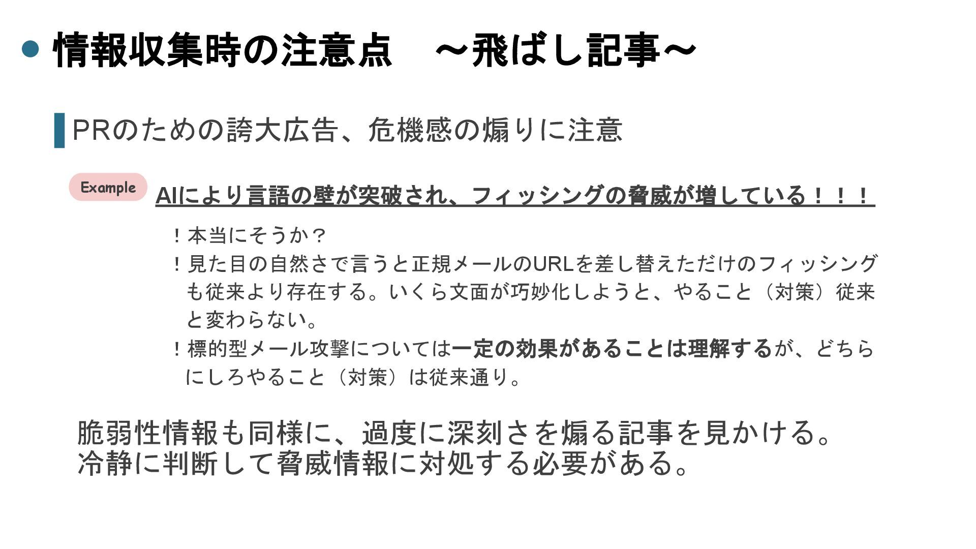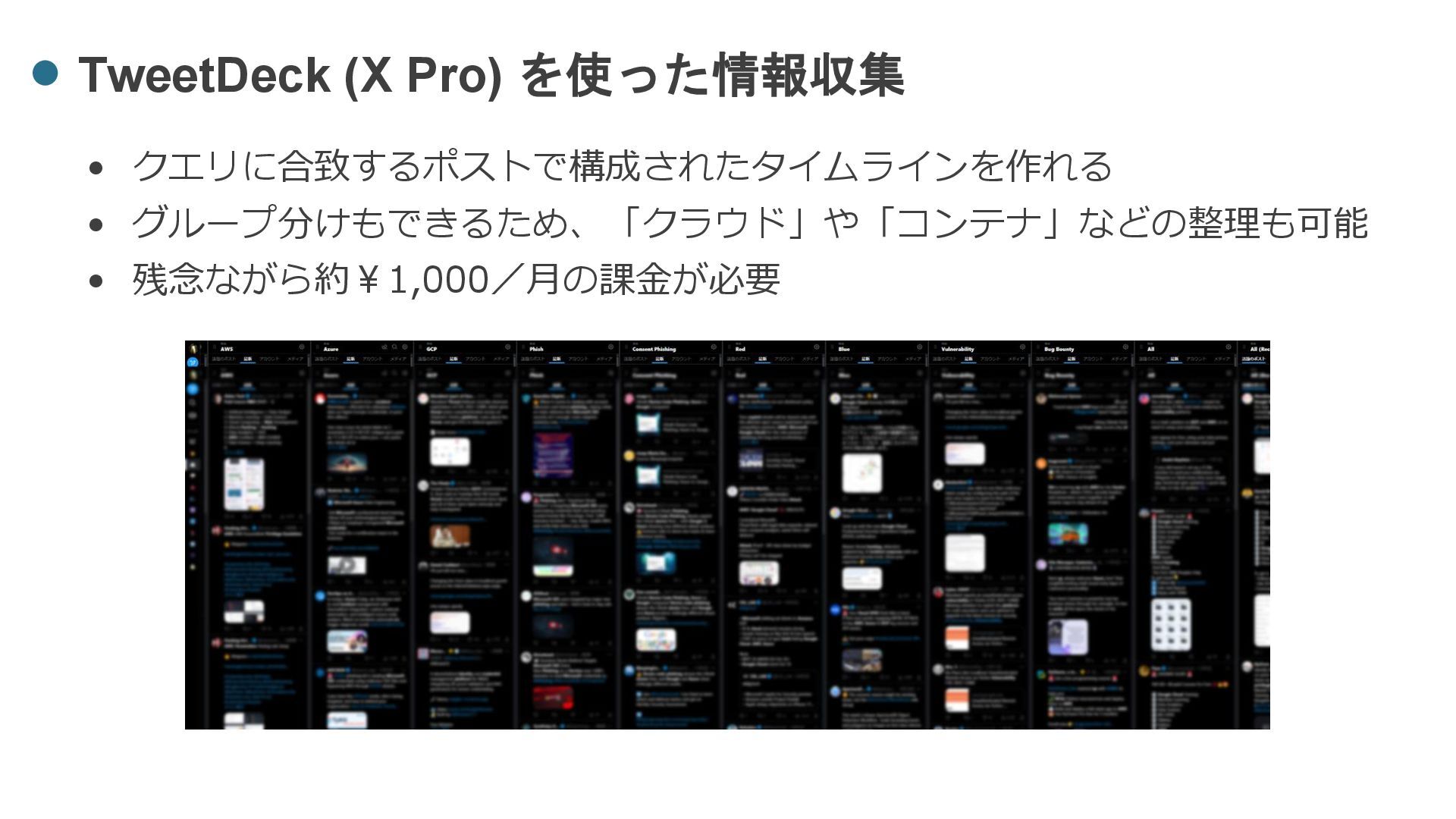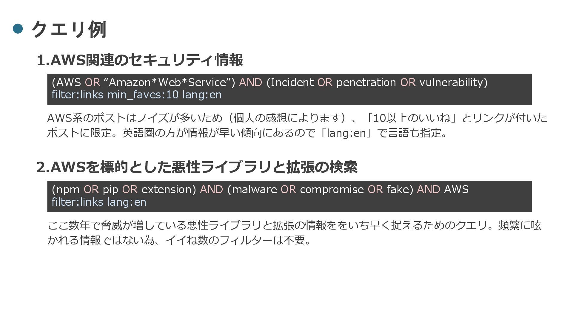 OR vulnerability) filter:links min_faves:10 lang:en AWS系のポストはノイズが多いため(個人の感想によります)、「10以上のいいね」とリンクが付いた ポストに限定。英語圏の方が情報が早い傾向にあるので「lang:en」で言語も指定。 2.AWSを標的とした悪性ライブラリと拡張の検索 (npm OR pip OR extension) AND (malware OR compromise OR fake) AND AWS filter:links lang:en ここ数年で脅威が増している悪性ライブラリと拡張の情報ををいち早く捉えるためのクエリ。頻繁に呟 かれる情報ではない為、イイね数のフィルターは不要。