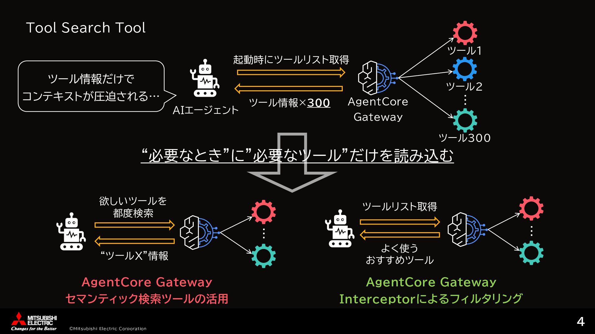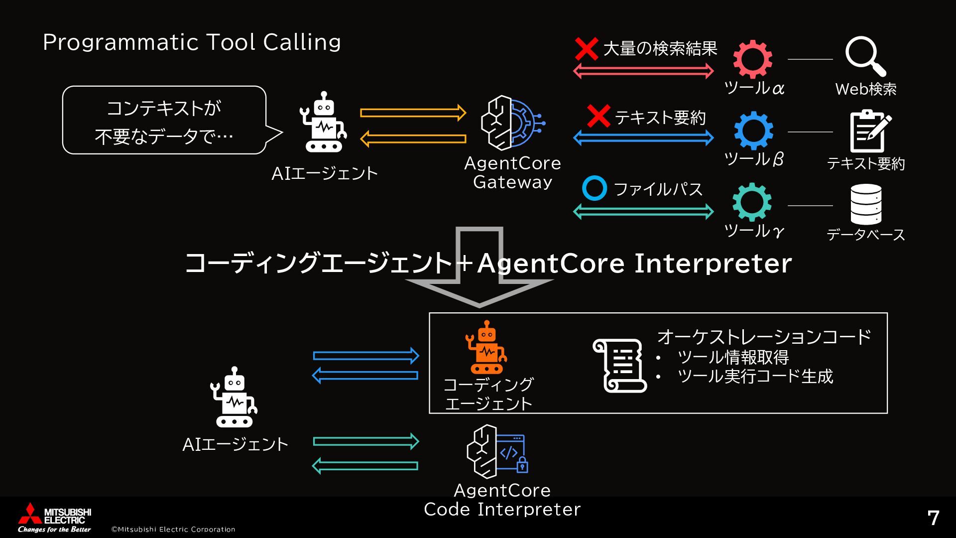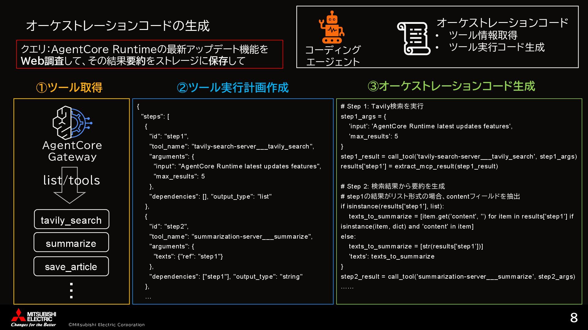 [ { "id": "step1", "tool_name": "tavily-search-server___tavily_search", "arguments": { "input": "AgentCore Runtime latest updates features", "max_results": 5 }, "dependencies": [], "output_type": "list" }, { "id": "step2", "tool_name": "summarization-server___summarize", "arguments": { "texts": {"ref": "step1"} }, "dependencies": ["step1"], "output_type": "string" }, … ②ツール実行計画作成 # Step 1: Tavily検索を実行 step1_args = { 'input': 'AgentCore Runtime latest updates features', 'max_results': 5 } step1_result = call_tool('tavily-search-server___tavily_search', step1_args) results['step1'] = extract_mcp_result(step1_result) # Step 2: 検索結果から要約を生成 # step1の結果がリスト形式の場合、contentフィールドを抽出 if isinstance(results['step1'], list): texts_to_summarize = [item.get('content', '') for item in results['step1'] if isinstance(item, dict) and 'content' in item] else: texts_to_summarize = [str(results['step1’])] 'texts': texts_to_summarize } step2_result = call_tool('summarization-server___summarize', step2_args) …… ③オーケストレーションコード生成 AgentCore Gateway ①ツール取得 tavily_search summarize save_article … list/tools コーディング エージェント オーケストレーションコード • ツール情報取得 • ツール実行コード生成