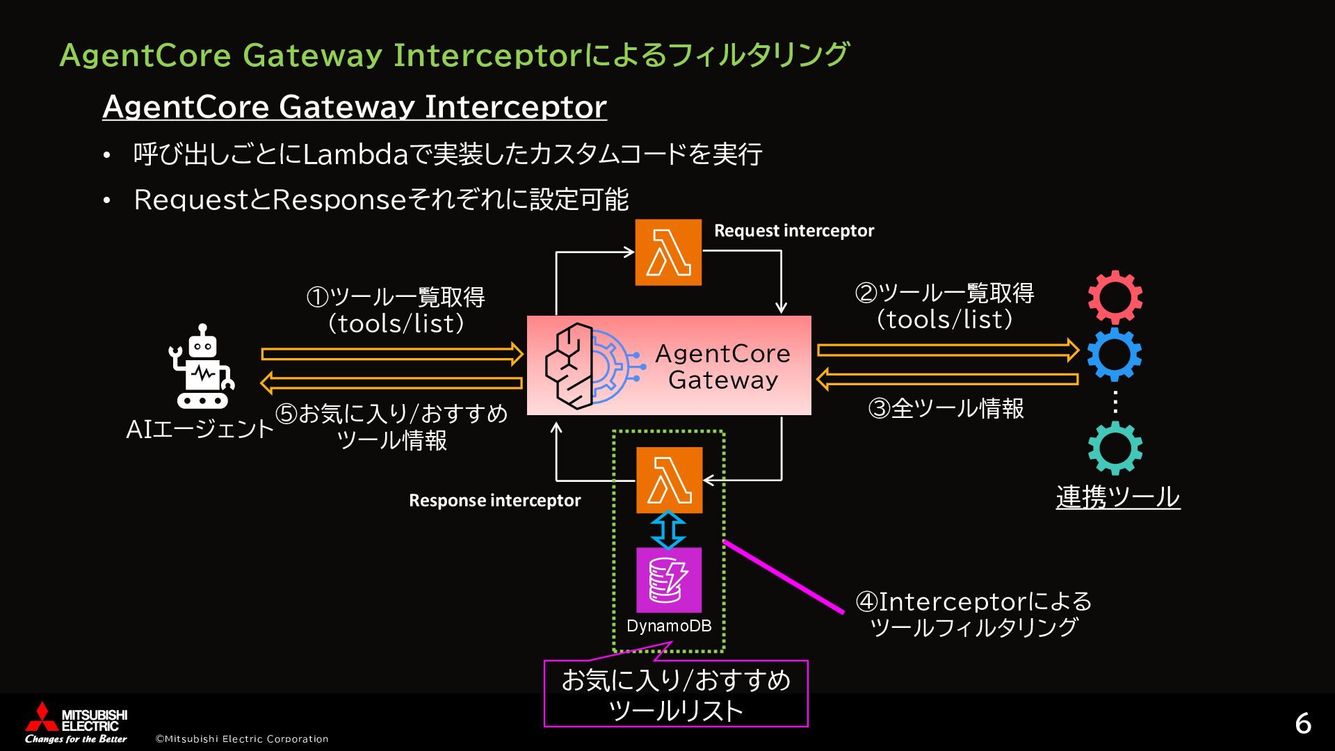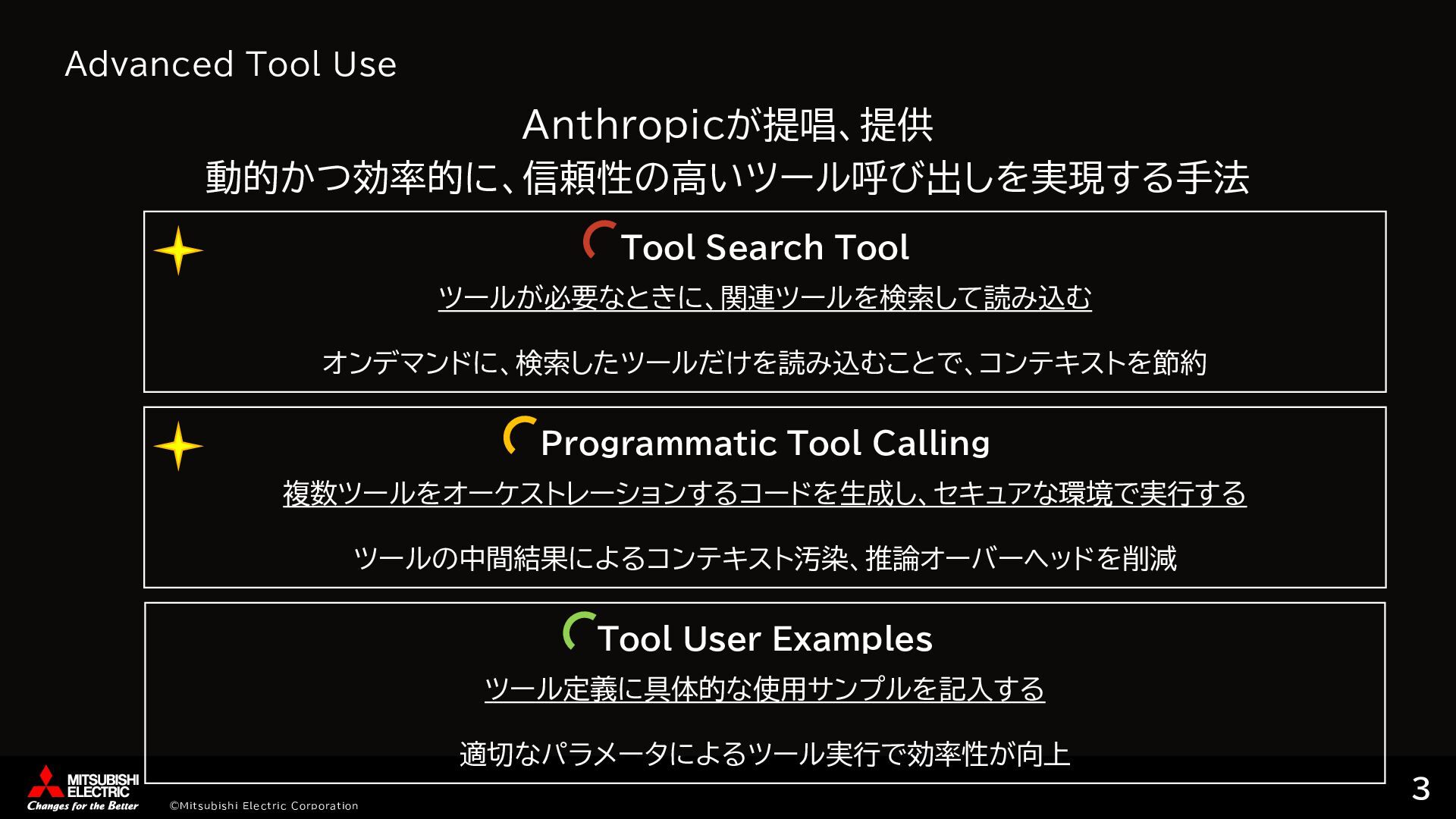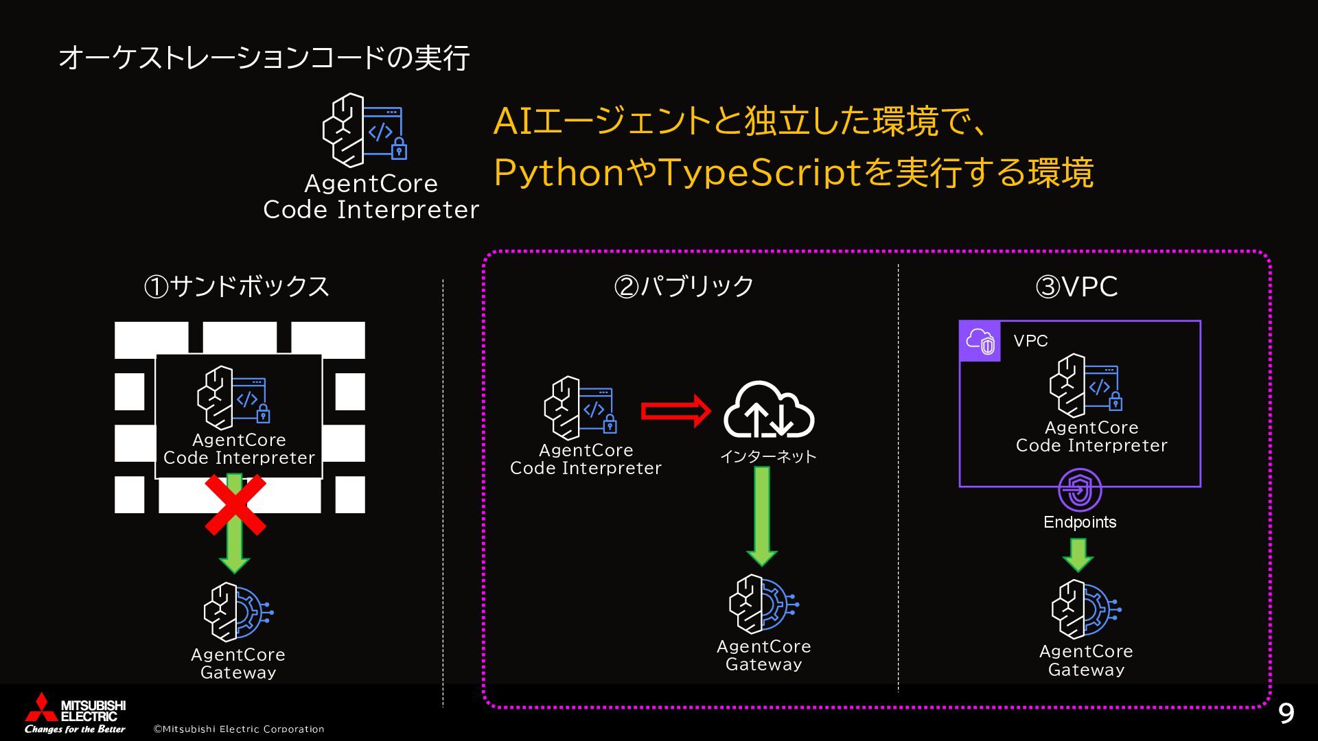 [ { "id": "step1", "tool_name": "tavily-search-server___tavily_search", "arguments": { "input": "AgentCore Runtime latest updates features", "max_results": 5 }, "dependencies": [], "output_type": "list" }, { "id": "step2", "tool_name": "summarization-server___summarize", "arguments": { "texts": {"ref": "step1"} }, "dependencies": ["step1"], "output_type": "string" }, … ②ツール実行計画作成 # Step 1: Tavily検索を実行 step1_args = { 'input': 'AgentCore Runtime latest updates features', 'max_results': 5 } step1_result = call_tool('tavily-search-server___tavily_search', step1_args) results['step1'] = extract_mcp_result(step1_result) # Step 2: 検索結果から要約を生成 # step1の結果がリスト形式の場合、contentフィールドを抽出 if isinstance(results['step1'], list): texts_to_summarize = [item.get('content', '') for item in results['step1'] if isinstance(item, dict) and 'content' in item] else: texts_to_summarize = [str(results['step1’])] 'texts': texts_to_summarize } step2_result = call_tool('summarization-server___summarize', step2_args) …… ③オーケストレーションコード生成 AgentCore Gateway ①ツール取得 tavily_search summarize save_article … list/tools コーディング エージェント オーケストレーションコード • ツール情報取得 • ツール実行コード生成