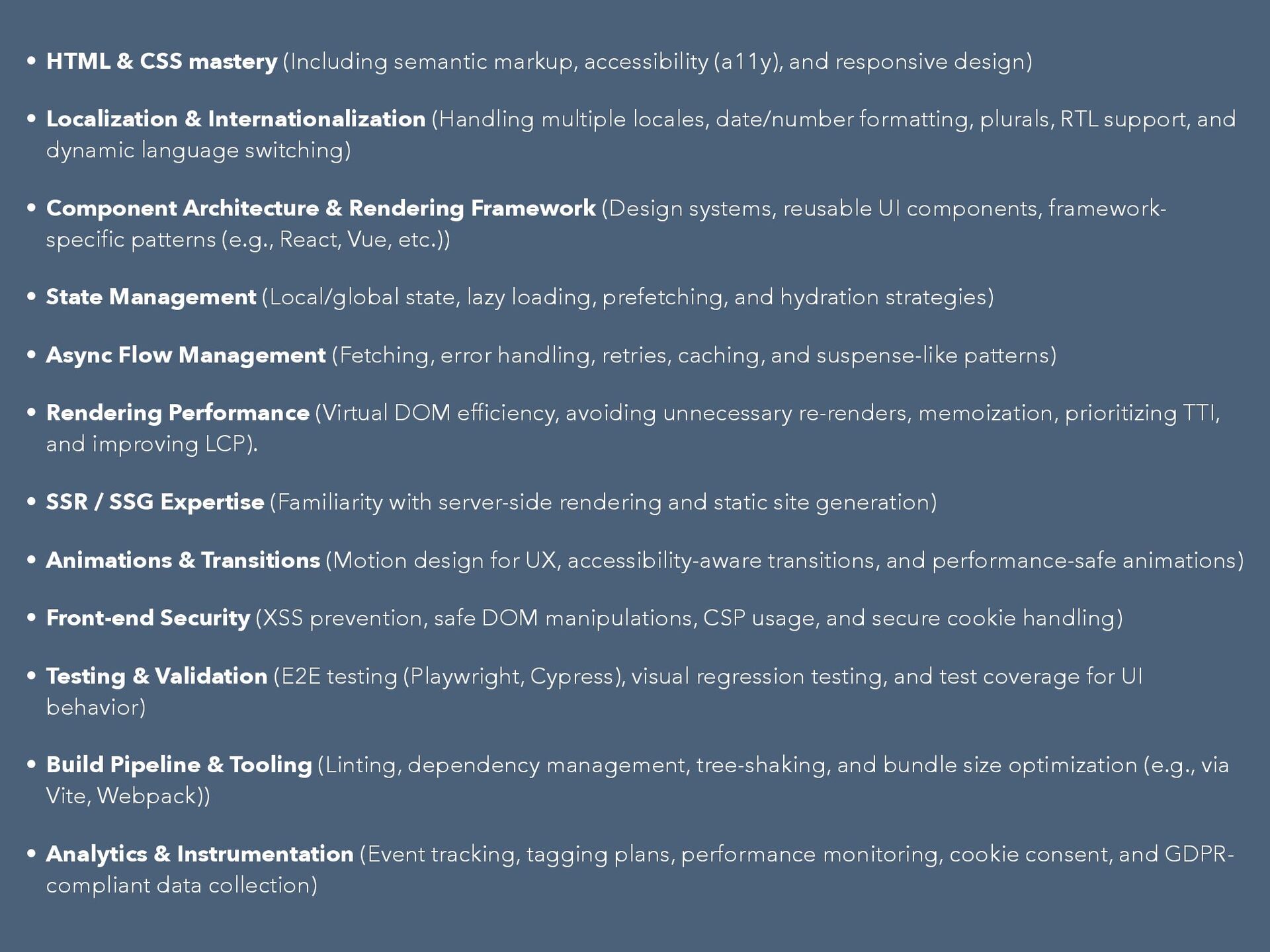 and responsive design) • Localization & Internationalization (Handling multiple locales, date/number formatting, plurals, RTL support, and dynamic language switching) • Component Architecture & Rendering Framework (Design systems, reusable UI components, framework- speci fi c patterns (e.g., React, Vue, etc.)) • State Management (Local/global state, lazy loading, prefetching, and hydration strategies) • Async Flow Management (Fetching, error handling, retries, caching, and suspense-like patterns) • Rendering Performance (Virtual DOM ef fi ciency, avoiding unnecessary re-renders, memoization, prioritizing TTI, and improving LCP). • SSR / SSG Expertise (Familiarity with server-side rendering and static site generation) • Animations & Transitions (Motion design for UX, accessibility-aware transitions, and performance-safe animations) • Front-end Security (XSS prevention, safe DOM manipulations, CSP usage, and secure cookie handling) • Testing & Validation (E2E testing (Playwright, Cypress), visual regression testing, and test coverage for UI behavior) • Build Pipeline & Tooling (Linting, dependency management, tree-shaking, and bundle size optimization (e.g., via Vite, Webpack)) • Analytics & Instrumentation (Event tracking, tagging plans, performance monitoring, cookie consent, and GDPR- compliant data collection)