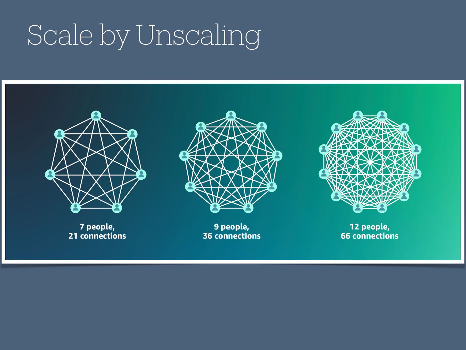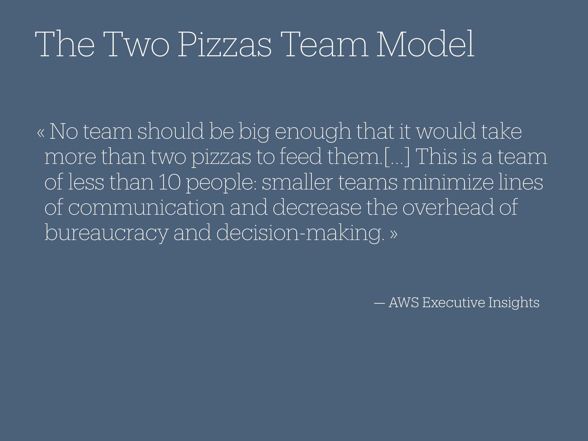 enough that it would take more than two pizzas to feed them.[…] This is a team of less than 10 people: smaller teams minimize lines of communication and decrease the overhead of bureaucracy and decision-making. » The Two Pizzas Team Model
