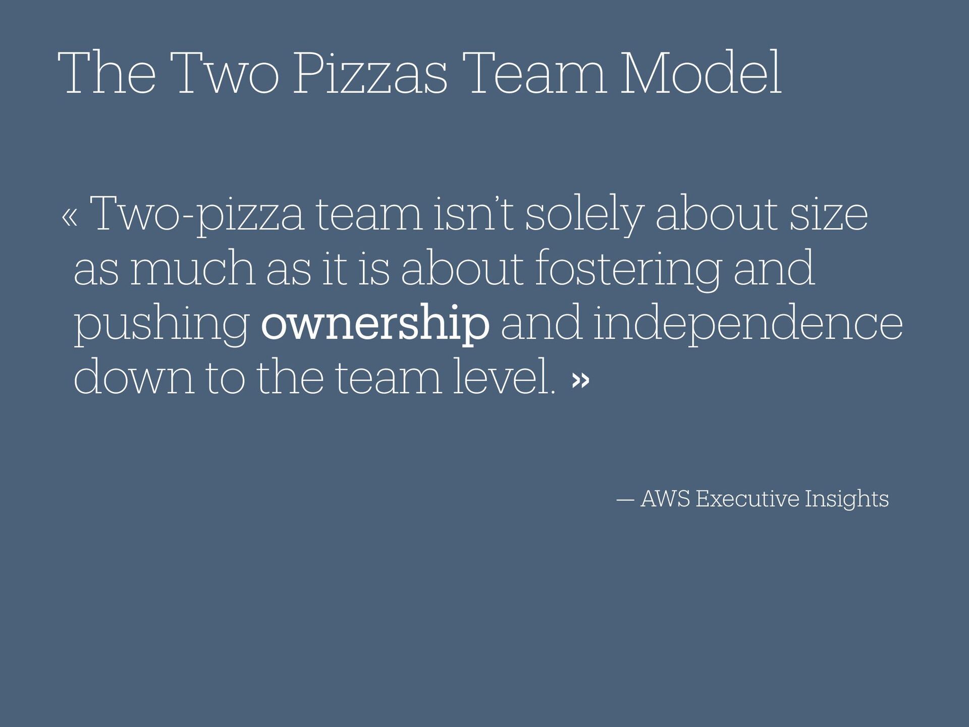 size as much as it is about fostering and pushing ownership and independence down to the team level. » The Two Pizzas Team Model