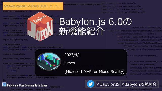 o UnityとVRを中⼼に活動。2018年頃から Babylon.jsを知って情報発信を継続。最近は Babylon.js+WebXR関連で活動中 o Babylon.js勉強会の共同主催者 o 2児の⽗で休⽇は公園や図書館に⾏くことが 多い o Blog : Cross Road https://www.crossroad-tech.com/ Development Technologies (Unity) : 2016/10-2018/7 Windows Development (Windows Mixed Reality) : 2018/7-2022/8 Mixed Reality (MR Development) : 2022/9-