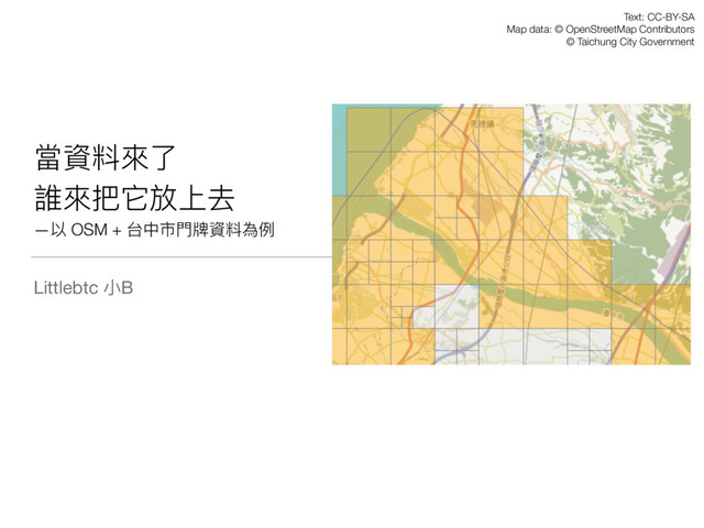 當資料來來了了 誰來來把它放上去 —以 OSM + 台中市⾨門牌資料為例例 Littlebtc ⼩小B Text: CC-BY-SA
