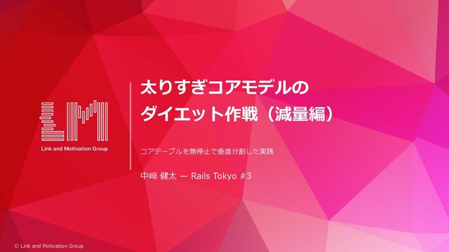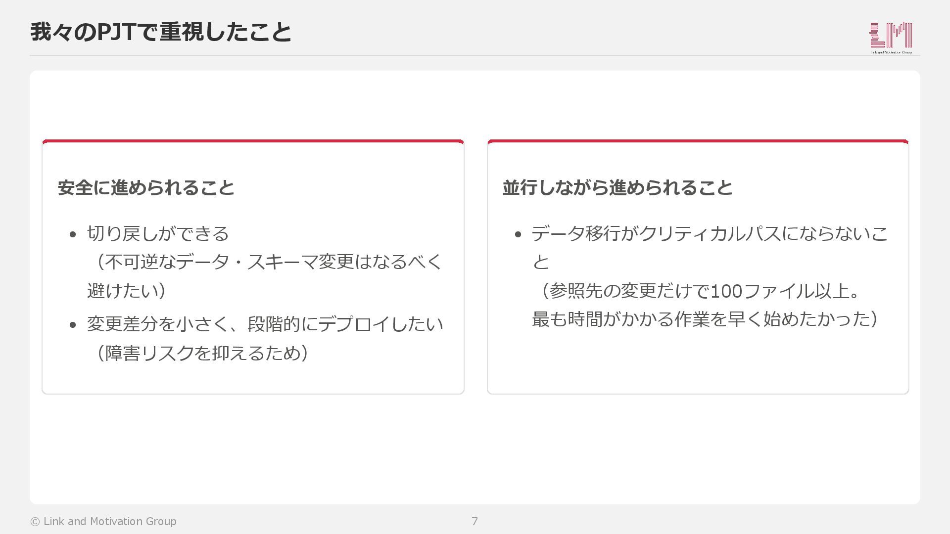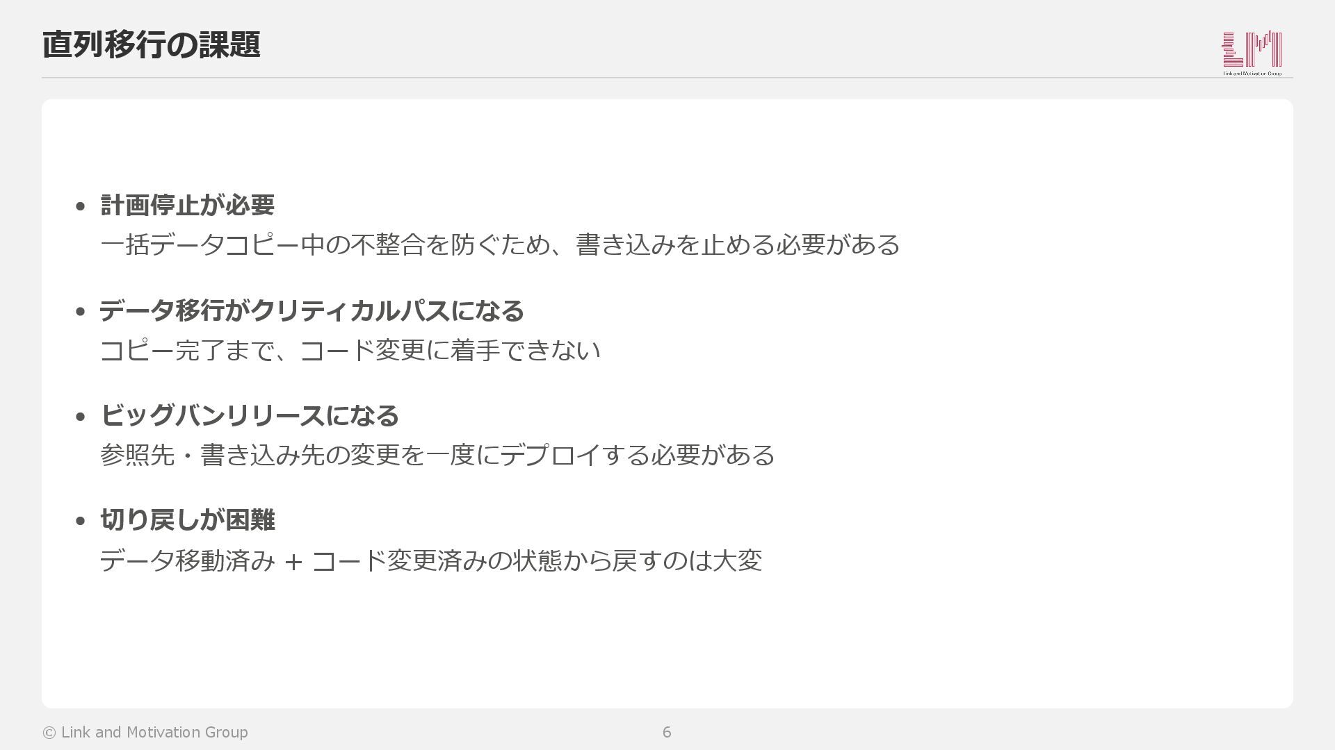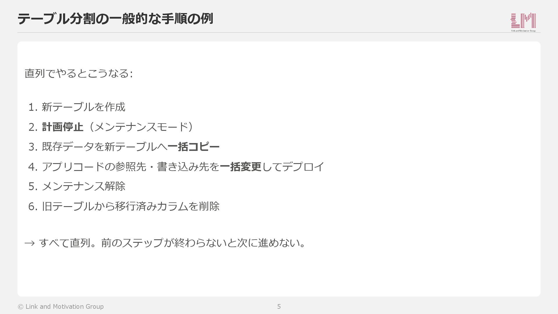 5. メンテナンス解除 6. 旧テーブルから移行済みカラムを削除 → すべて直列。前のステップが終わらないと次に進めない。 © Link and Motivation Group 5