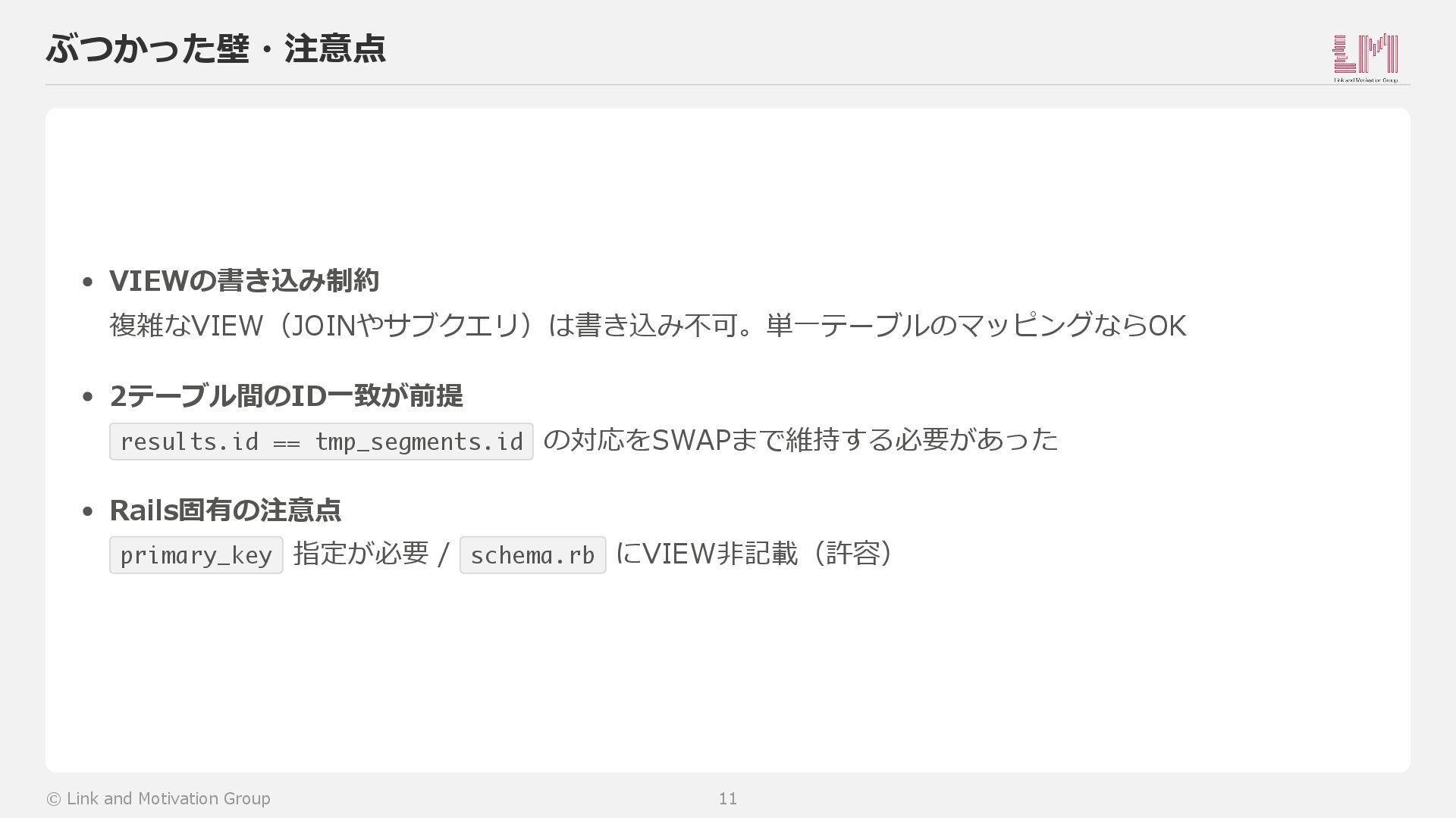 App write results sync tmp_segments (TABLE) RENAME TABLE で⼊れ替え segments (VIEW) ↔ tmp_segments (TABLE) After SWAP App read (集計軸) segments (TABLE に昇格) App write results sync アプリコードの変更なし © Link and Motivation Group 10