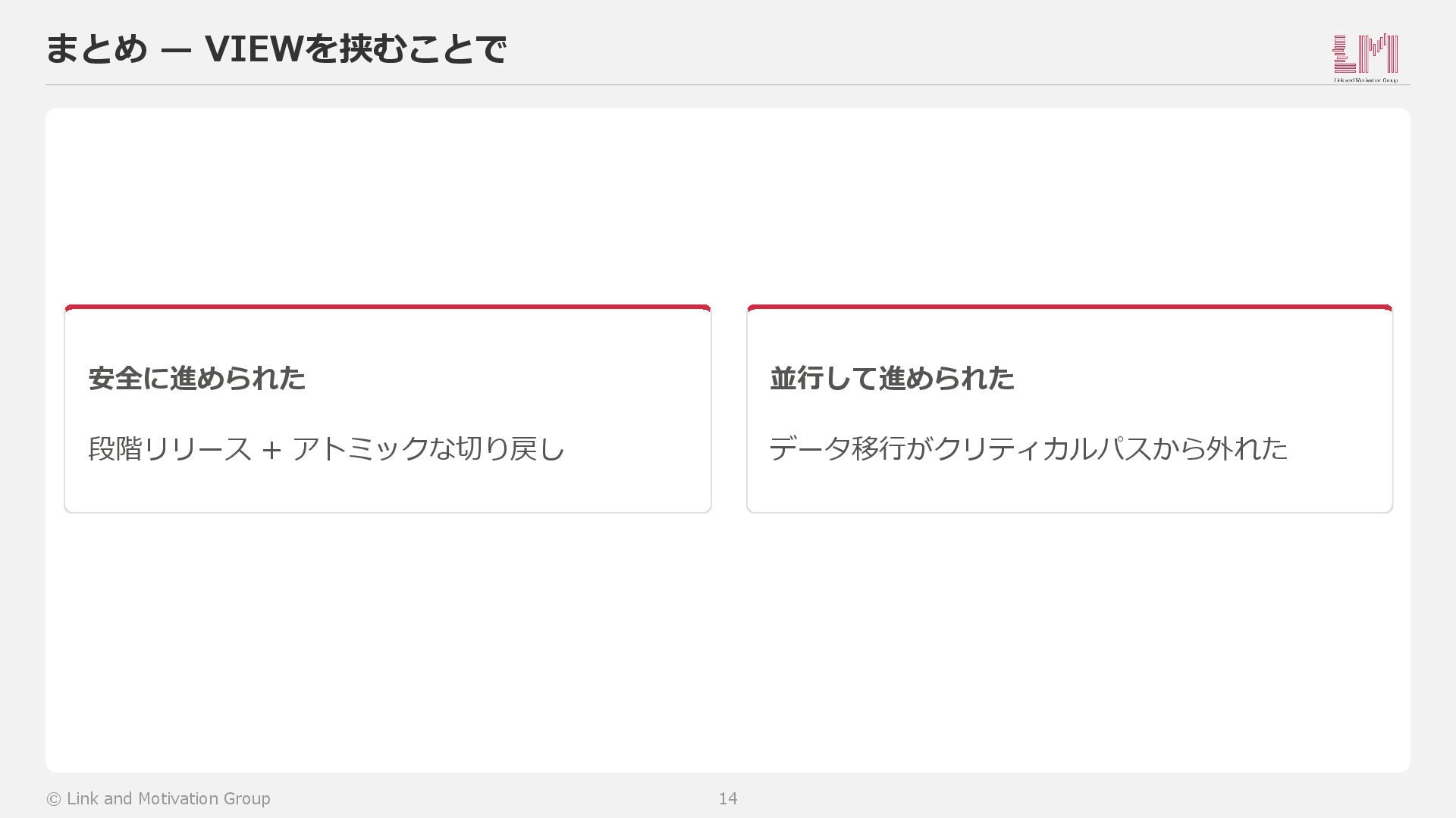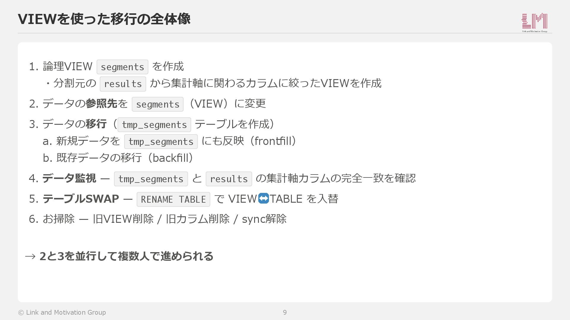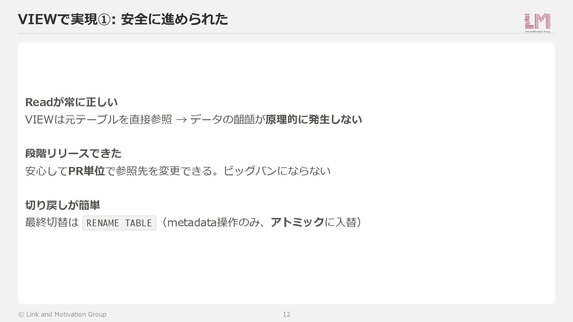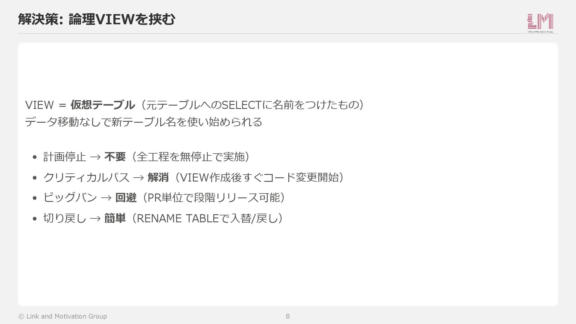 → 解消(VIEW作成後すぐコード変更開始) ビッグバン → 回避(PR単位で段階リリース可能) 切り戻し → 簡単(RENAME TABLEで入替/戻し) © Link and Motivation Group 8