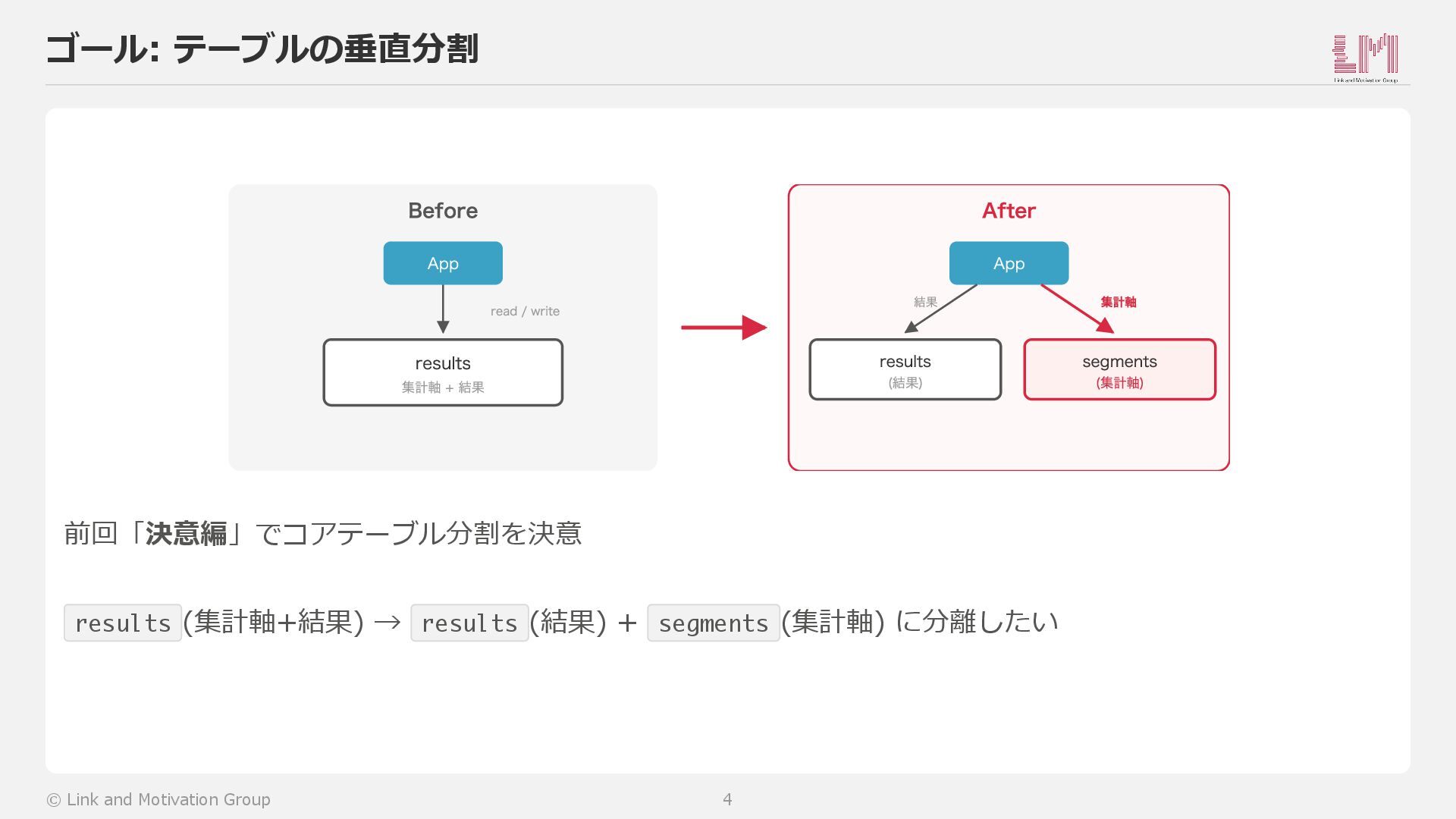 結果 After App 結果 集計軸 results (結果) segments (集計軸) 前回「決意編」でコアテーブル分割を決意 results (集計軸+結果) → results (結果) + segments (集計軸) に分離したい © Link and Motivation Group 4