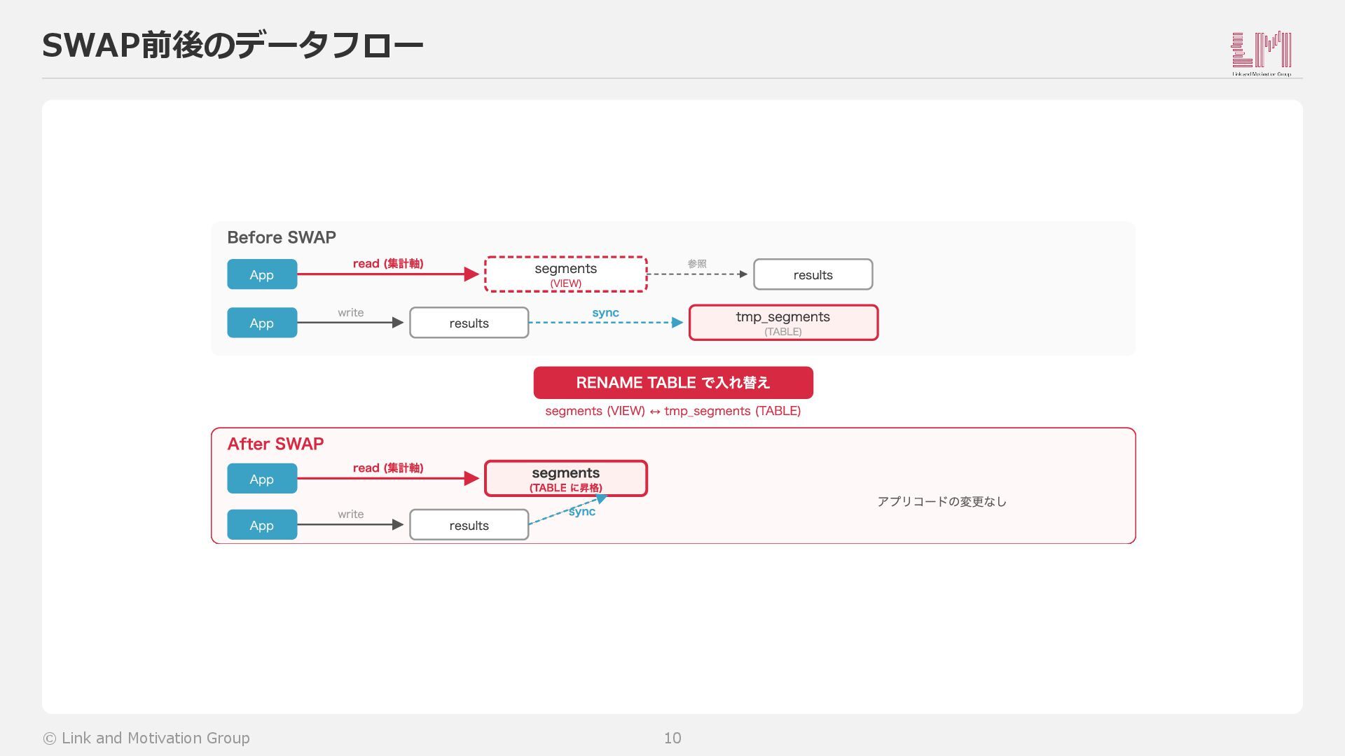 segments (VIEW)に変更 3. データの移行( tmp_segments テーブルを作成) a. 新規データを tmp_segments にも反映(frontfill) b. 既存データの移行(backfill) 4. データ監視 — tmp_segments と results の集計軸カラムの完全一致を確認 5. テーブルSWAP — RENAME TABLE で VIEW TABLE を入替 6. お掃除 — 旧VIEW削除 / 旧カラム削除 / sync解除 → 2と3を並行して複数人で進められる © Link and Motivation Group 9