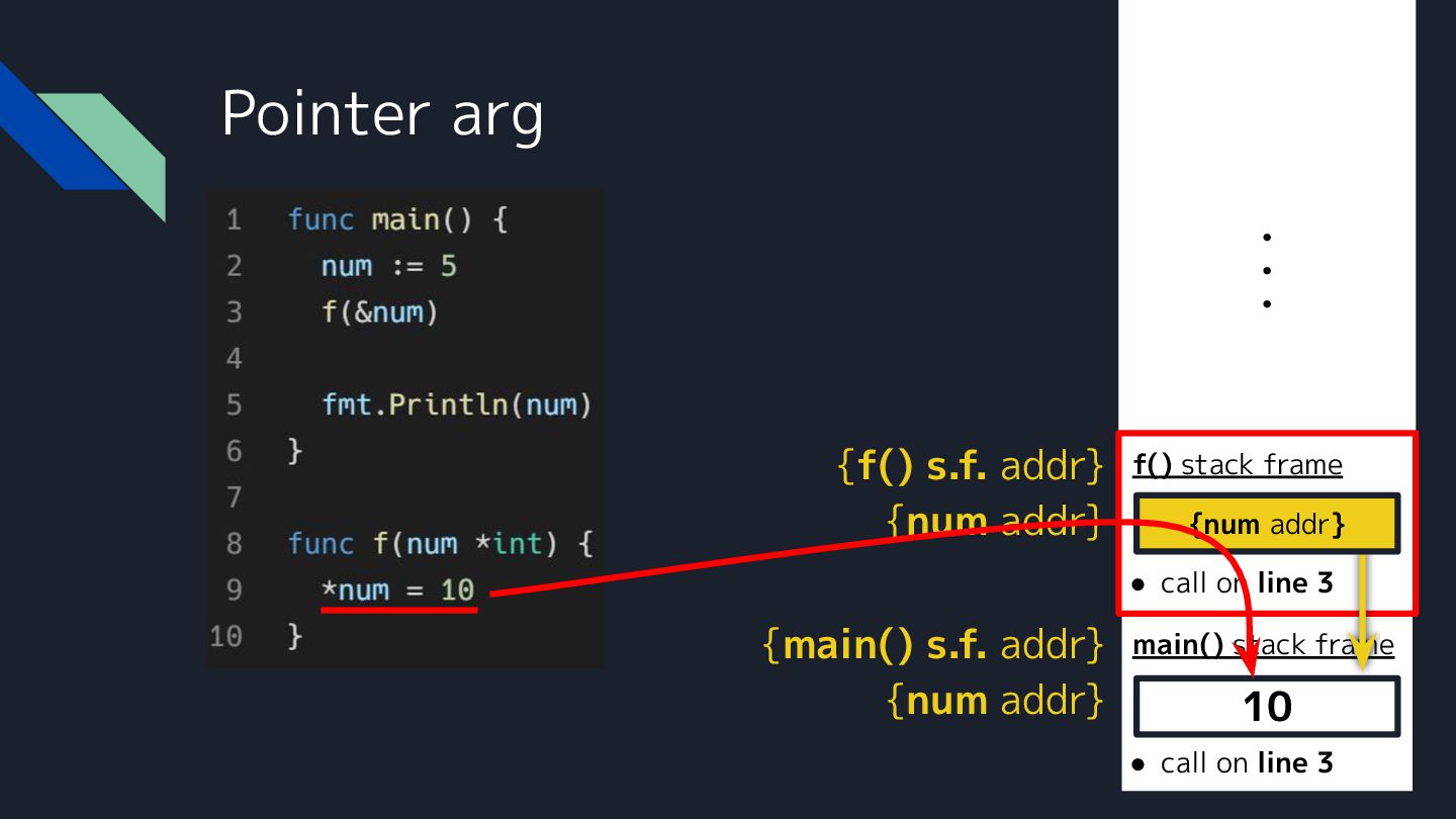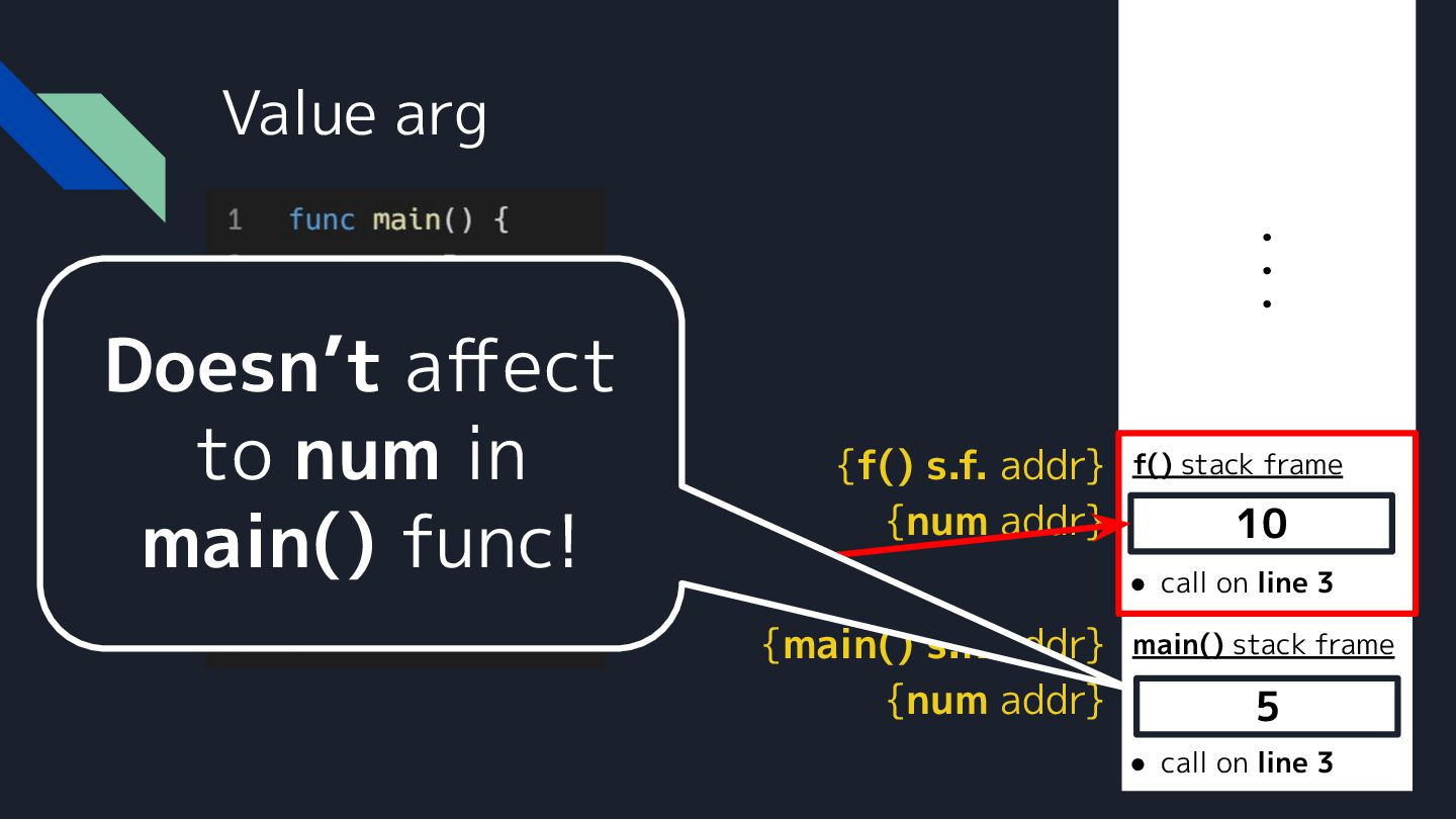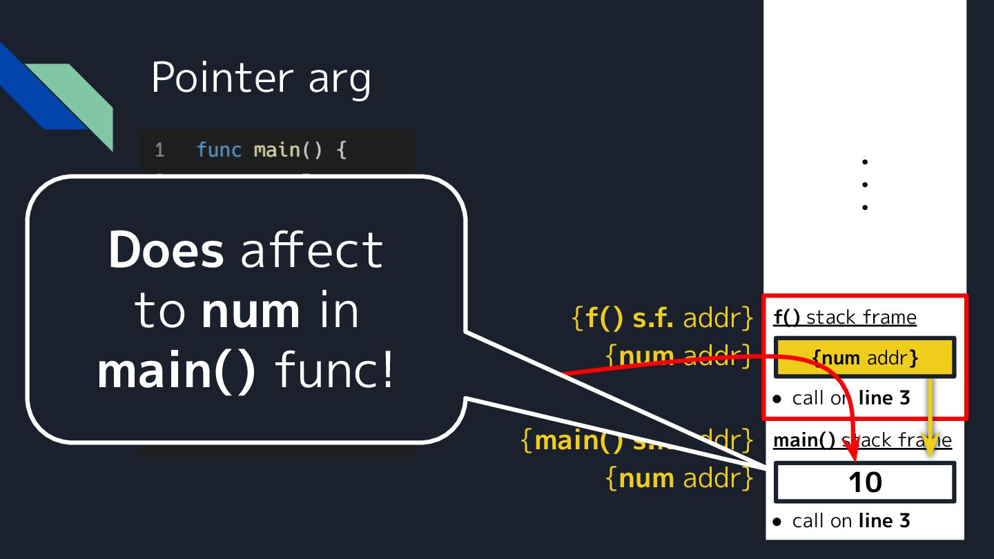 addr} {num addr} main() stack frame • call on line 3 10 f() stack frame • call on line 3 Pointer arg {num addr} Does affect to num in main() func!