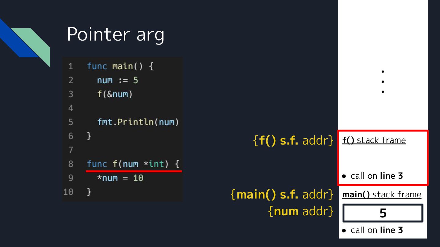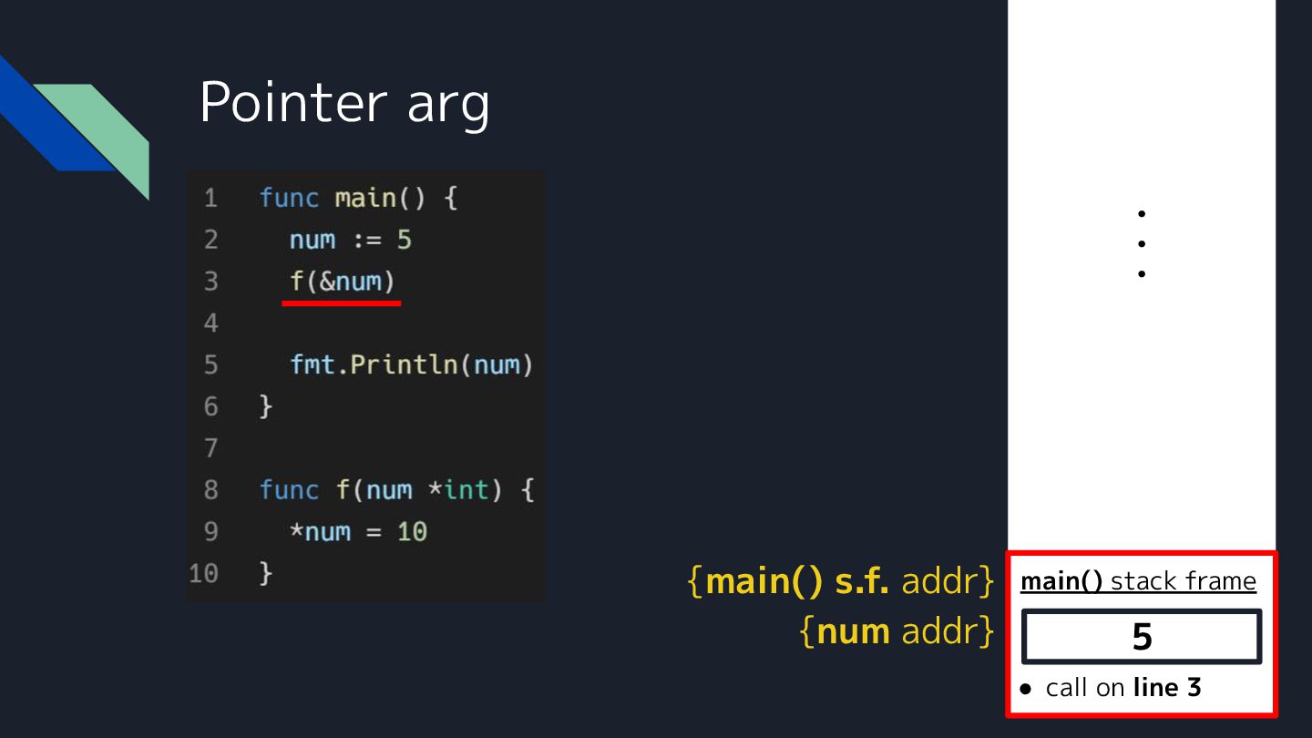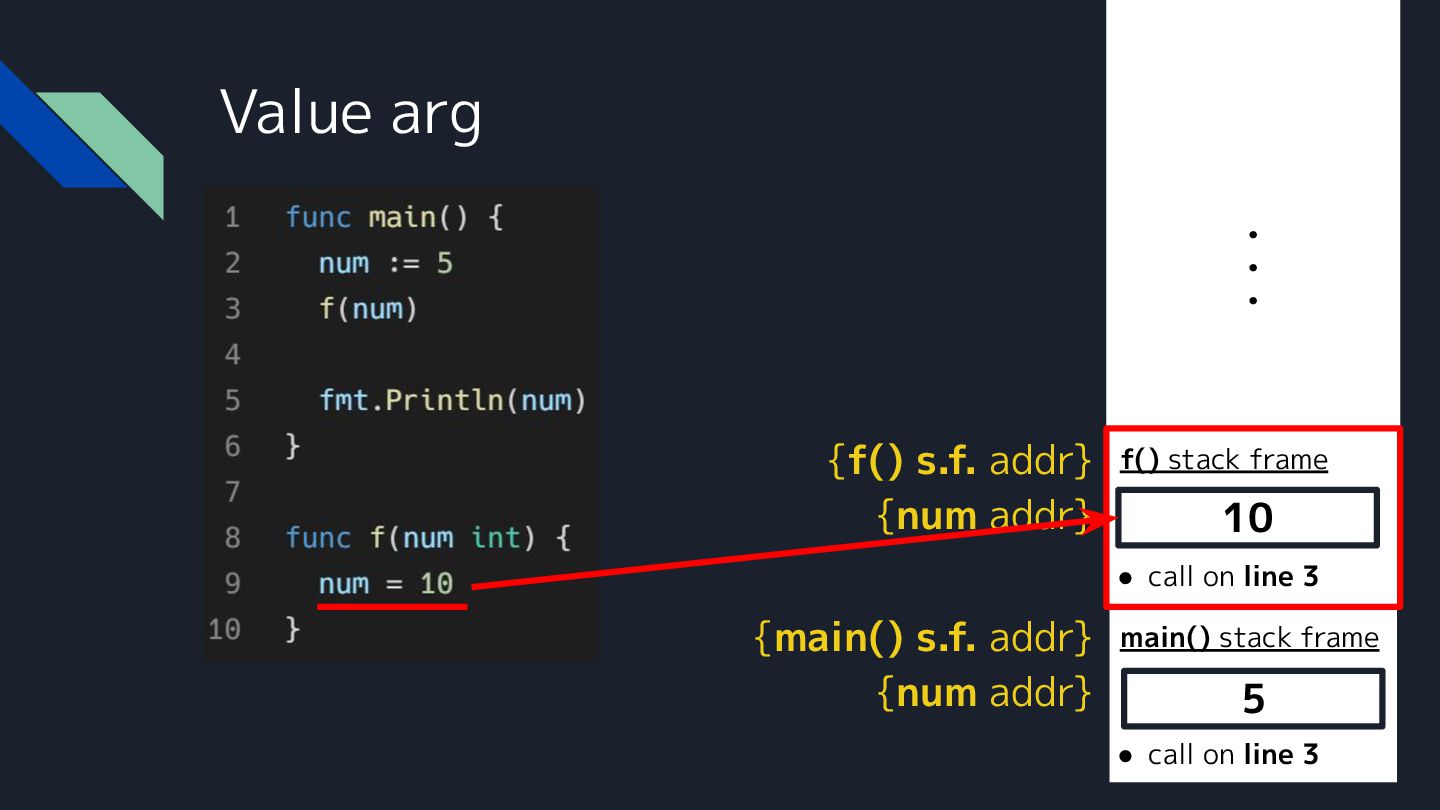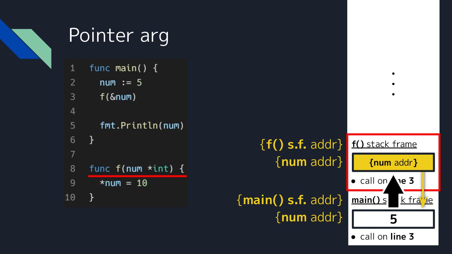 addr} {num addr} main() stack frame • call on line 3 10 f() stack frame • call on line 3 Pointer arg {num addr} Does affect to num in main() func!