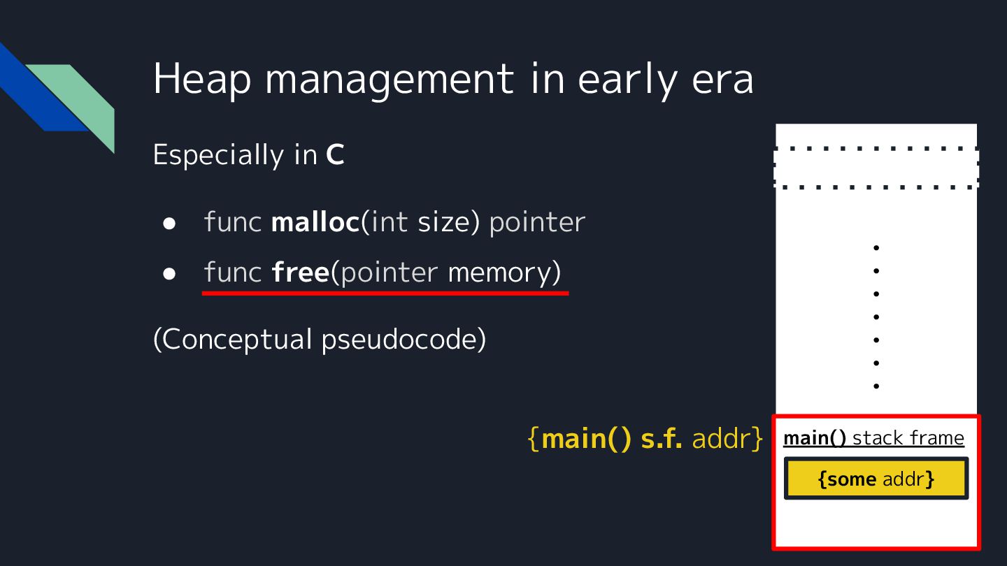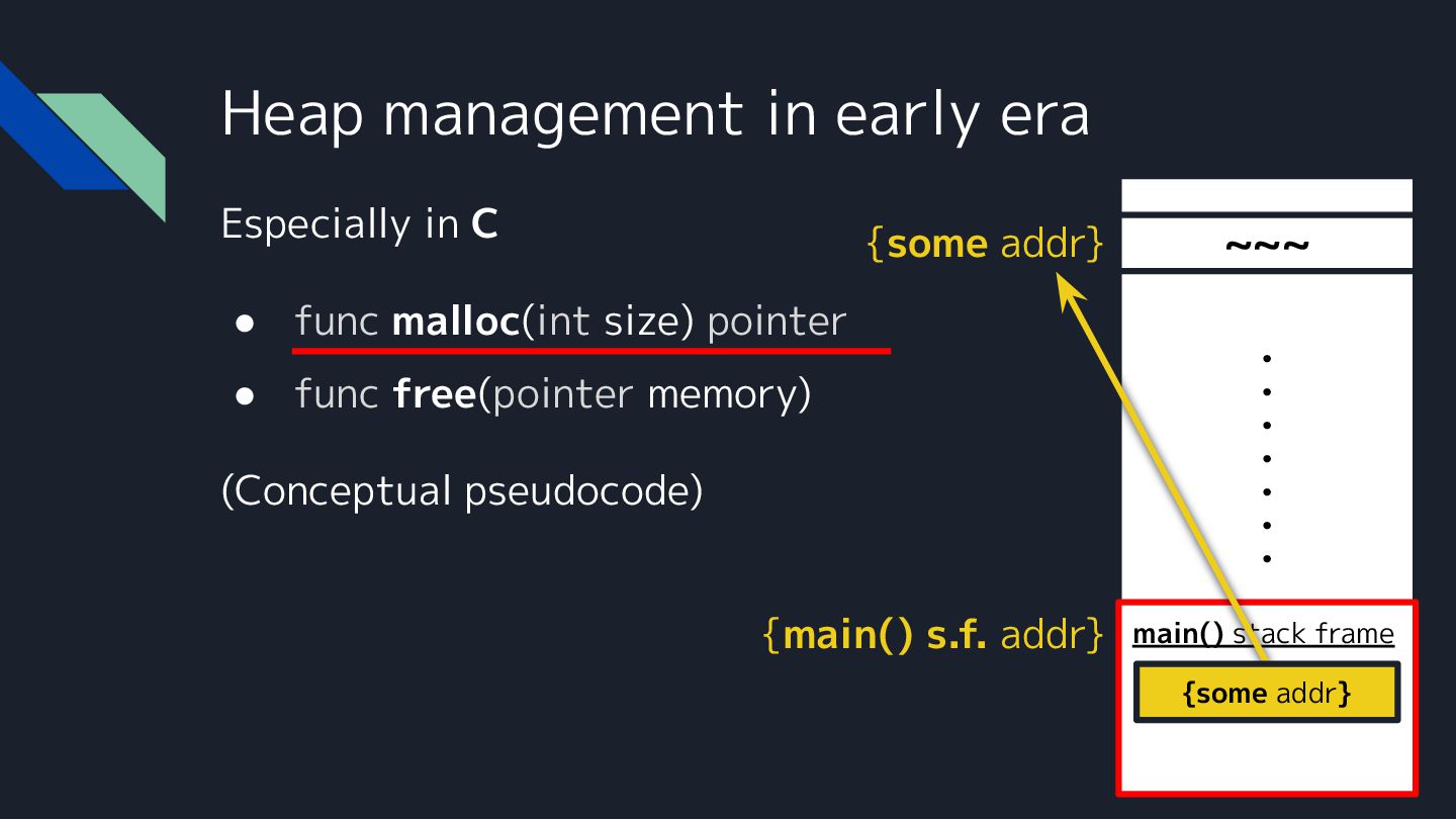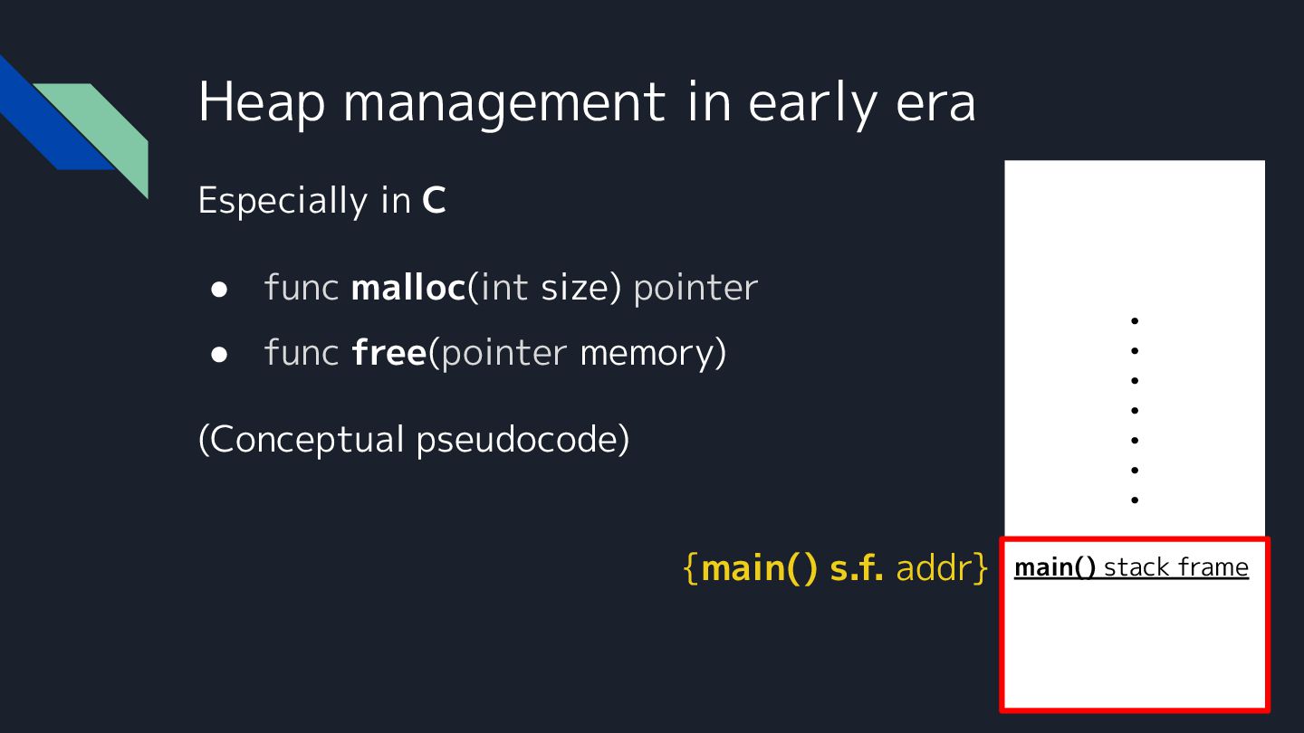 . . {main() s.f. addr} main() stack frame {some addr} Especially in C • func malloc(int size) pointer • func free(pointer memory) (Conceptual pseudocode)