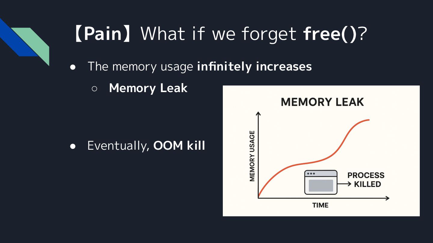 65. 【Pain】What if we forget free()? • The memory usage infinitely