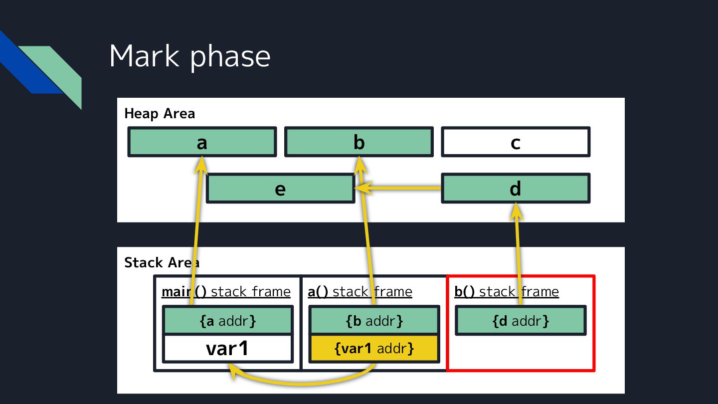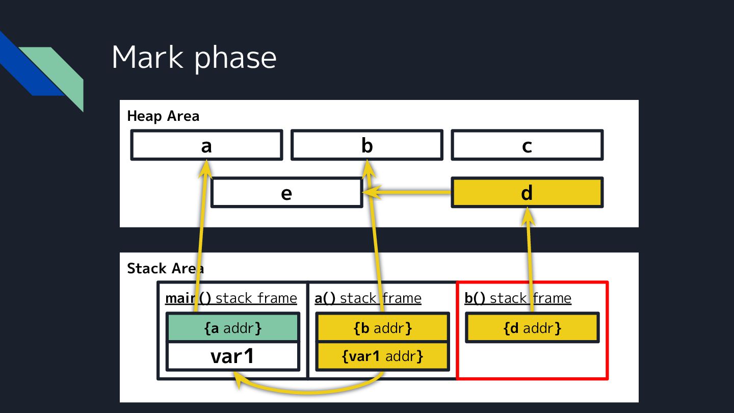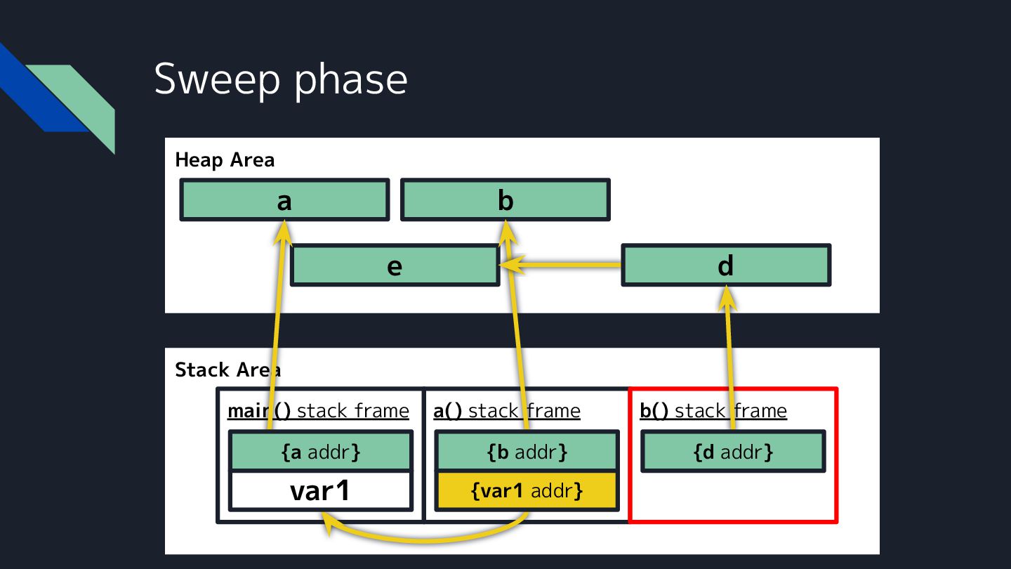 b() stack frame a b e {a addr} d {b addr} {var1 addr} var1 {d addr} Sweep phase